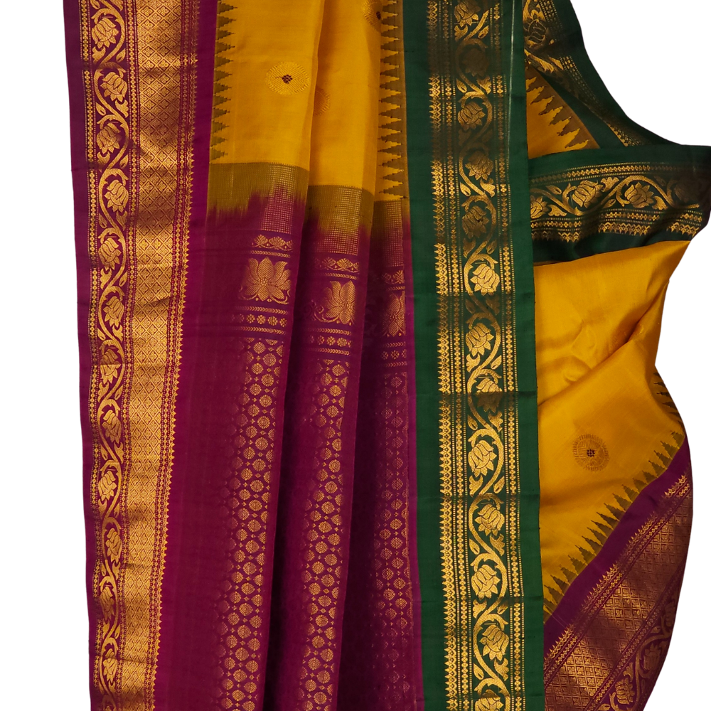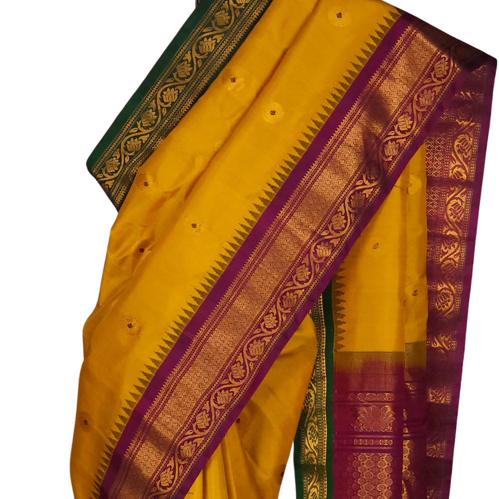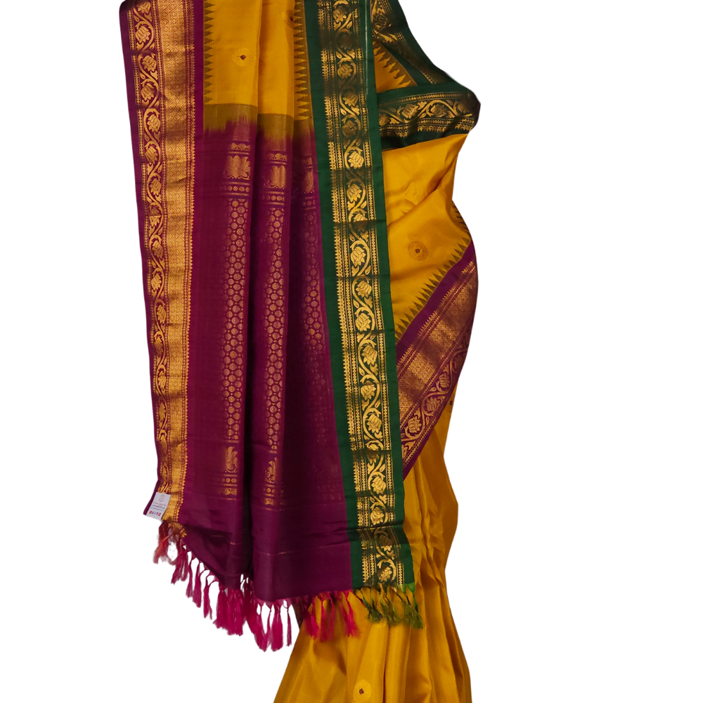 Elevate your elegance with our exquisite Handloom Gadwal Pure Silk Saree, adorned with Intricate zari motifs zari-woven borders Rich zari-woven brocade adorns the pallu, making every drape a statement.