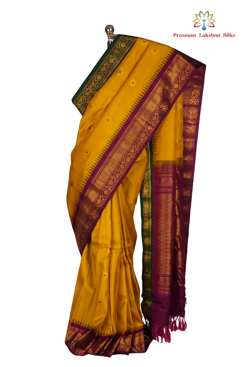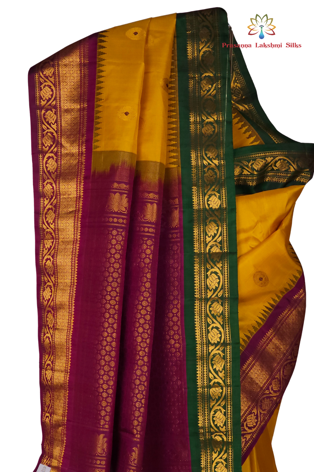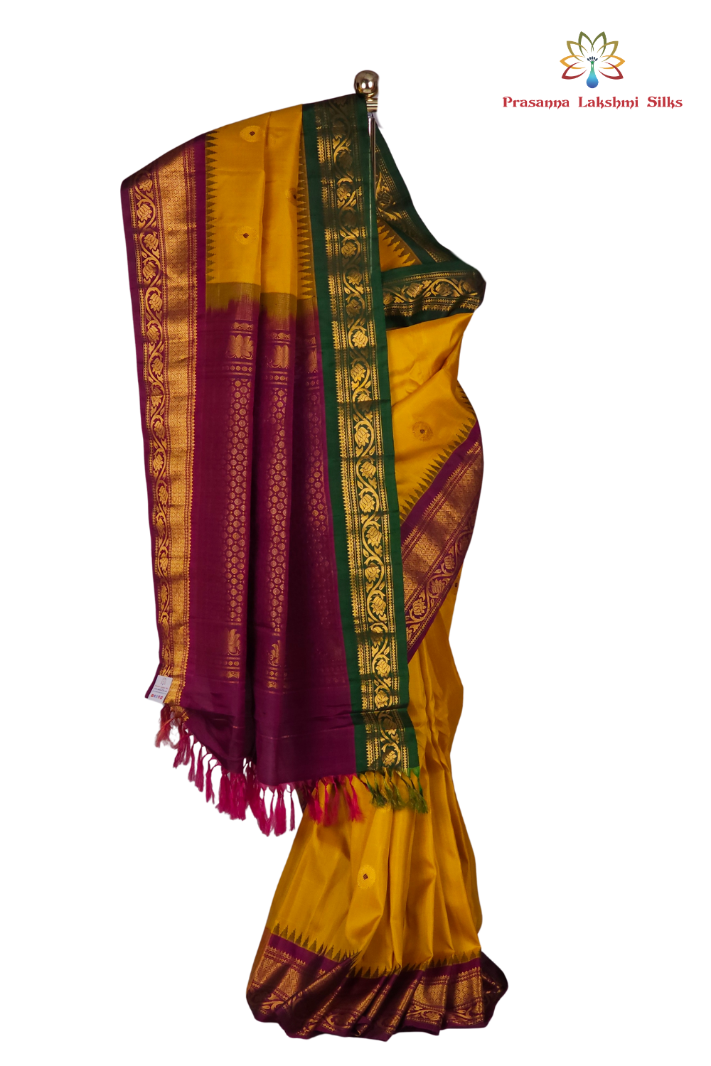 Elevate your elegance with our exquisite Handloom Gadwal Pure Silk Saree, adorned with Intricate zari motifs zari-woven borders Rich zari-woven brocade adorns the pallu, making every drape a statement.
