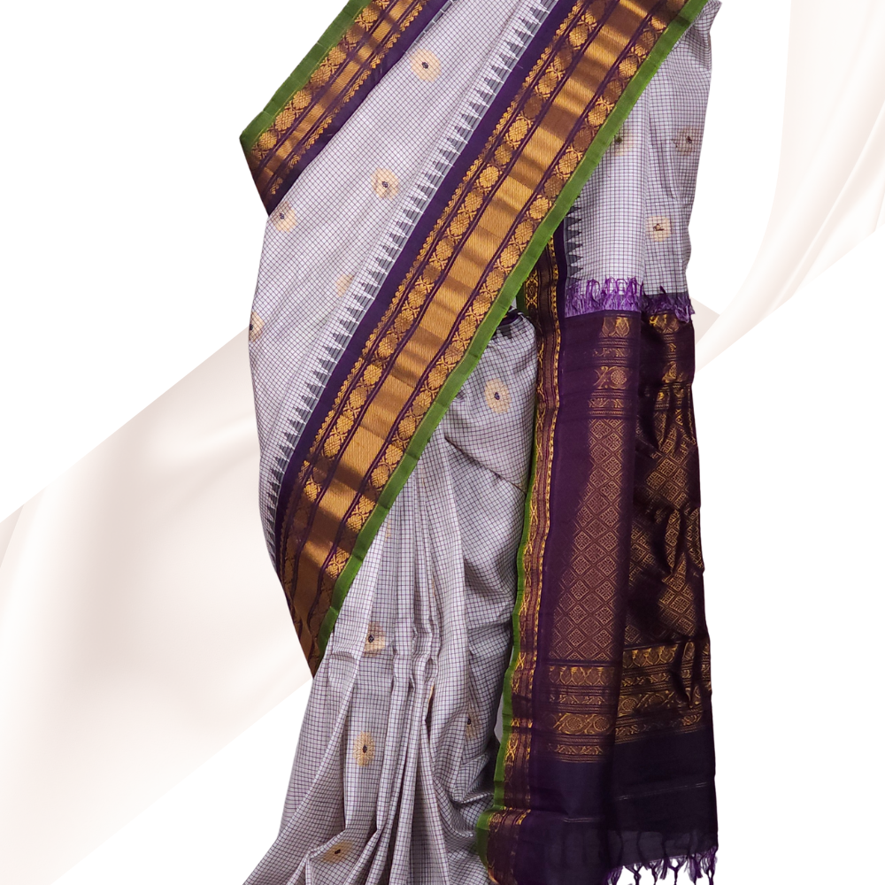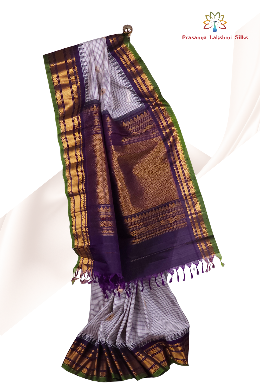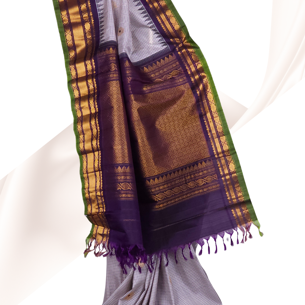 Elevate your elegance with our exquisite Handloom Gadwal Pure Silk Saree, adorned with classic checks pattern creating a timeless and elegant look with zari-woven borders and Rich zari-woven brocade that adorns the pallu, making every drape a statement.