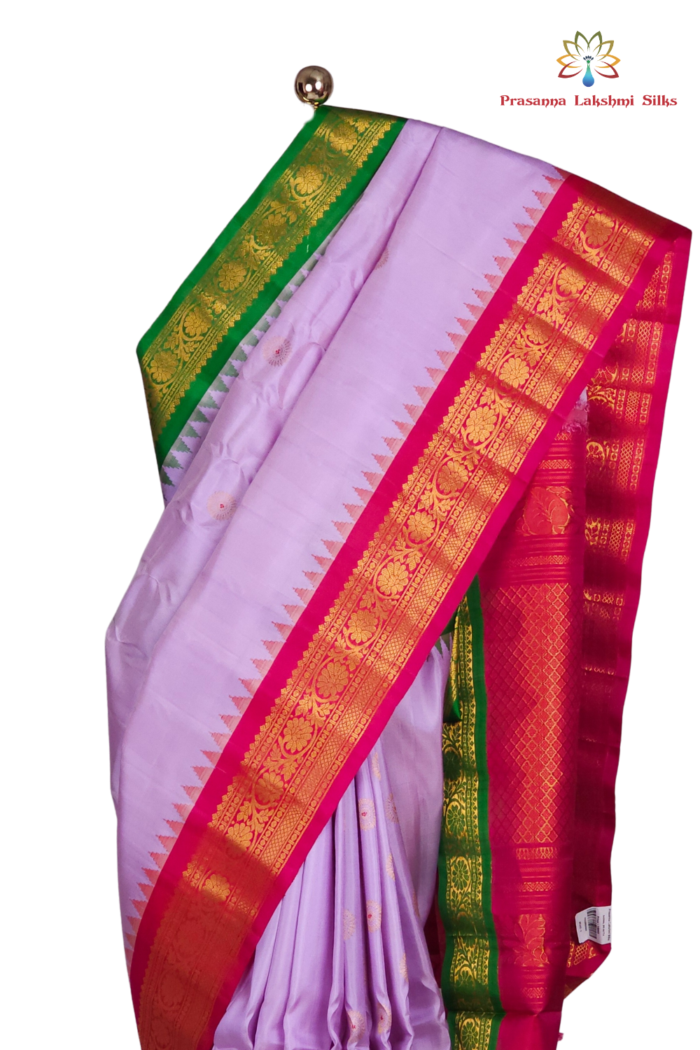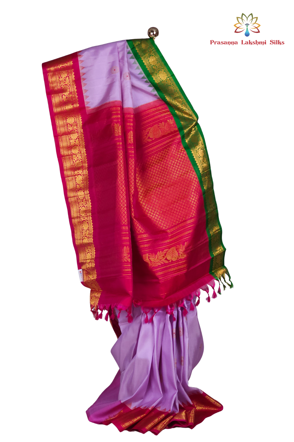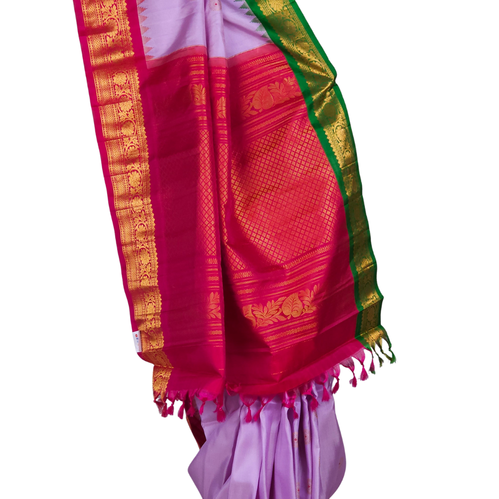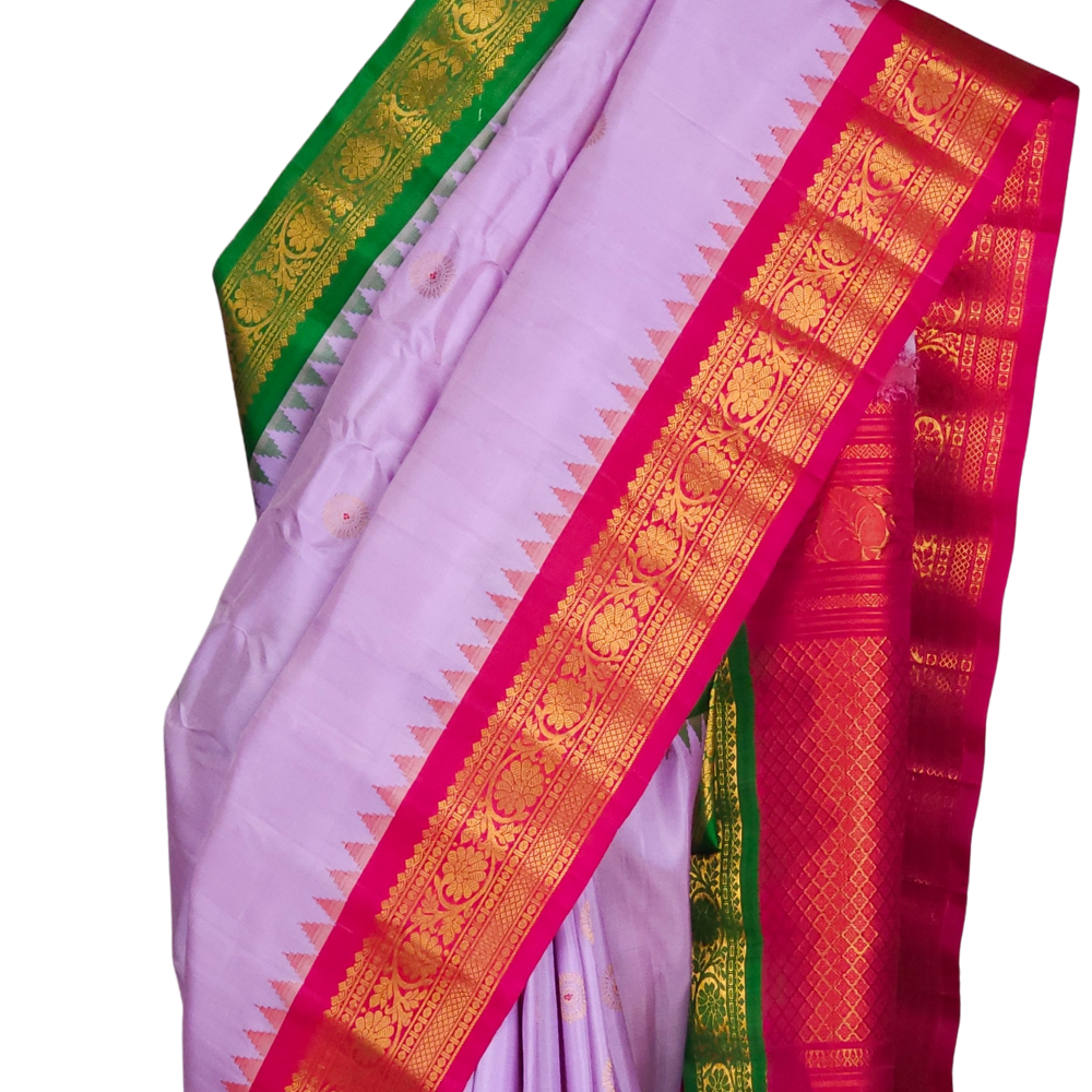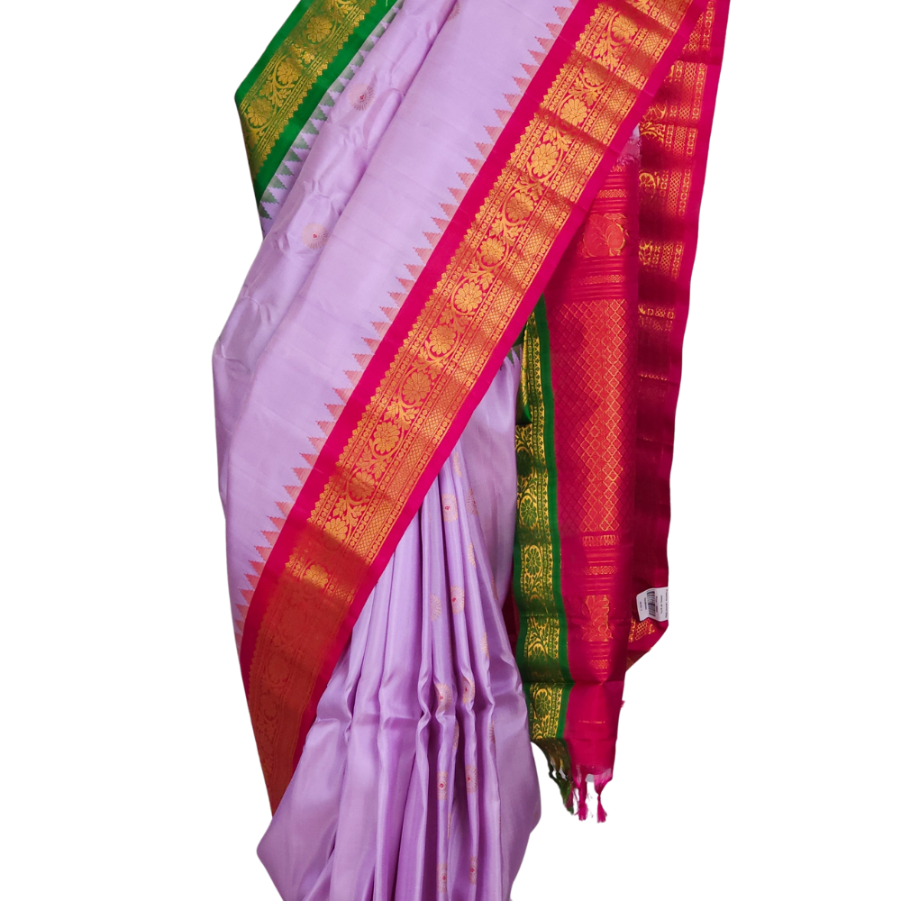 Elevate your elegance with our exquisite Handloom Gadwal Pure Silk Saree, adorned with Intricate zari motifs zari-woven borders Rich zari-woven brocade adorns the pallu, making every drape a statement.