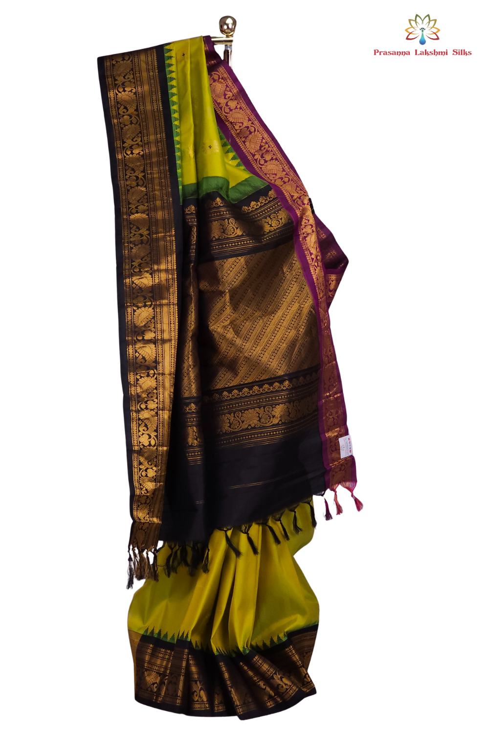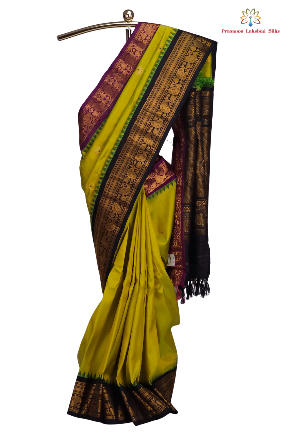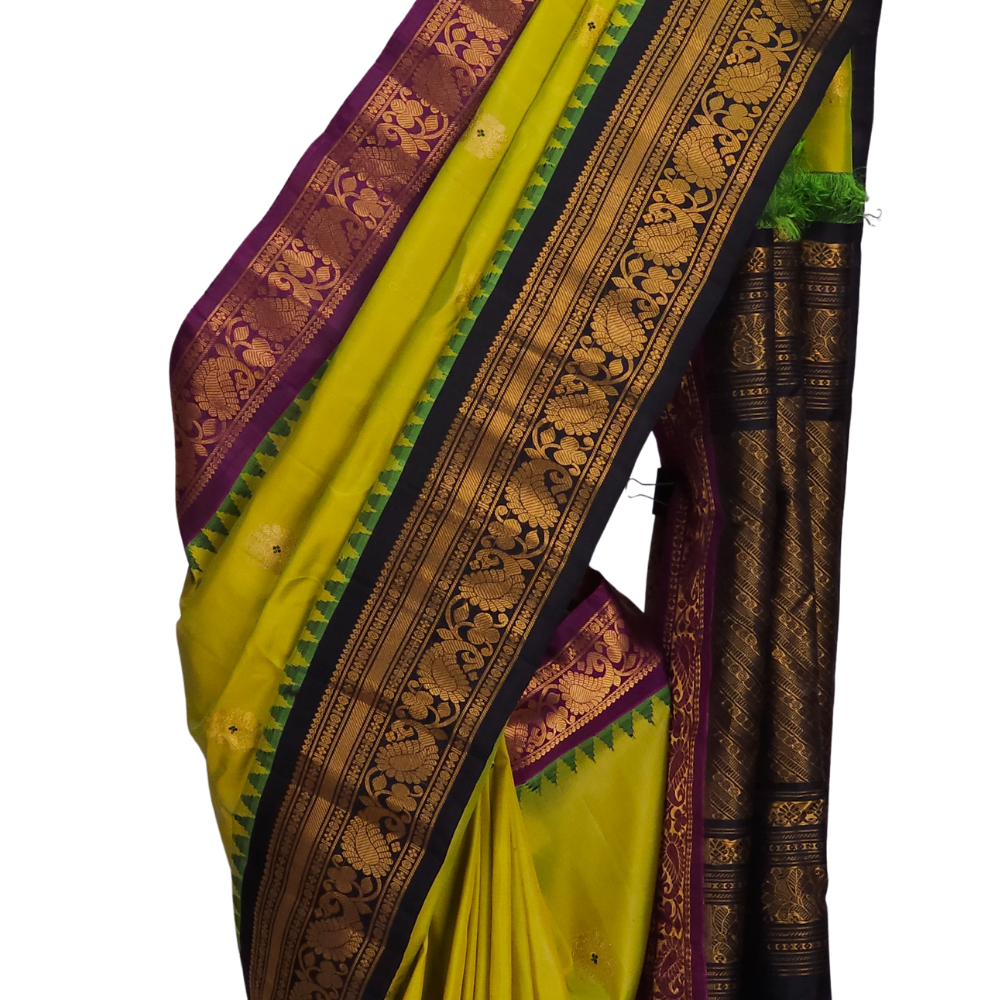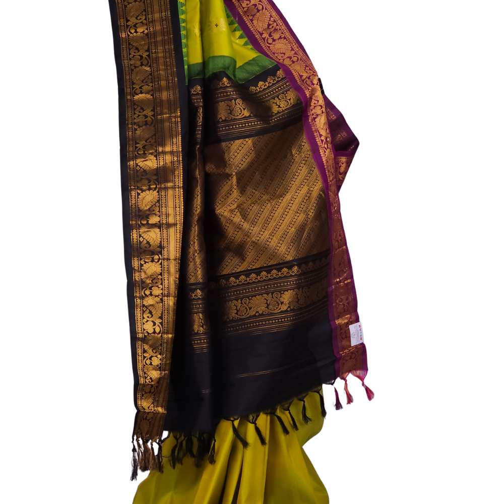 Elevate your elegance with our exquisite Handloom Gadwal Pure Silk Saree, adorned with Intricate zari motifs zari-woven borders Rich zari-woven brocade adorns the pallu, making every drape a statement.