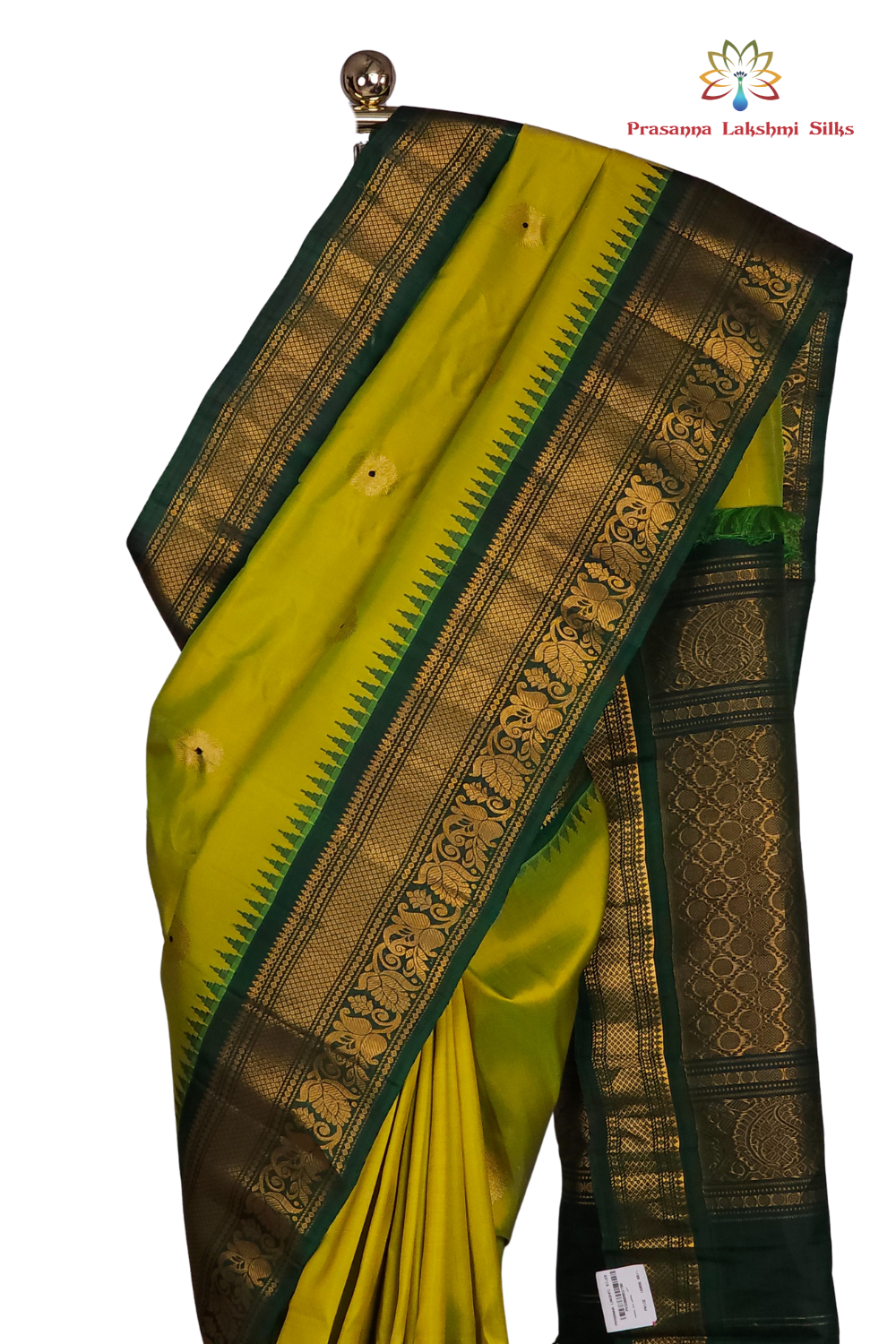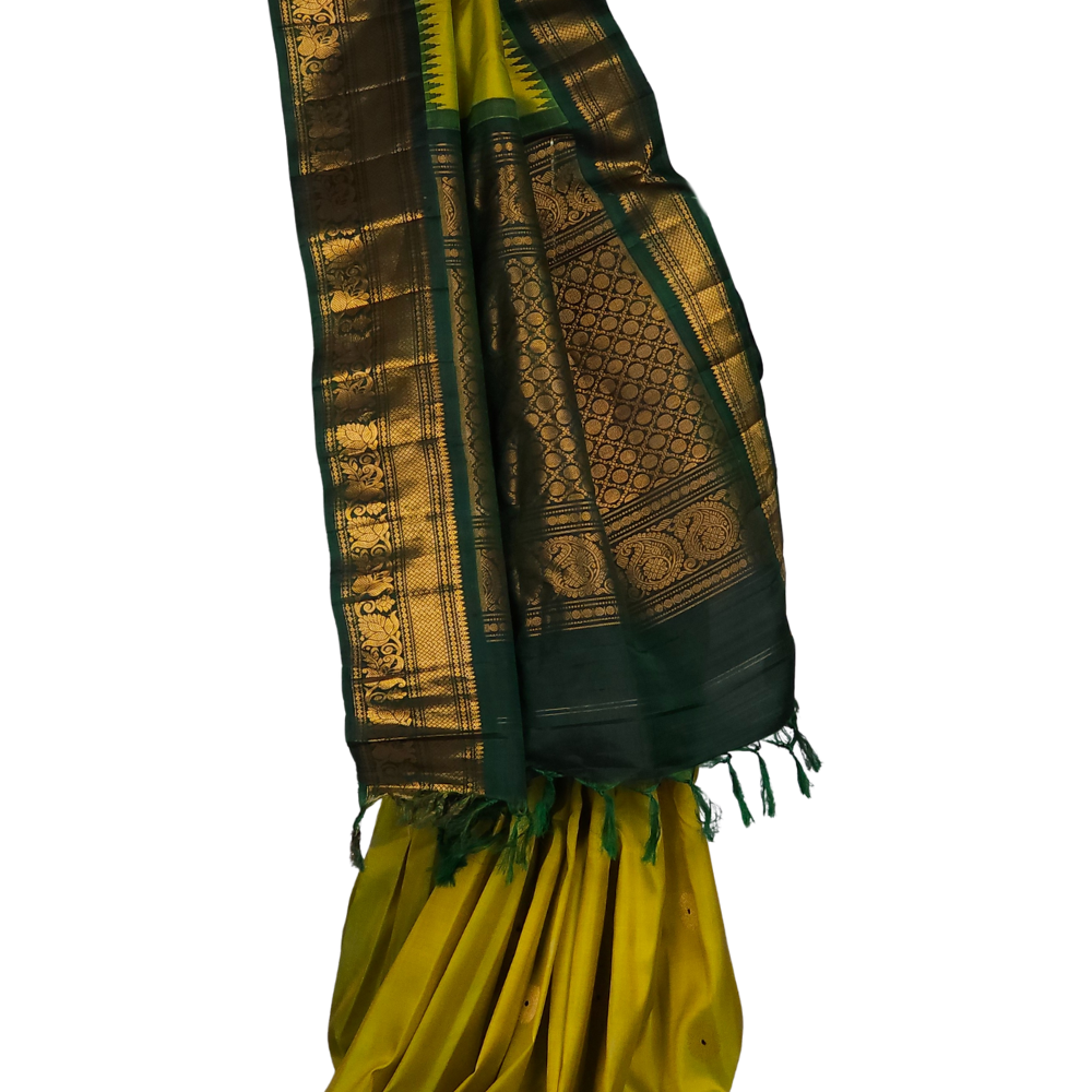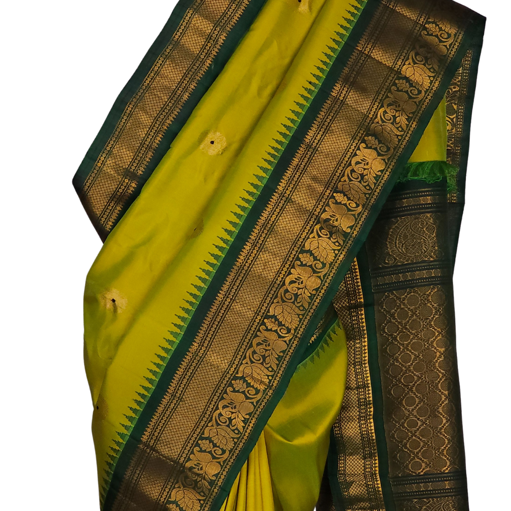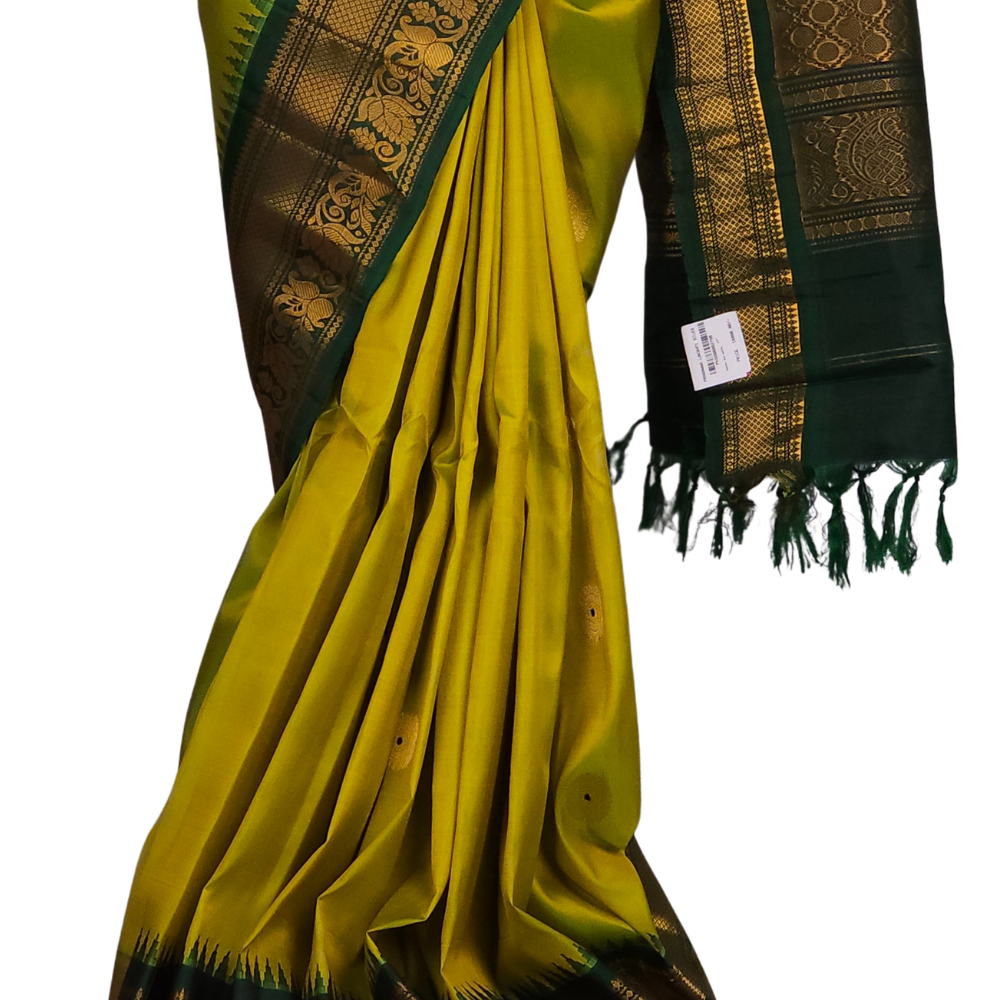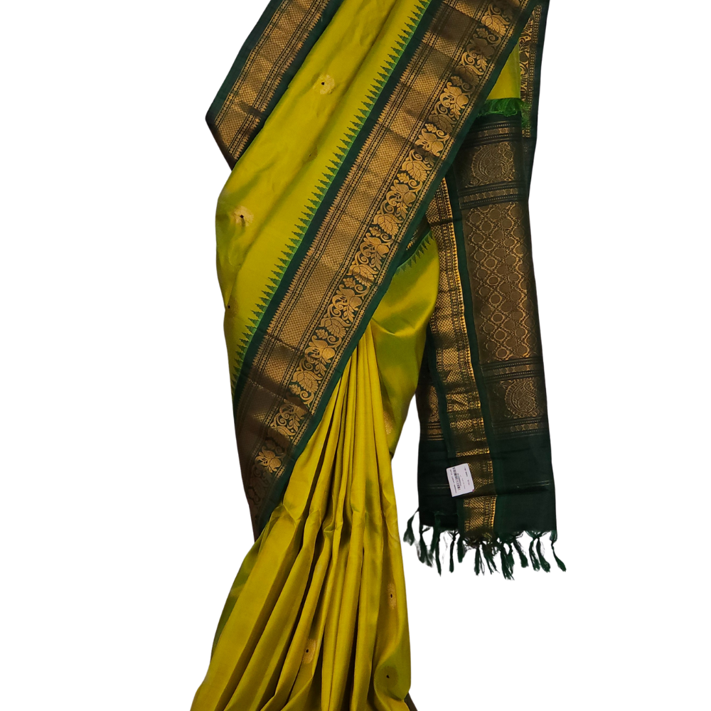 Elevate your elegance with our exquisite Handloom Gadwal Pure Silk Saree, adorned with Intricate zari motifs zari-woven borders Rich zari-woven brocade adorns the pallu, making every drape a statement.