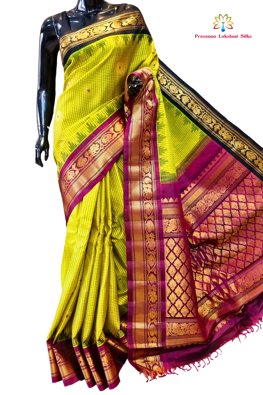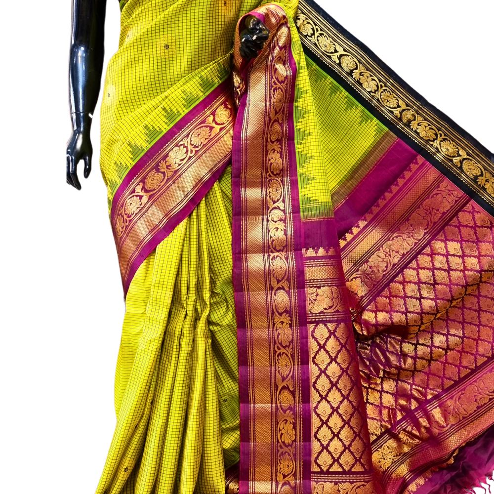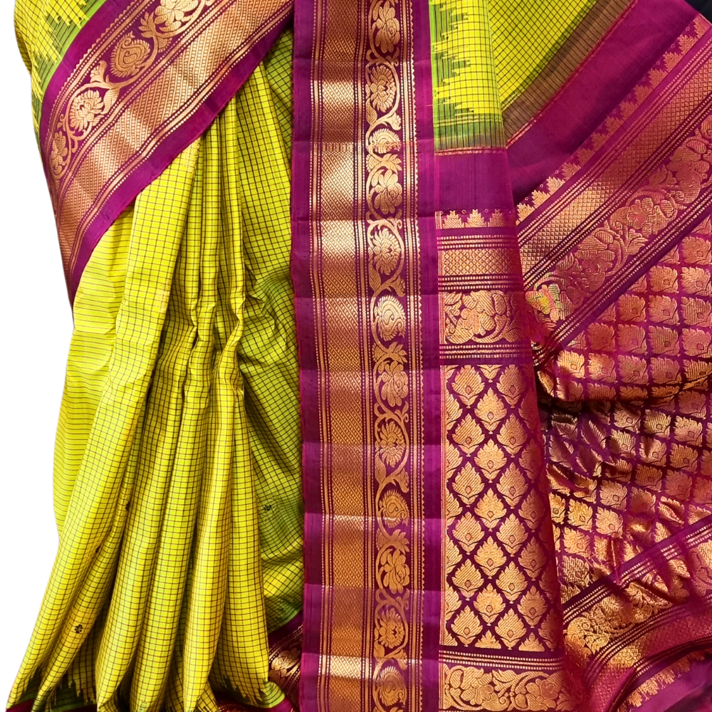 Elevate your elegance with our exquisite Handloom Gadwal Pure Silk Saree, adorned with classic checks pattern creating a timeless and elegant look with zari-woven borders and Rich zari-woven brocade that adorns the pallu, making every drape a statement.