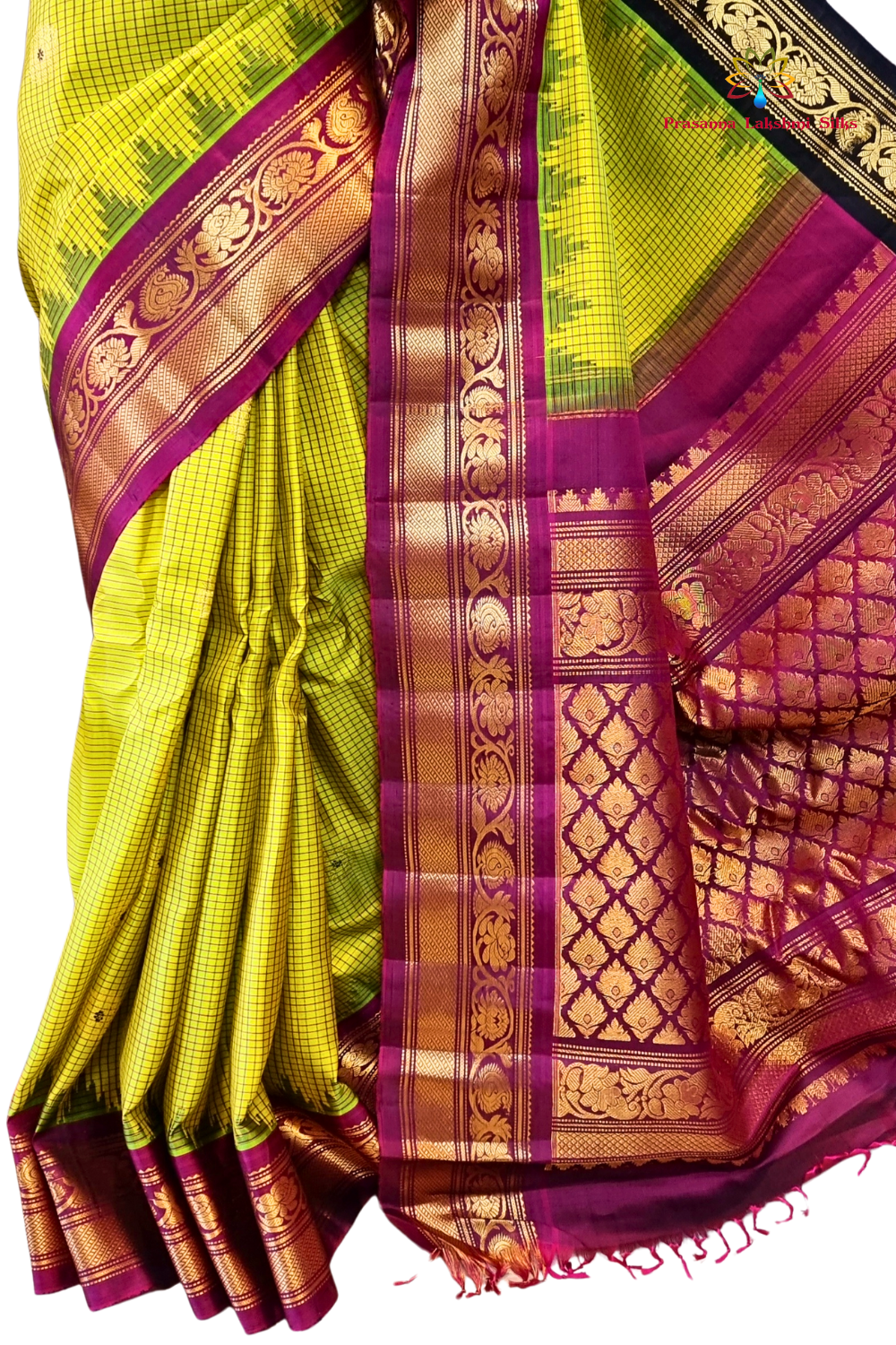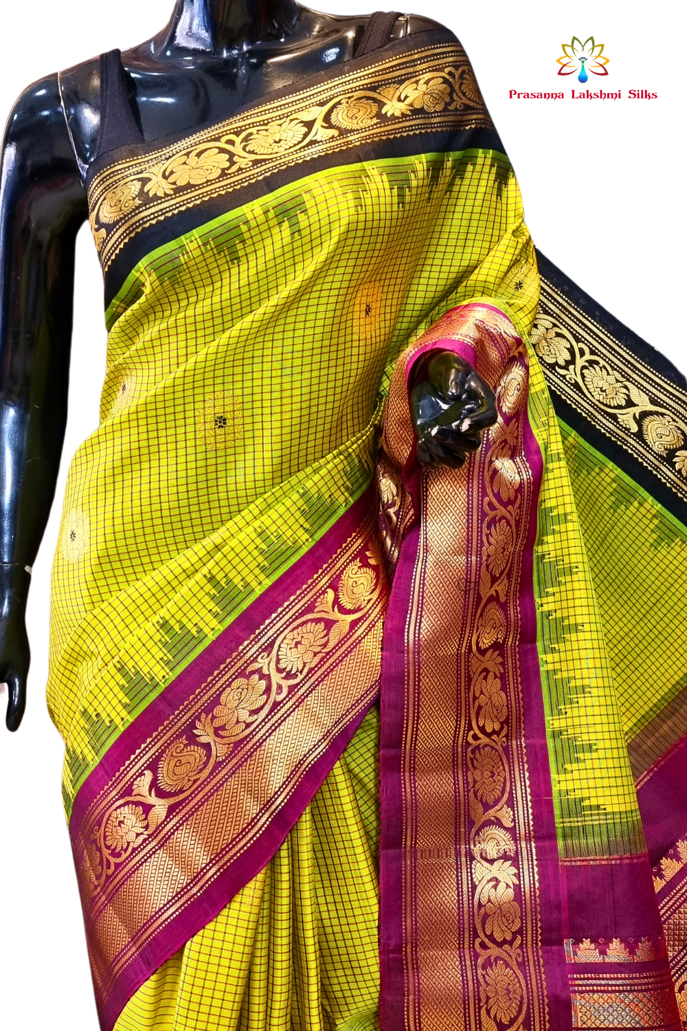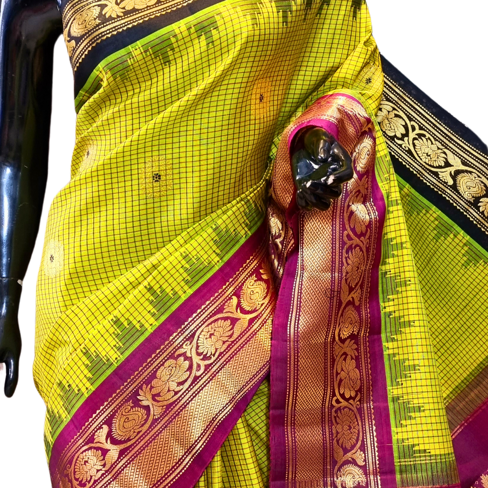 Elevate your elegance with our exquisite Handloom Gadwal Pure Silk Saree, adorned with classic checks pattern creating a timeless and elegant look with zari-woven borders and Rich zari-woven brocade that adorns the pallu, making every drape a statement.
