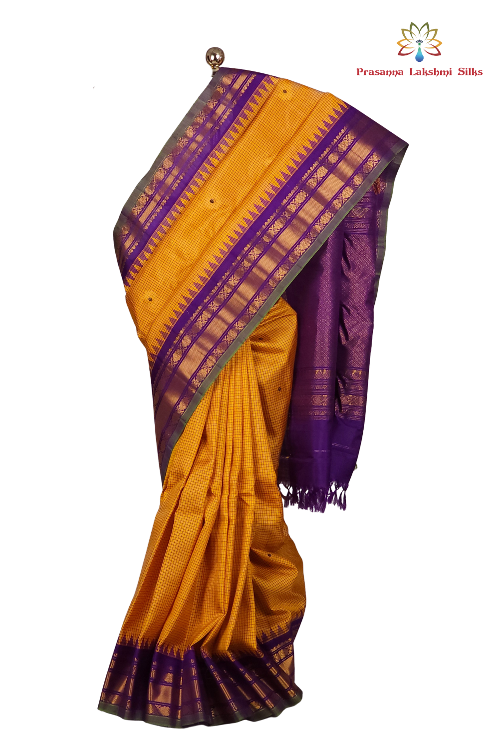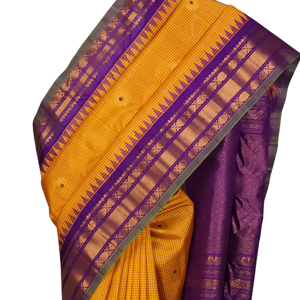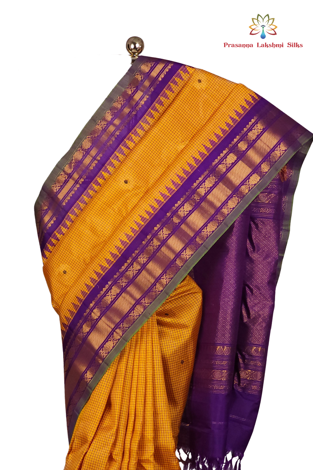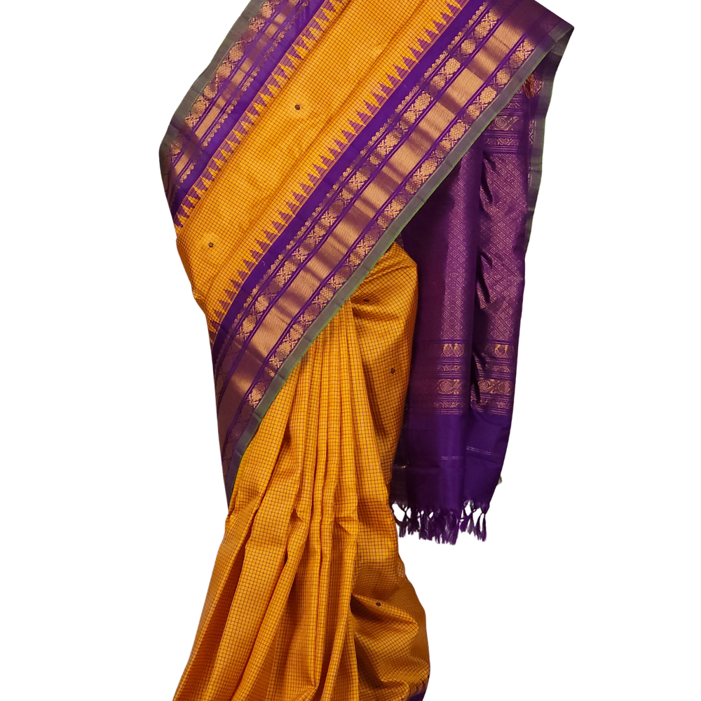 Elevate your elegance with our exquisite Handloom Gadwal Pure Silk Saree, adorned with classic checks pattern creating a timeless and elegant look with zari-woven borders and Rich zari-woven brocade that adorns the pallu, making every drape a statement.