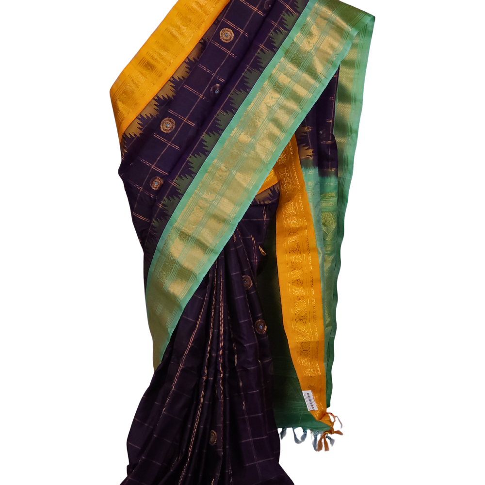 Experience the richness of traditional Indian craftsmanship with our Handloom Pure Gadwal Silk Saree,Intricate zari-woven buttas exquisite zari-woven Kanchi borders with Traditional zari brocade design on the pallu paired with contrast blouse