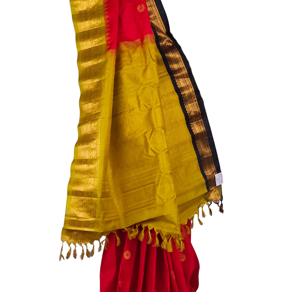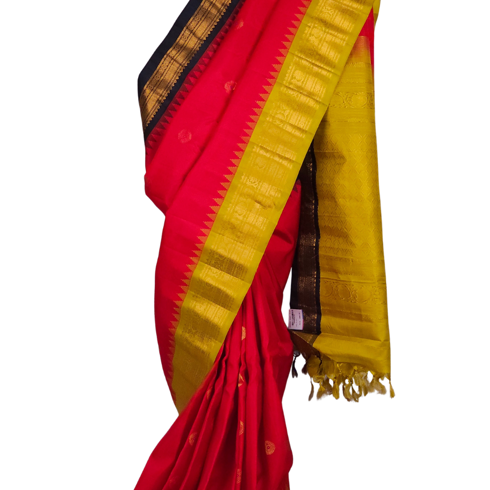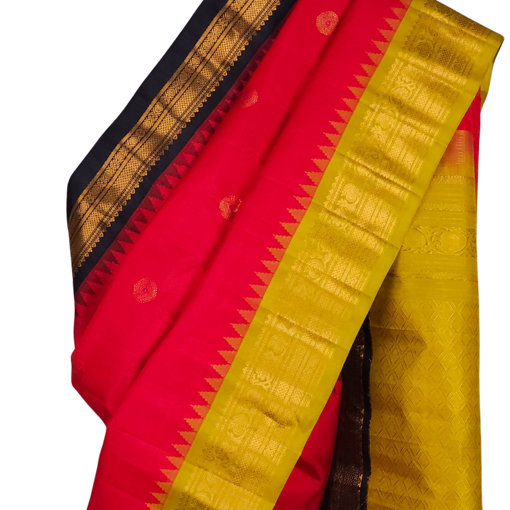 Elevate your elegance with our exquisite Handloom Gadwal Pure Silk Saree, adorned with Intricate zari motifs zari-woven borders Rich zari-woven brocade adorns the pallu, making every drape a statement.
