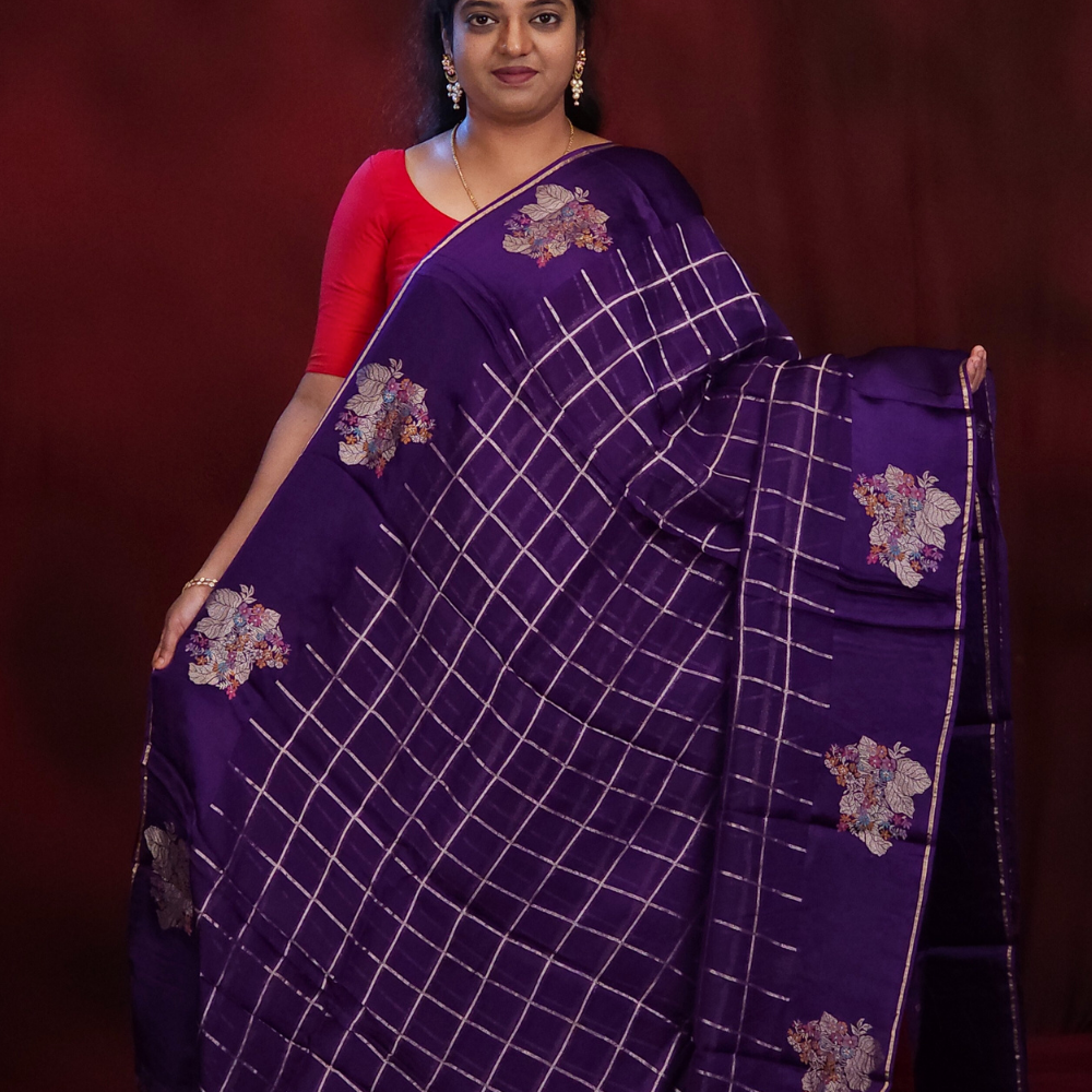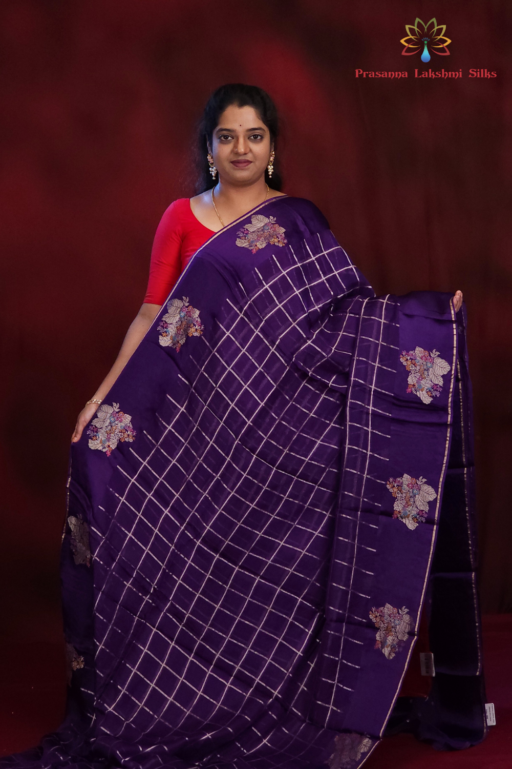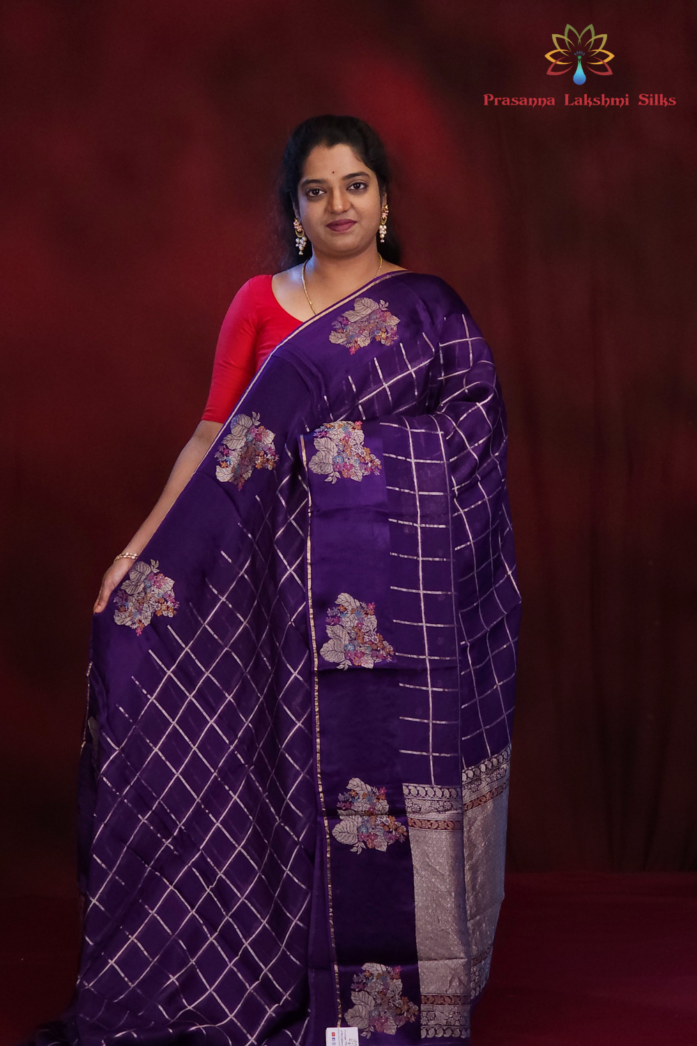 Experience the epitome of Banarasi Organza saree comes with elegant silver checks, rich satin borders highlighted with meenakari floral bunches, and a stunning silver brocade pallu. Finished with running blouse....