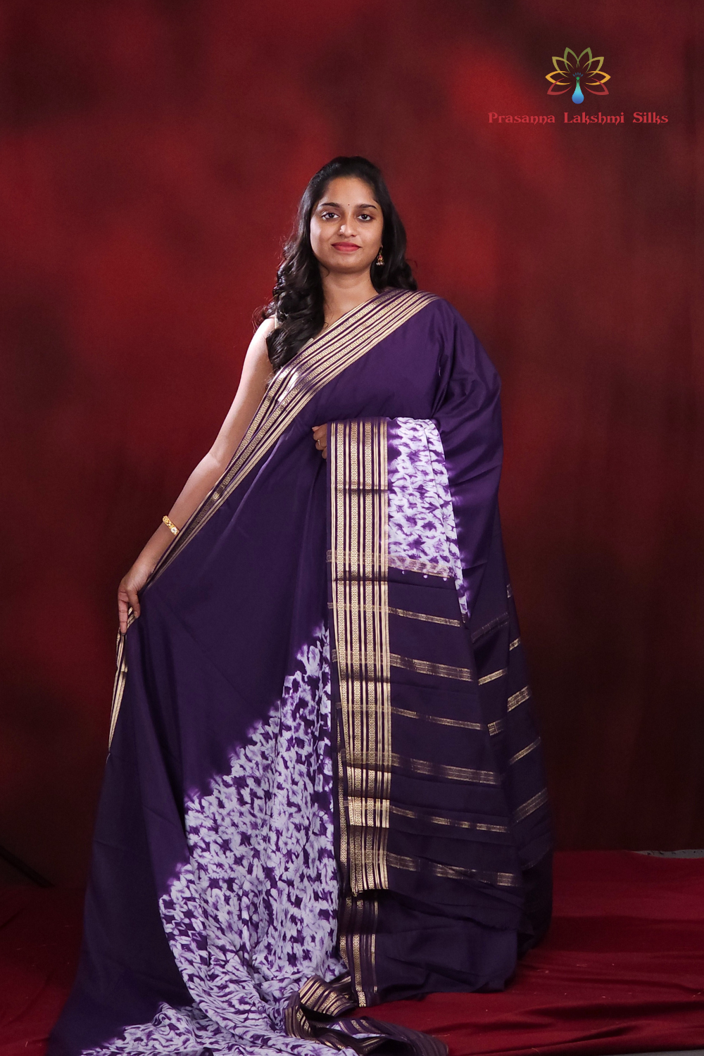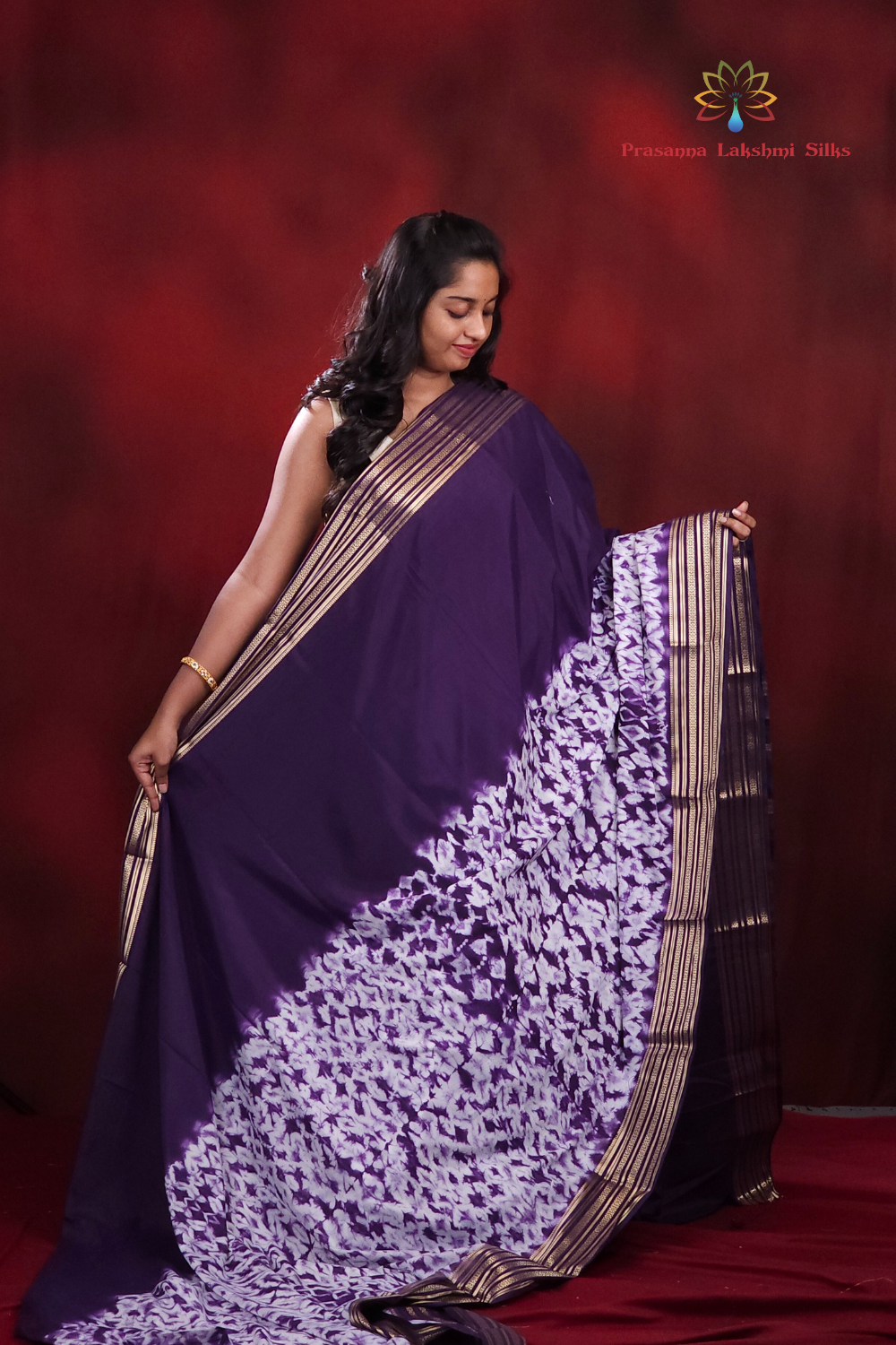 Semi Mysore Silk Saree, designed with elegant half and half shibori print . The saree features unique border detailing with zari lines borders,simple lines pallu and matching with running blouse....