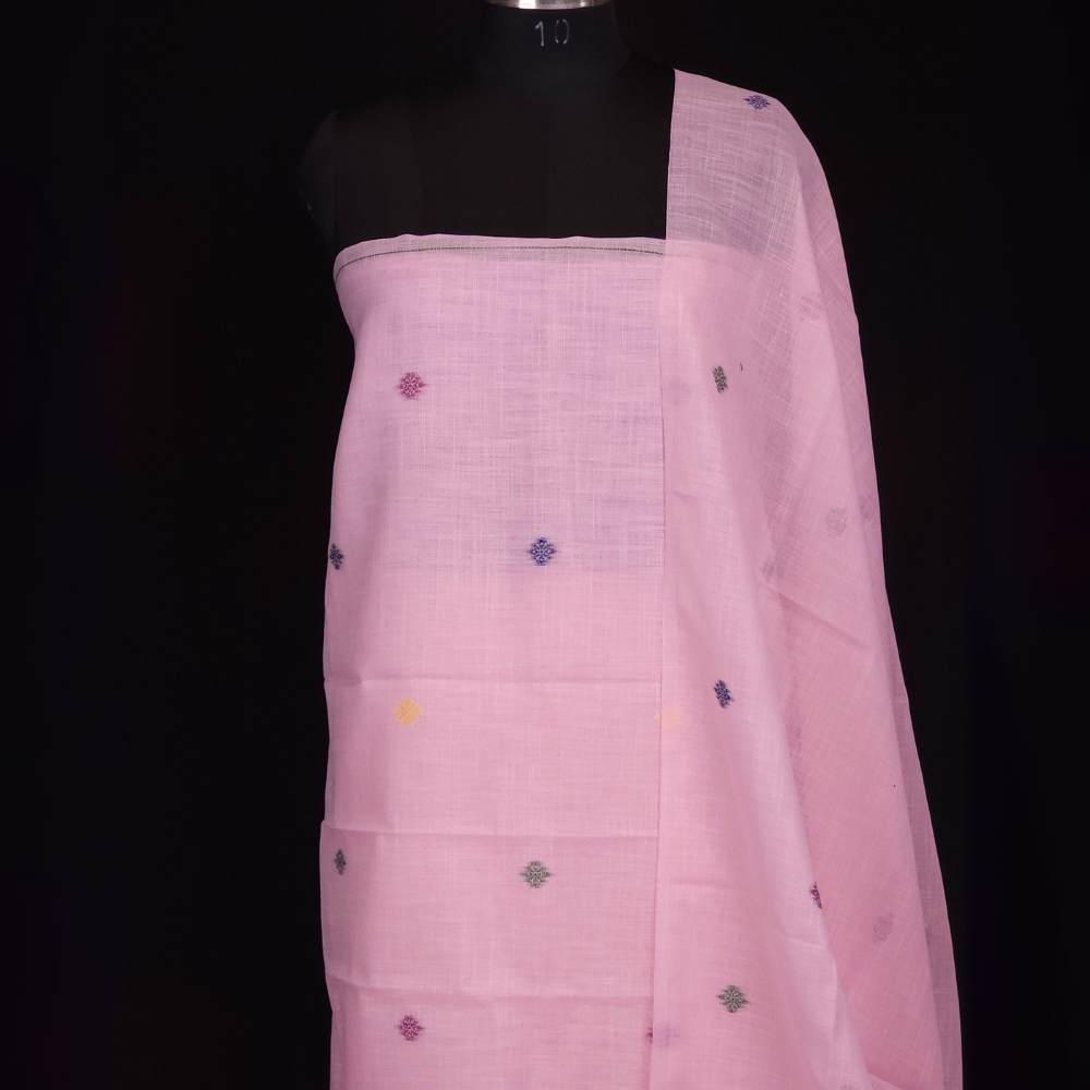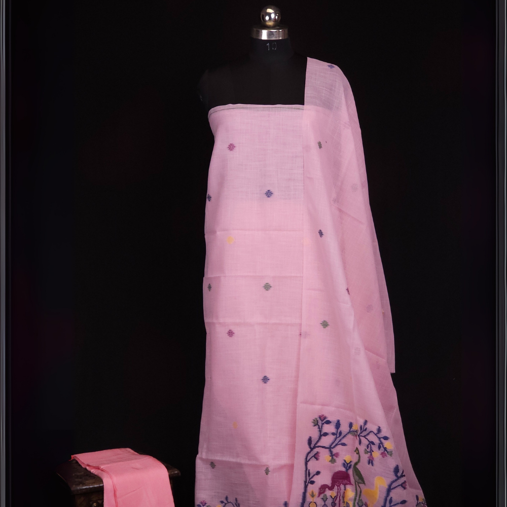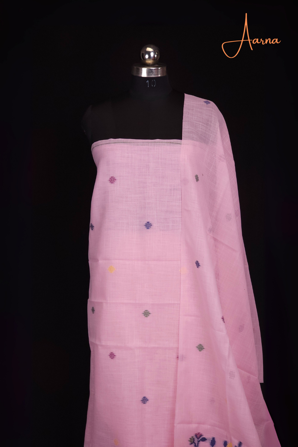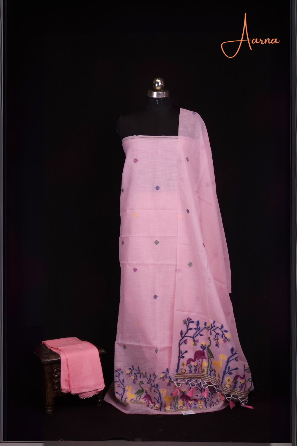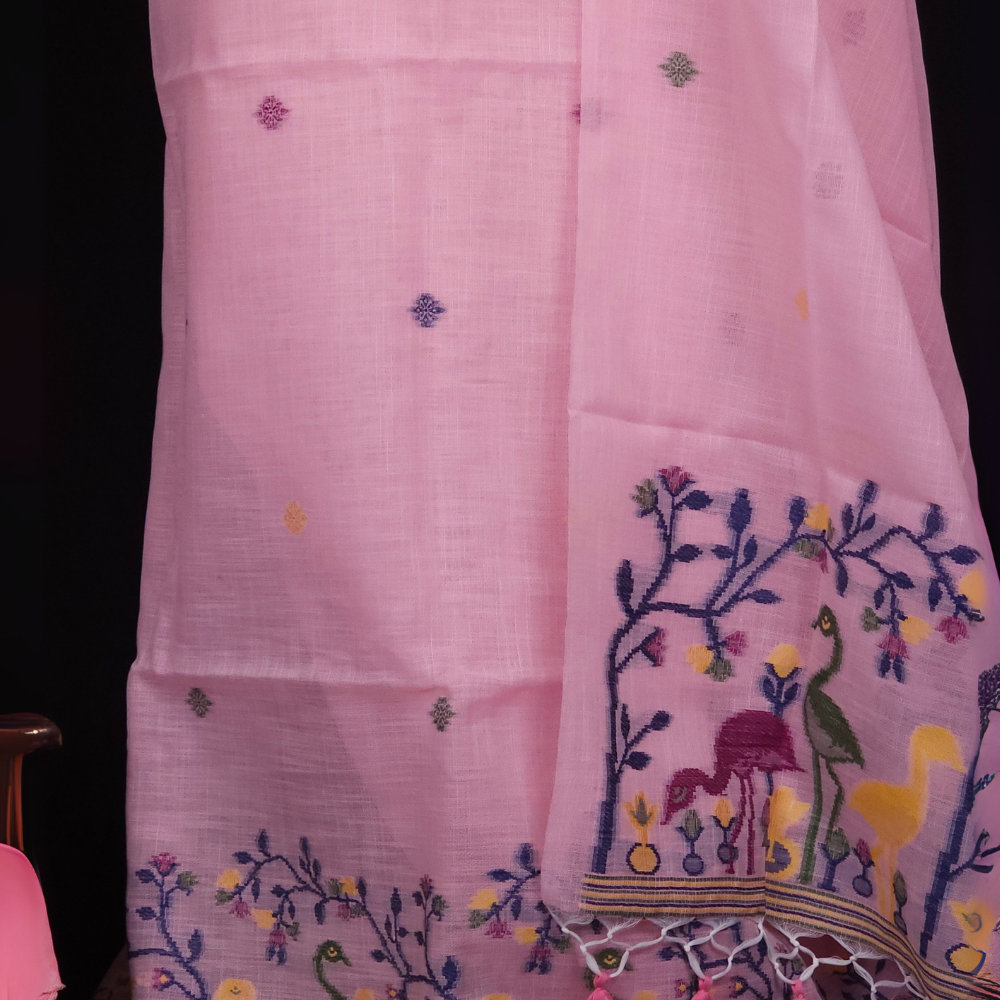 Elegant Linen top allover meenakari motifs detailing, finished with swans and floral designs woven in multicolored thread embroidery, paired with plain bottom and dupatta with motifs, tassels.perfect for a rich festive look.