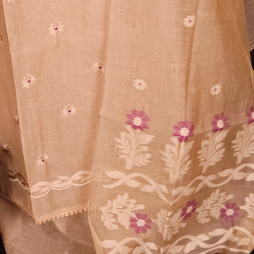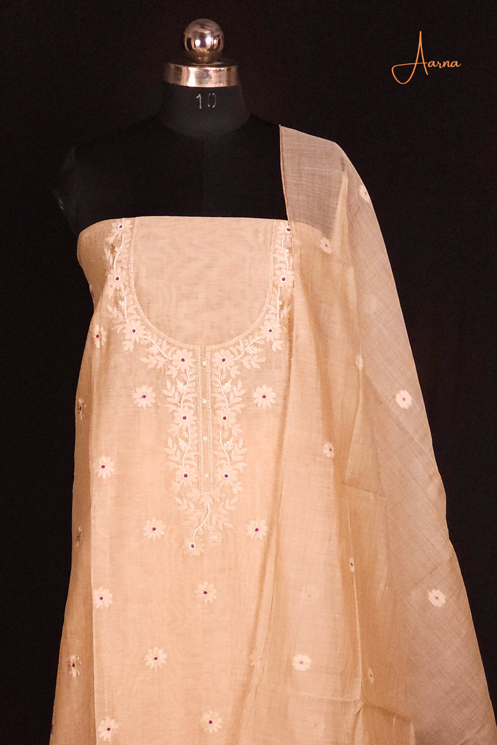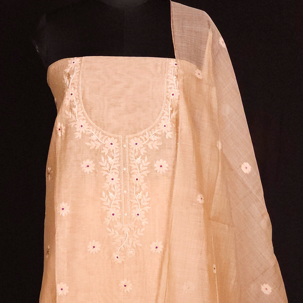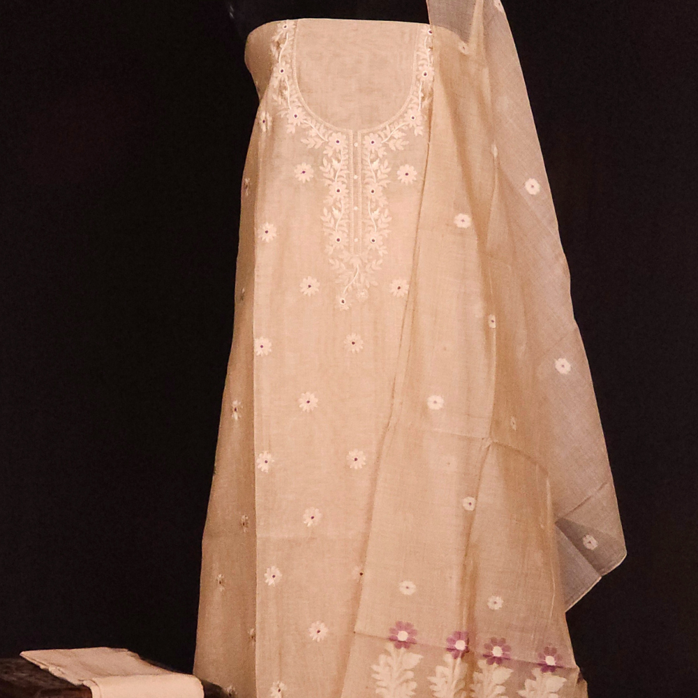 Elegant Chanderi top with allover thread motifs and floral Thread-woven bunches, paired with a plain bottom and a richly woven dupatta paired with tassels.....