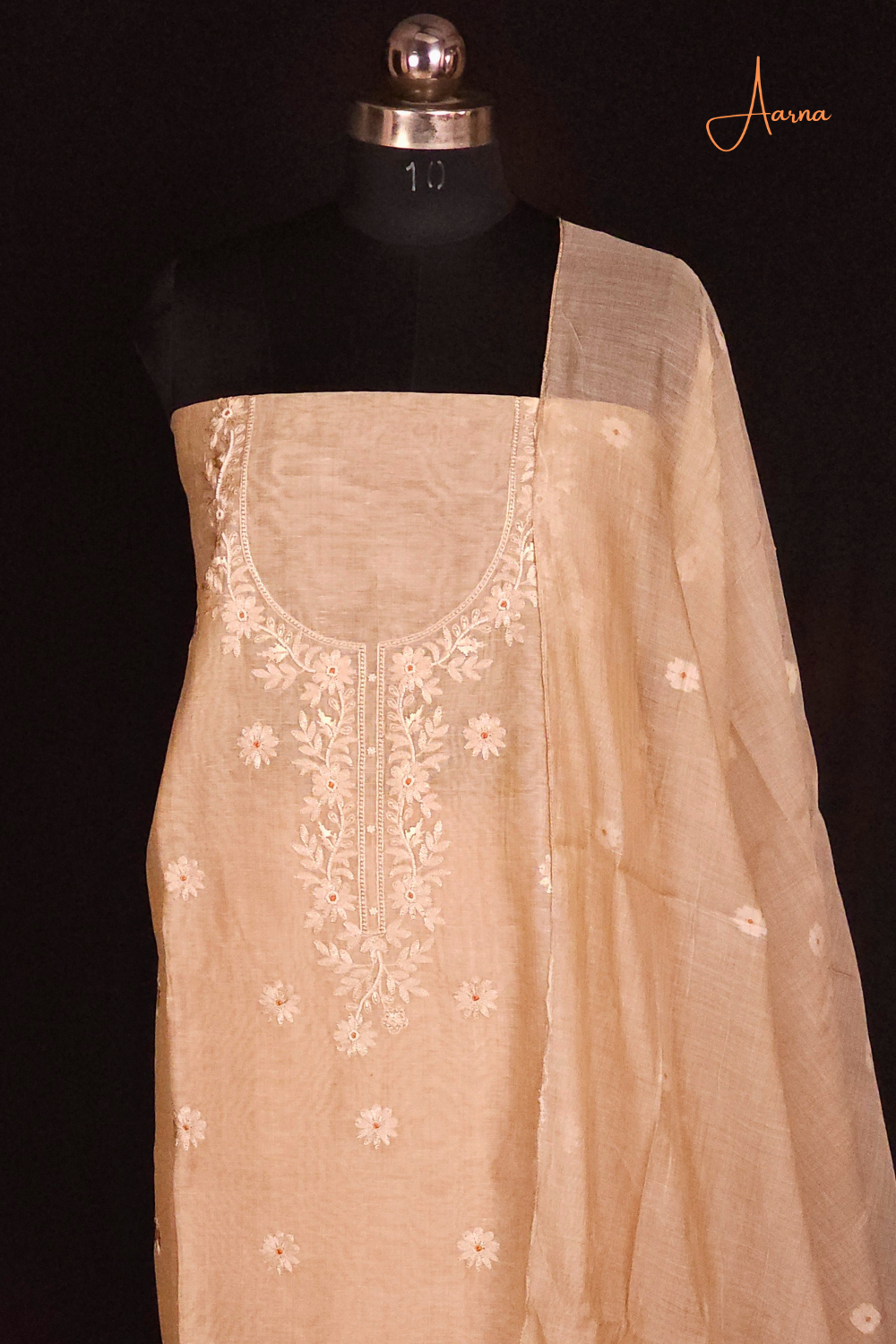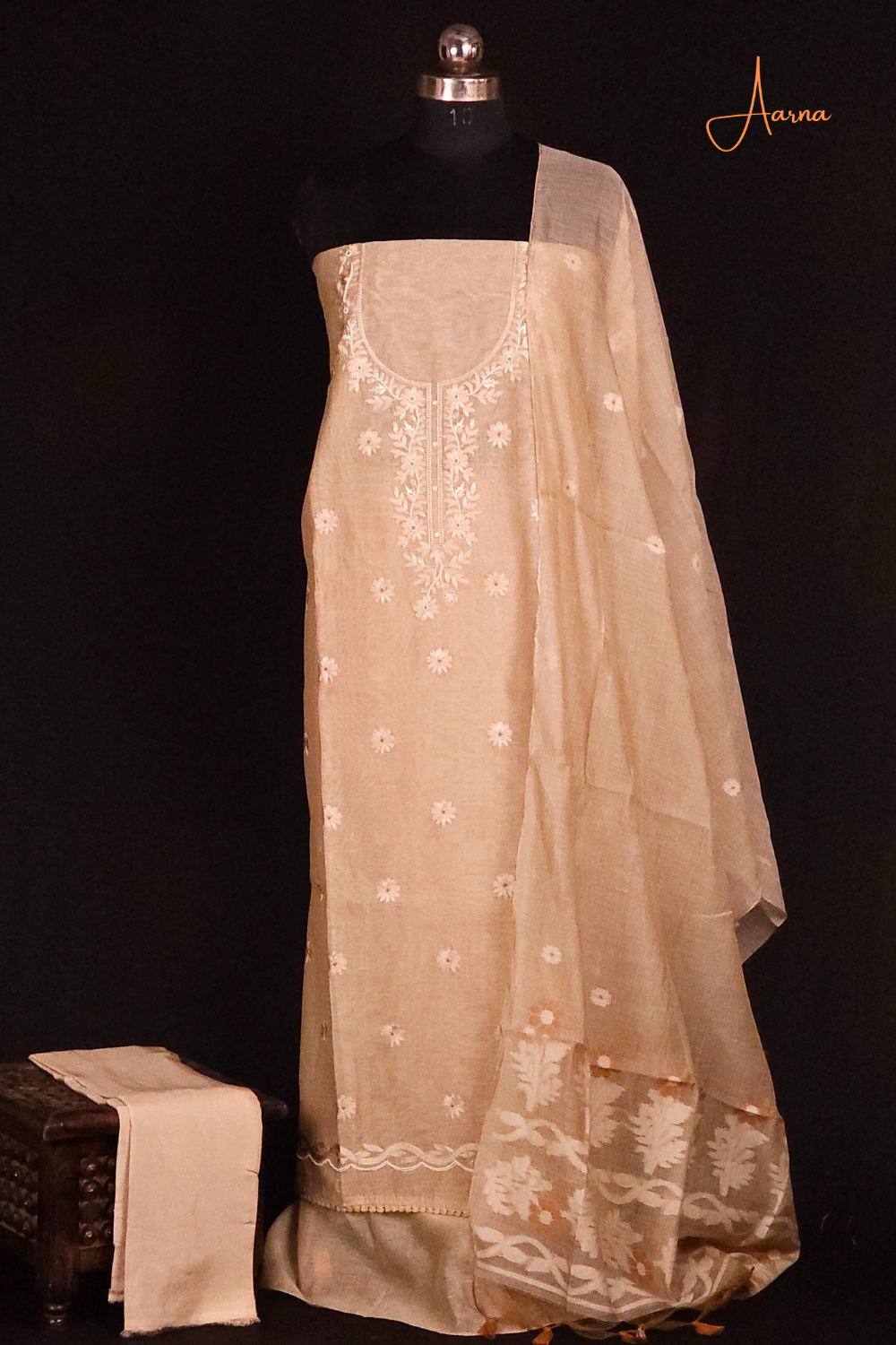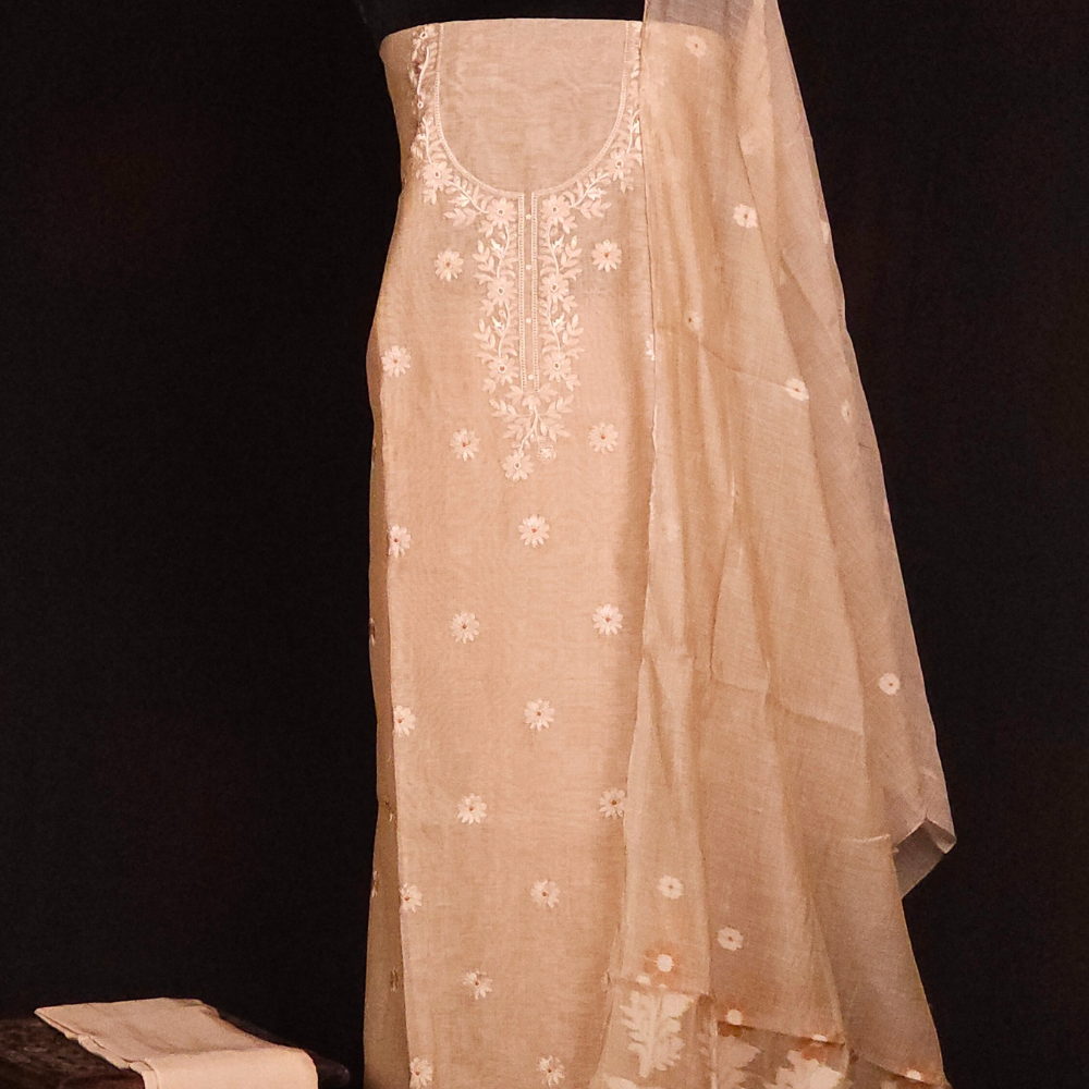 Elegant Chanderi top with allover thread motifs and floral Thread-woven bunches, paired with a plain bottom and a richly woven dupatta paired with tassels.....