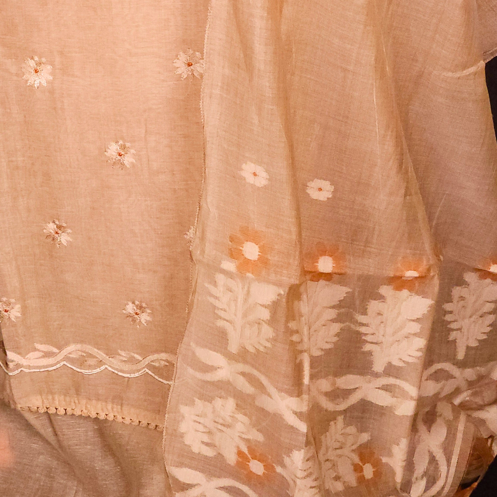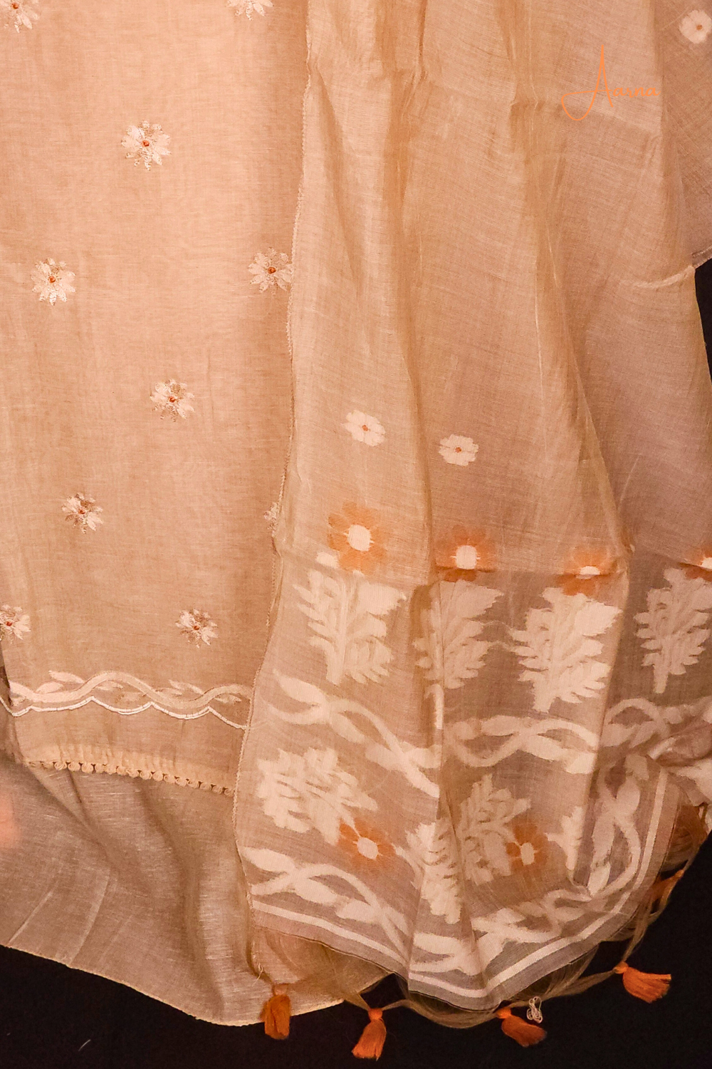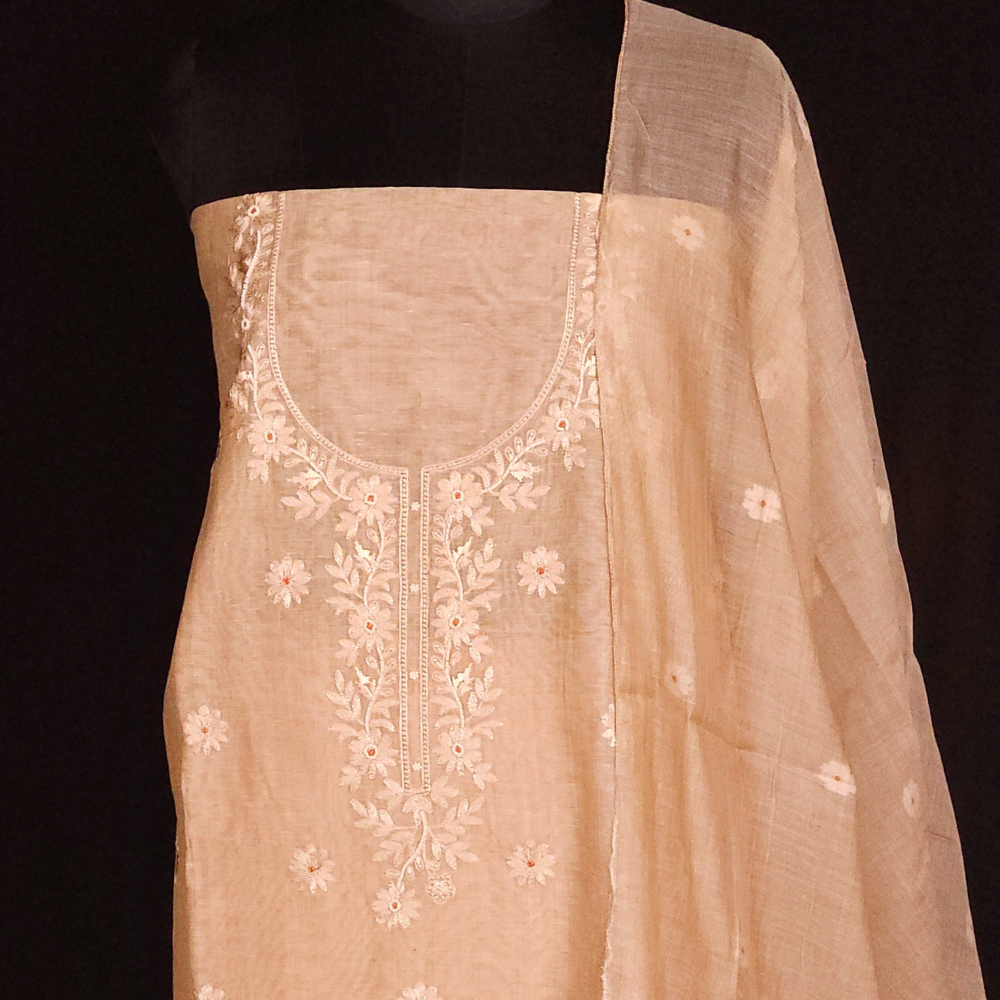 Elegant Chanderi top with allover thread motifs and floral Thread-woven bunches, paired with a plain bottom and a richly woven dupatta paired with tassels.....