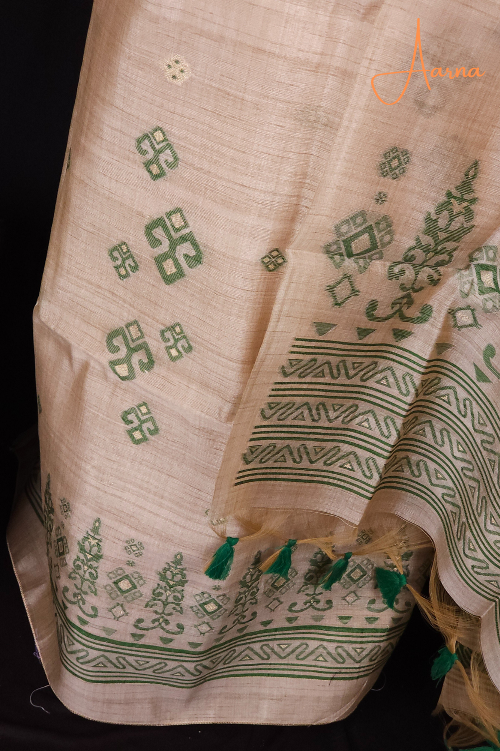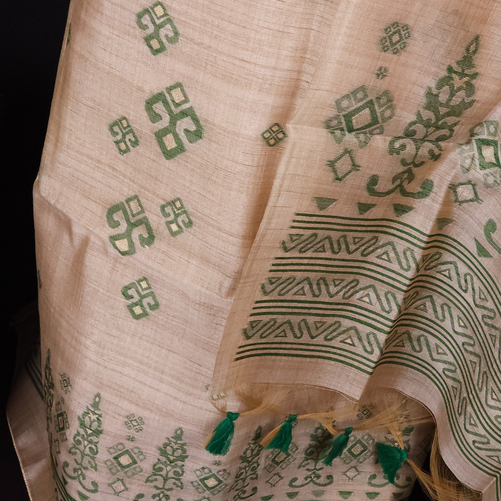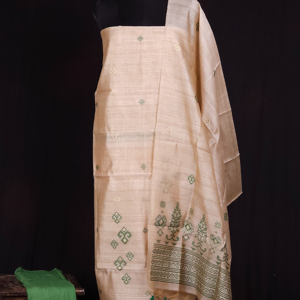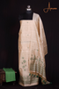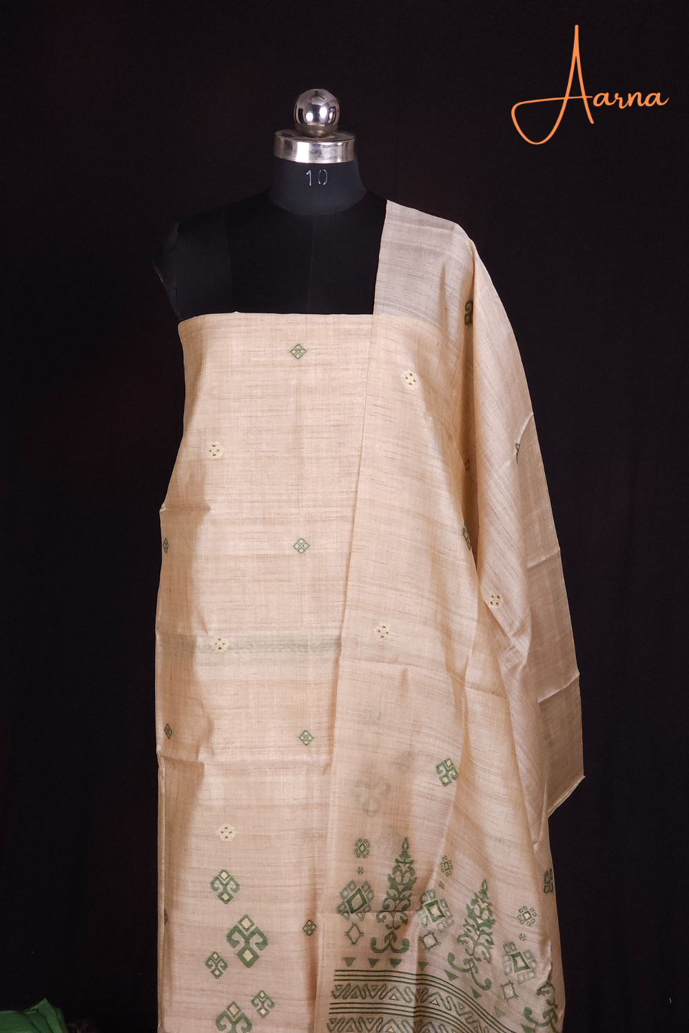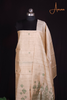 Elegant Chanderi with unique artistic pattern featuring floral and triangle designs, styled beautifully.Paired with a rich contrast dupatta and a contrast bottom for a bold, contemporary look