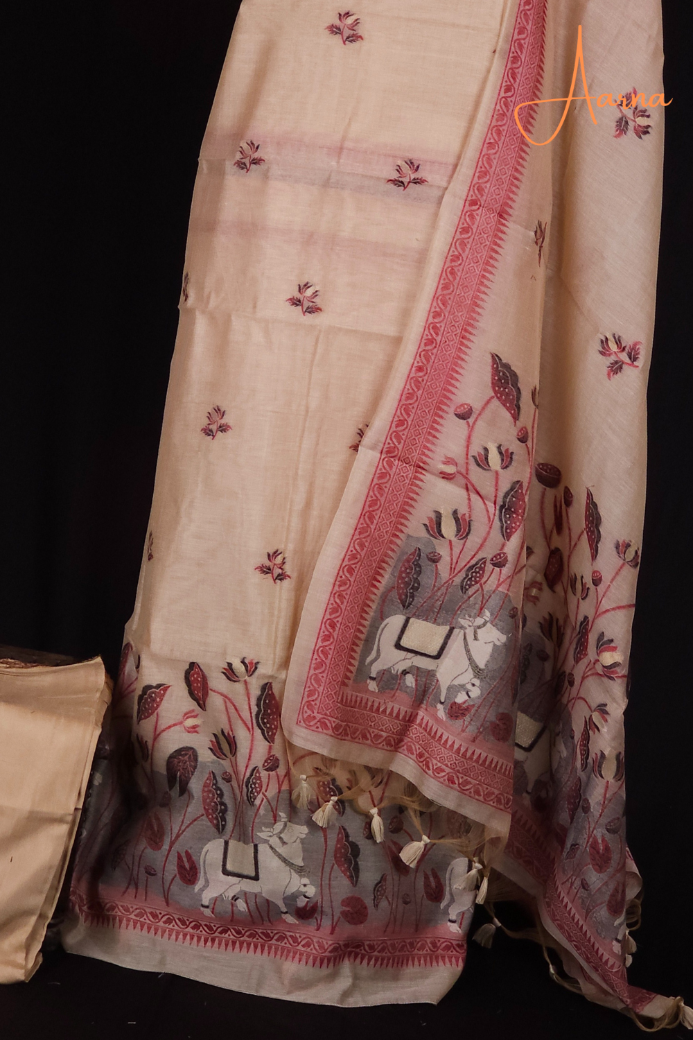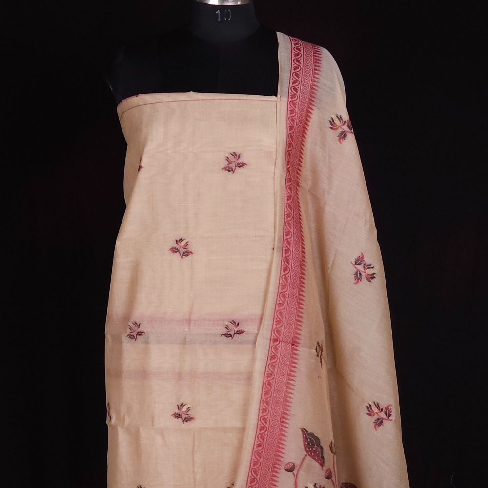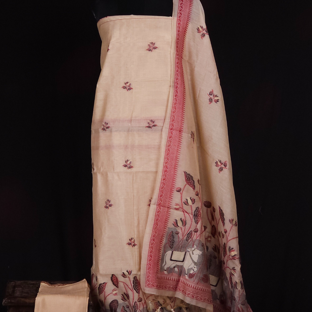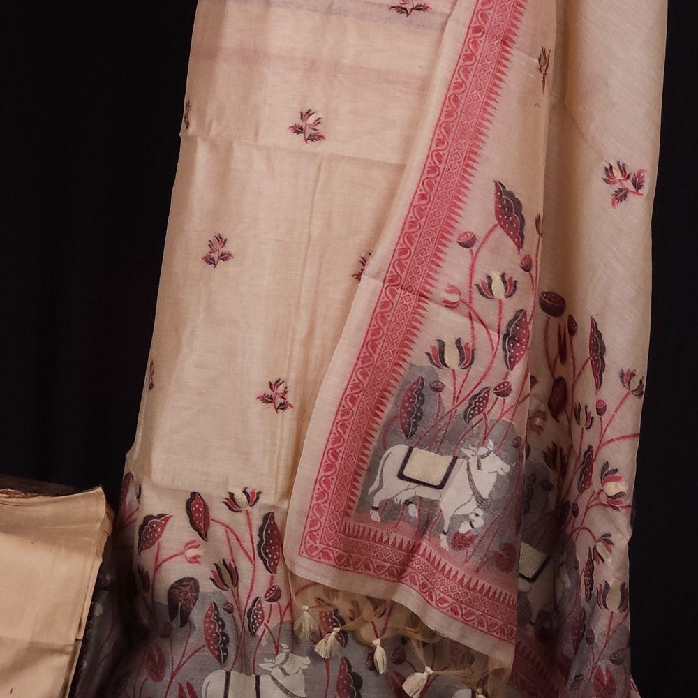 Elegant Chanderi top lotus designs across the top designed with cow and floral design .Finished with a rich thread -woven dupatta paired with a plain bottom .....