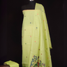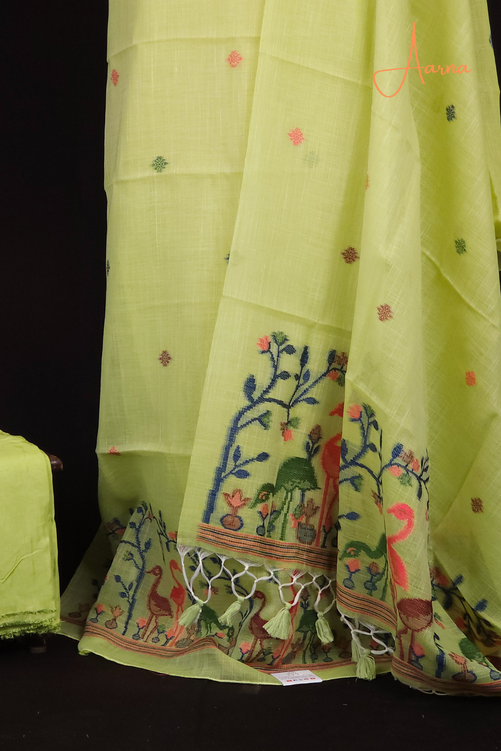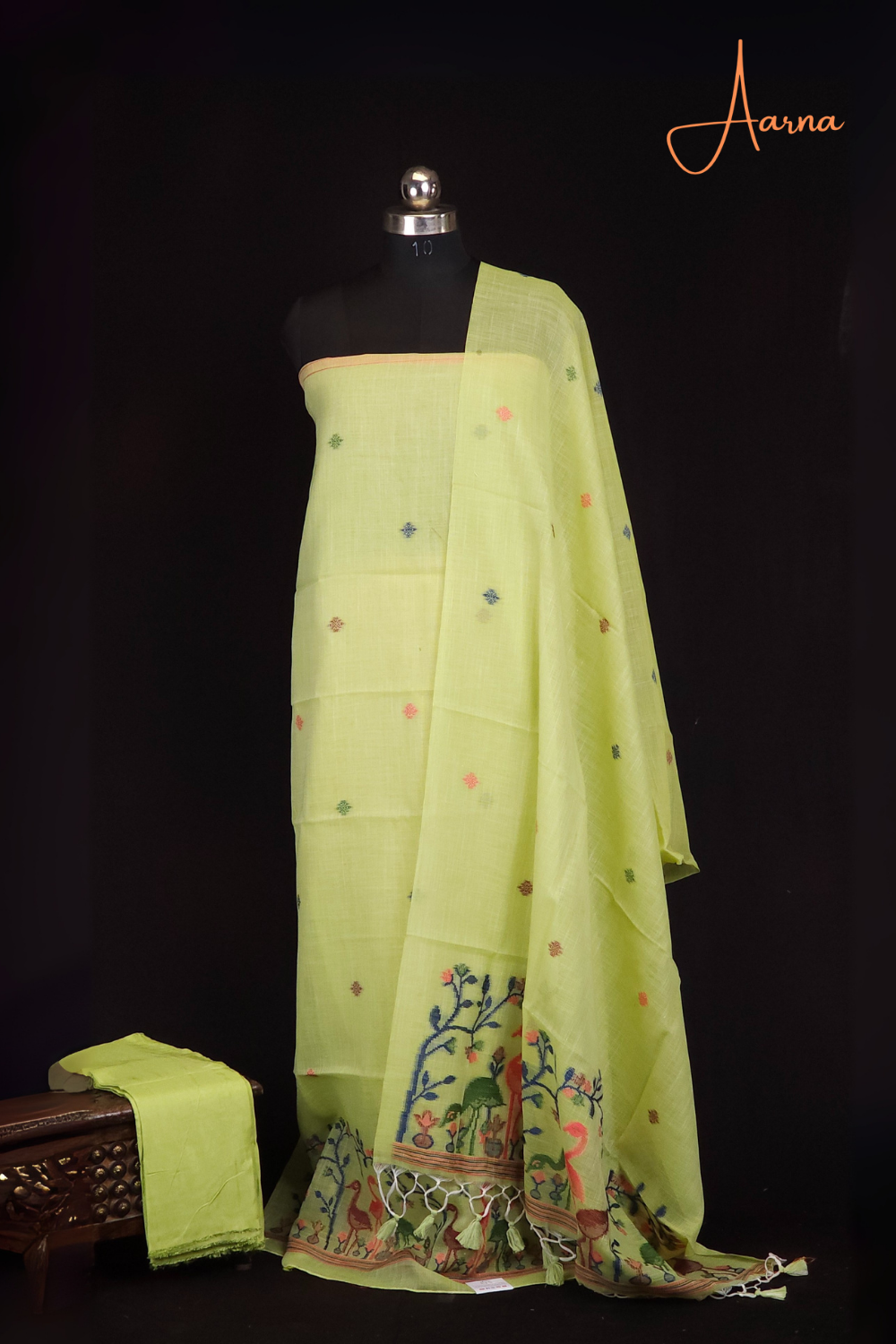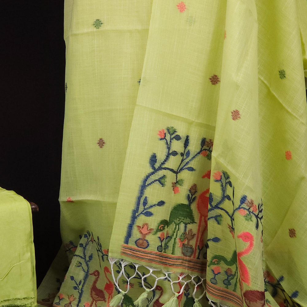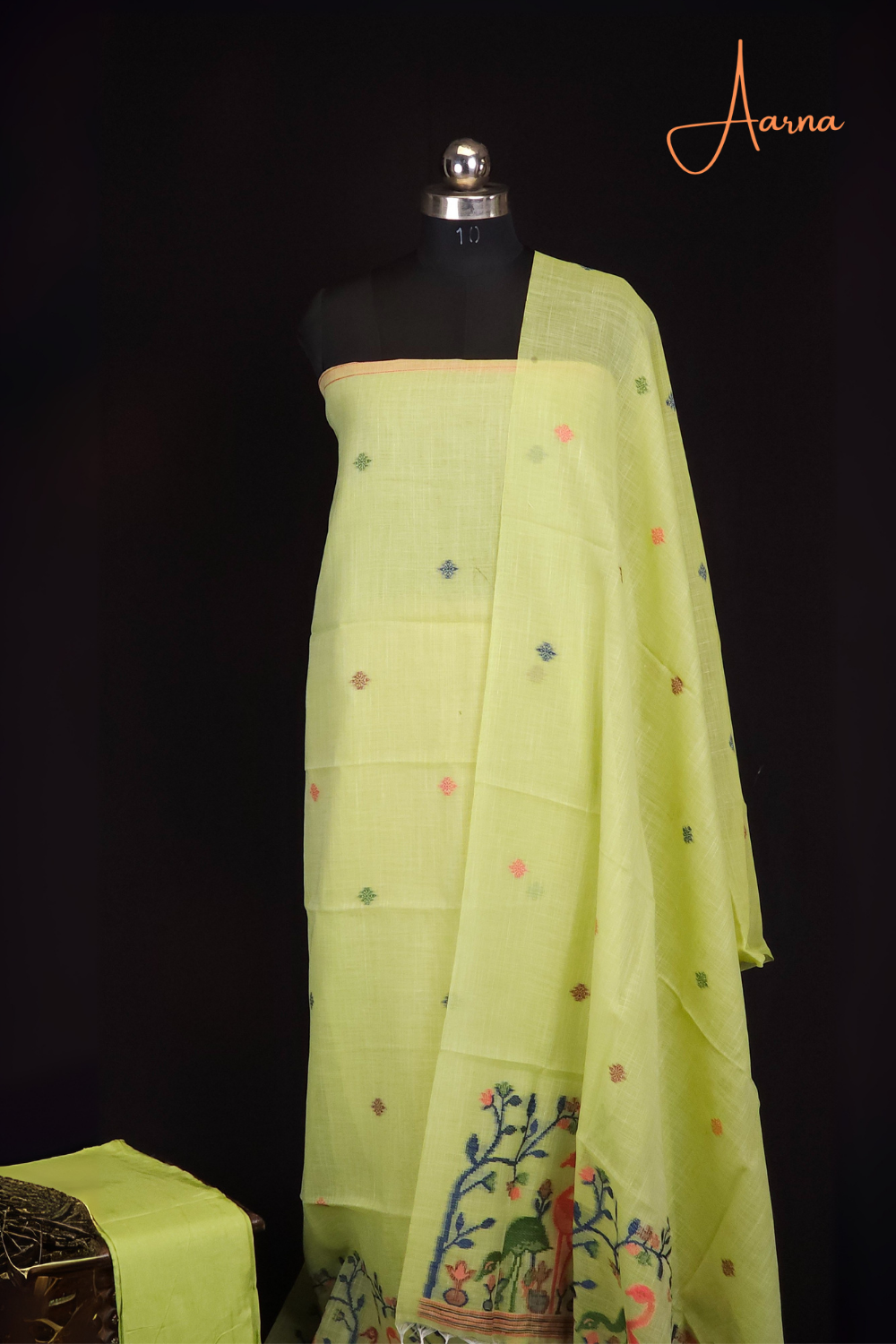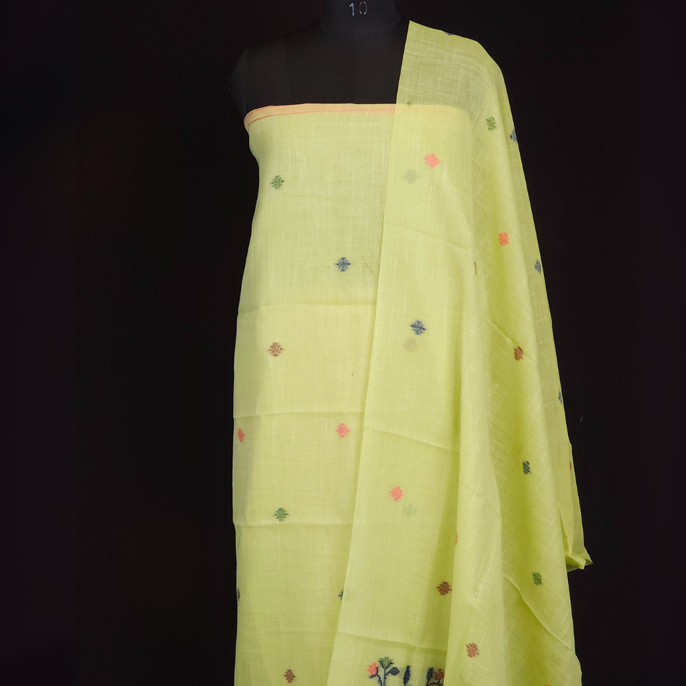Elegant Linen top allover meenakari motifs detailing, finished with swans and floral designs woven in multicolored thread embroidery, paired with plain bottom and dupatta with motifs, tassels.perfect for a rich festive look.