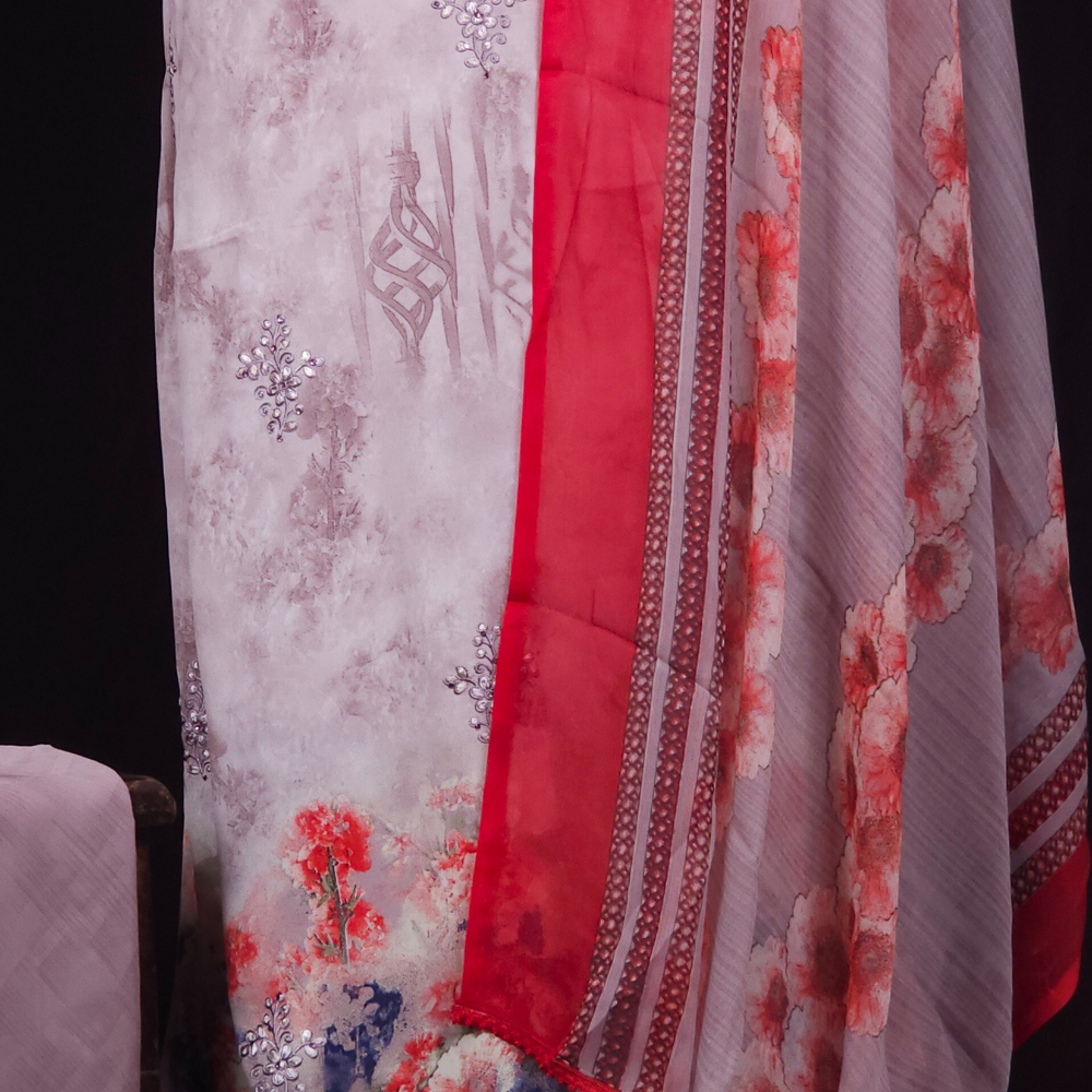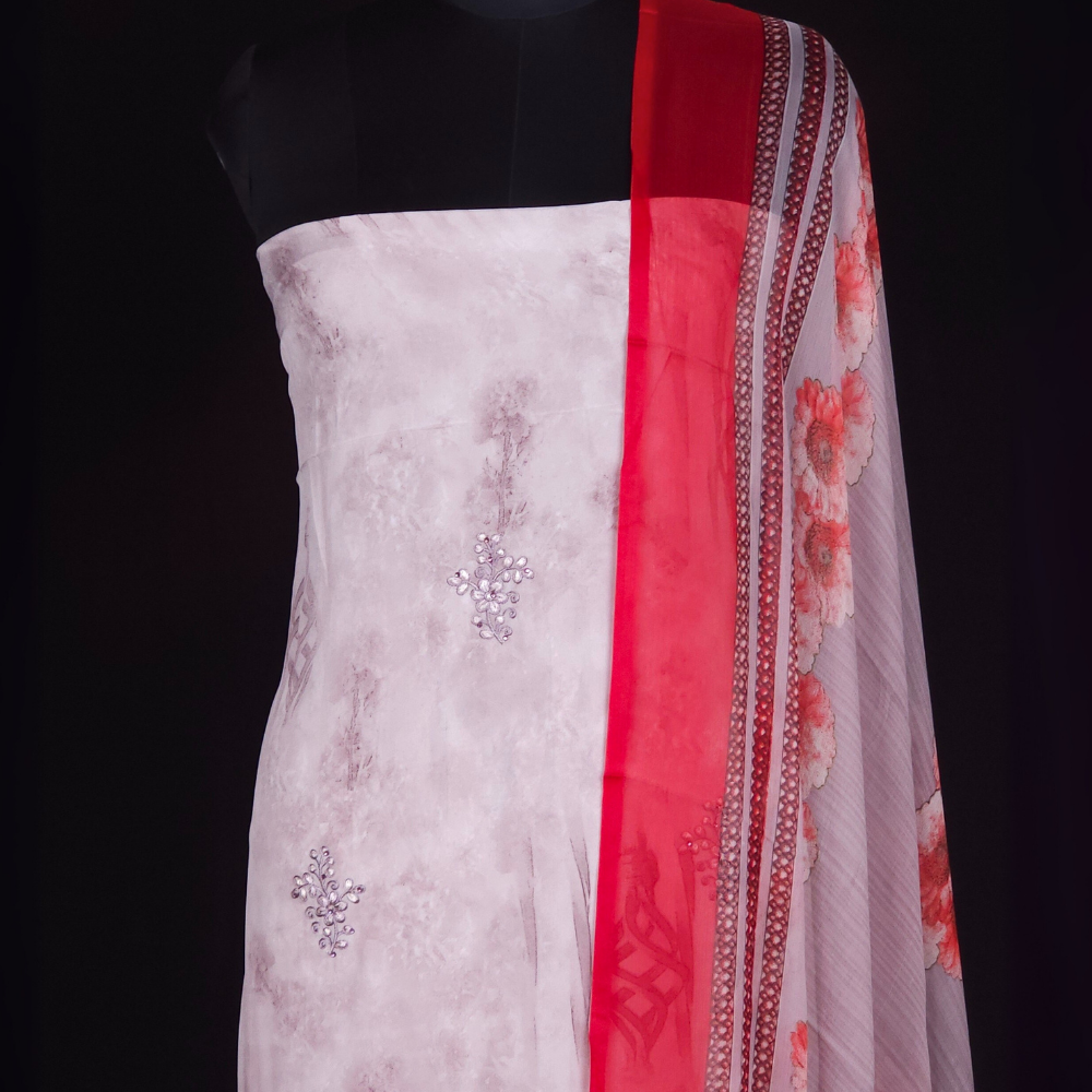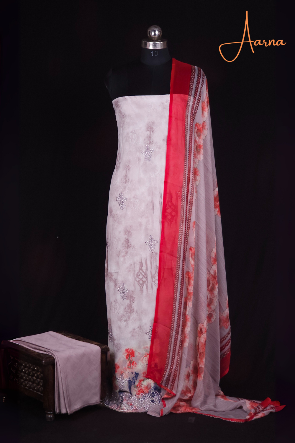 Elegant Satin Dress Material Set featuring graceful allover floral prints, the kurta is beautifully enhanced with threadwork and delicate mirror detailing at the bottom, bringing subtle sparkle to your look. It comes with a plain bottom and a lightweight chiffon dupatta.....