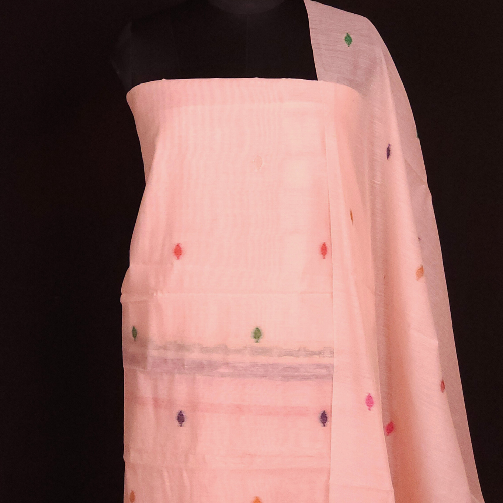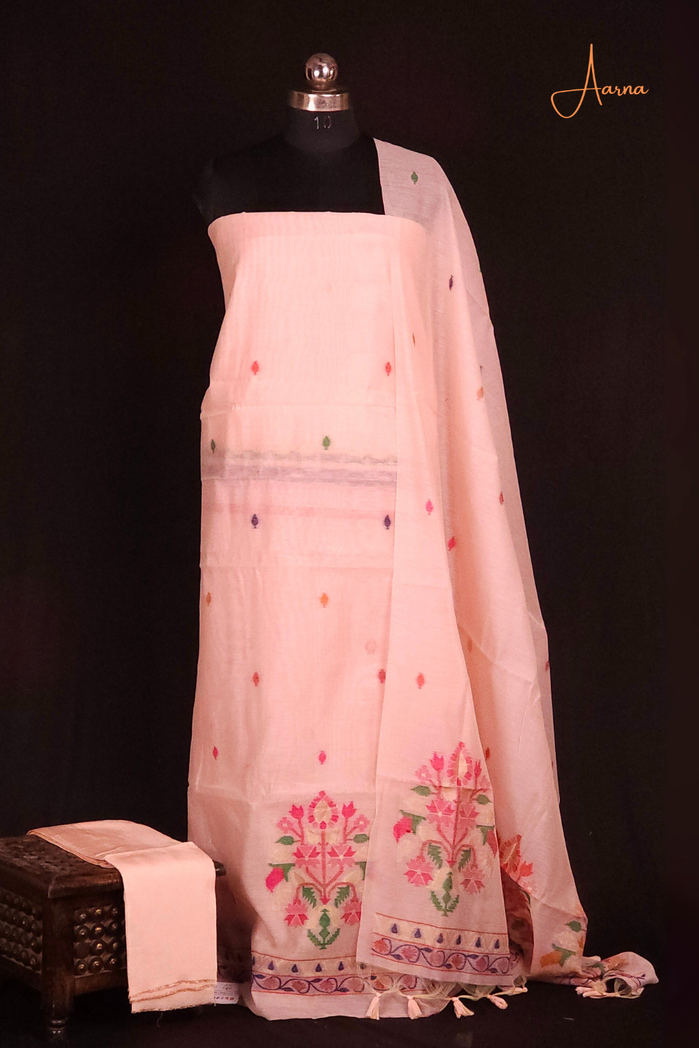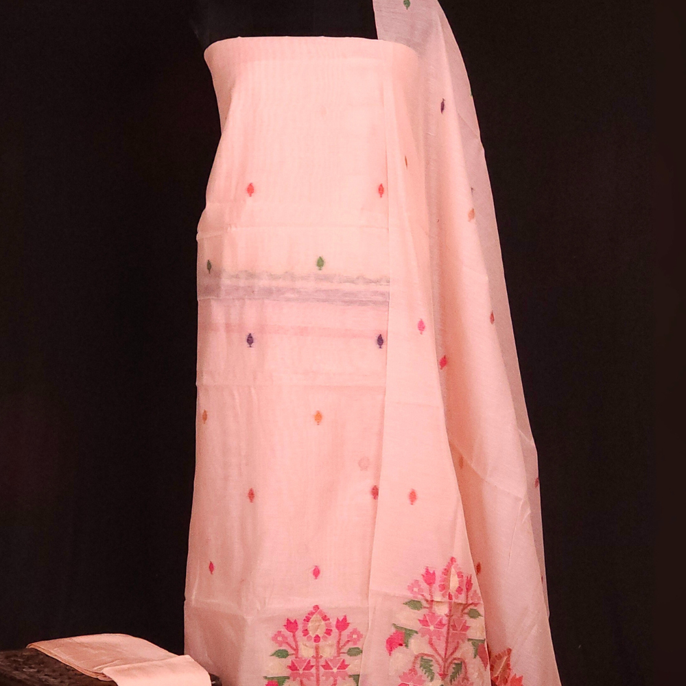 Elegant Chanderi top with allover thread motifs and floral Thread-woven bunches, paired with a plain bottom and a richly woven dupatta paired with tassels.....