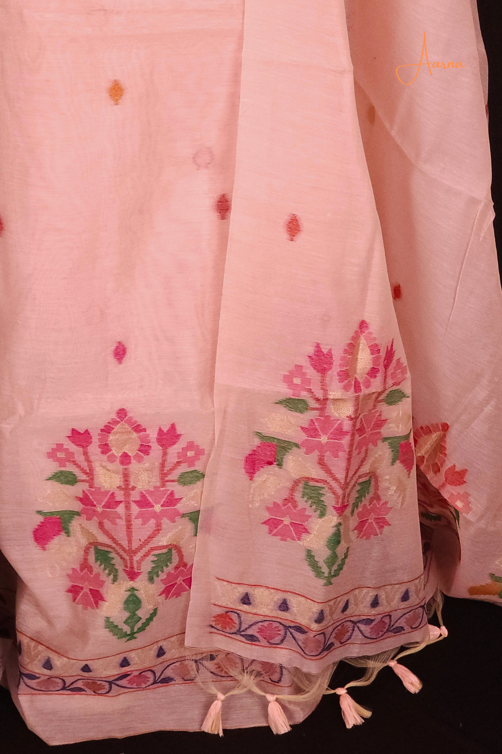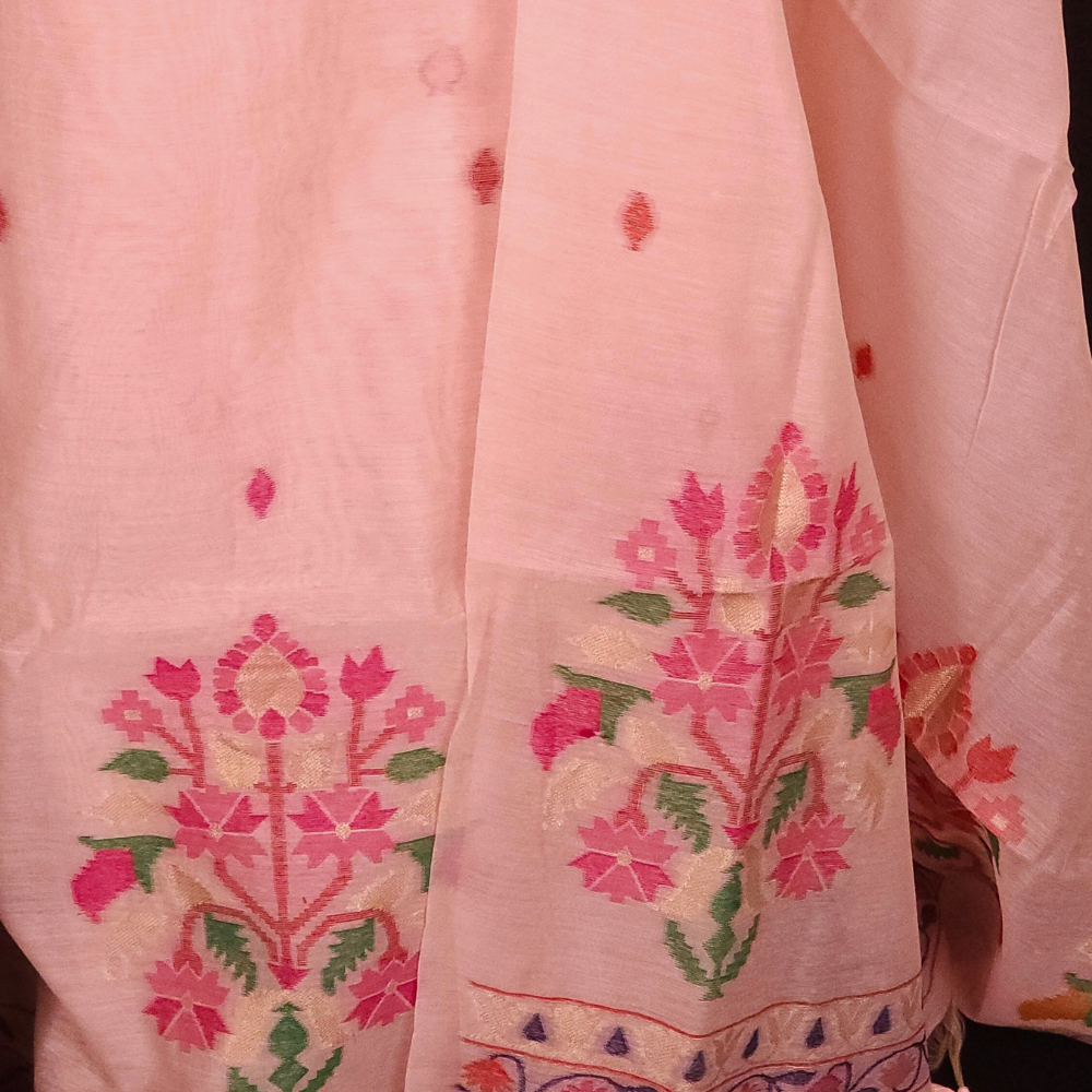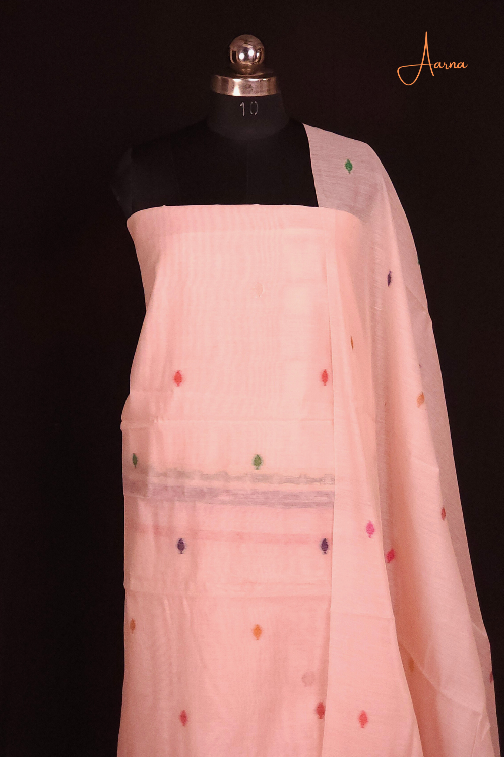 Elegant Chanderi top with allover thread motifs and floral Thread-woven bunches, paired with a plain bottom and a richly woven dupatta paired with tassels.....