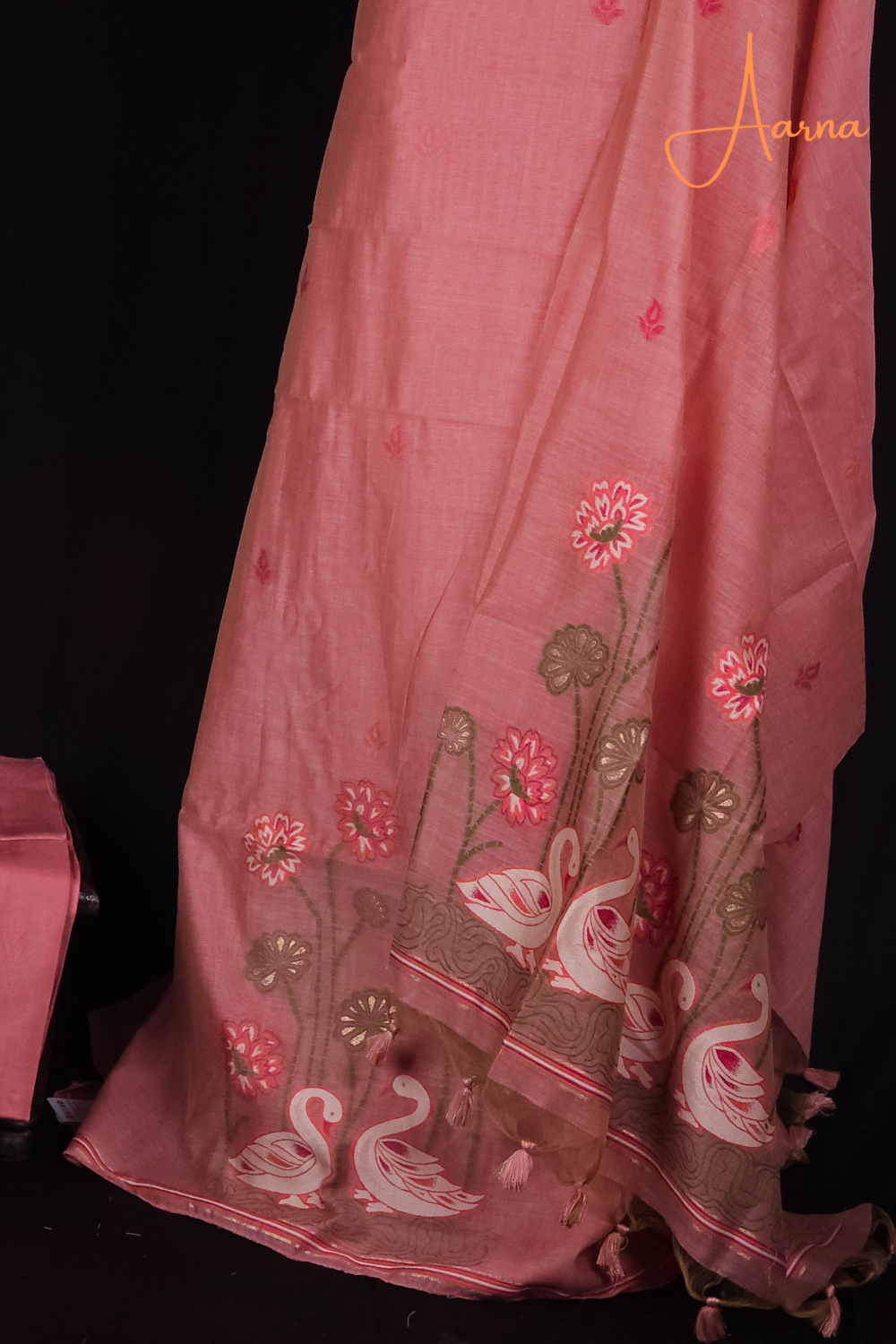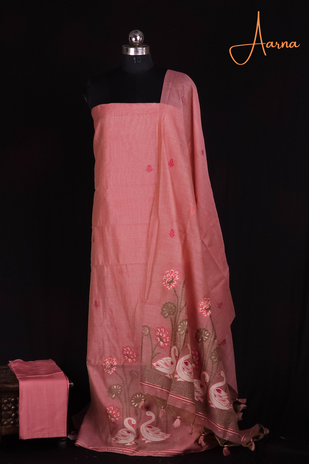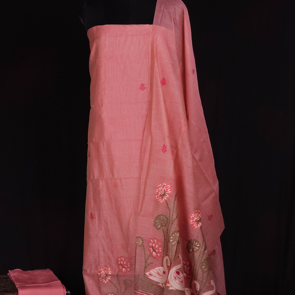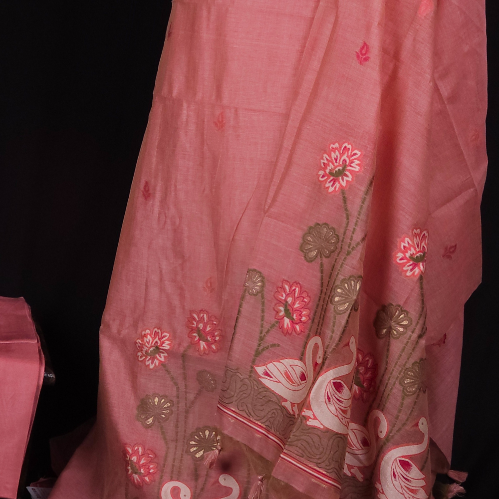 Elegant Chanderi with unique artistic pattern featuring floral and swan designs, styled beautifully.Paired with a dupatta and a bottom for a bold, contemporary look