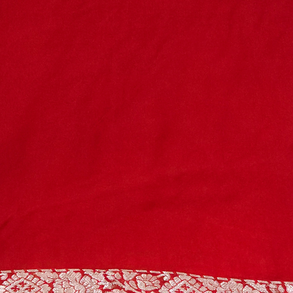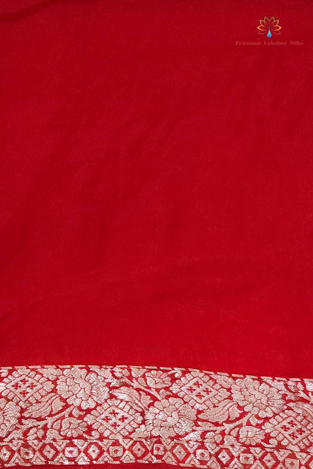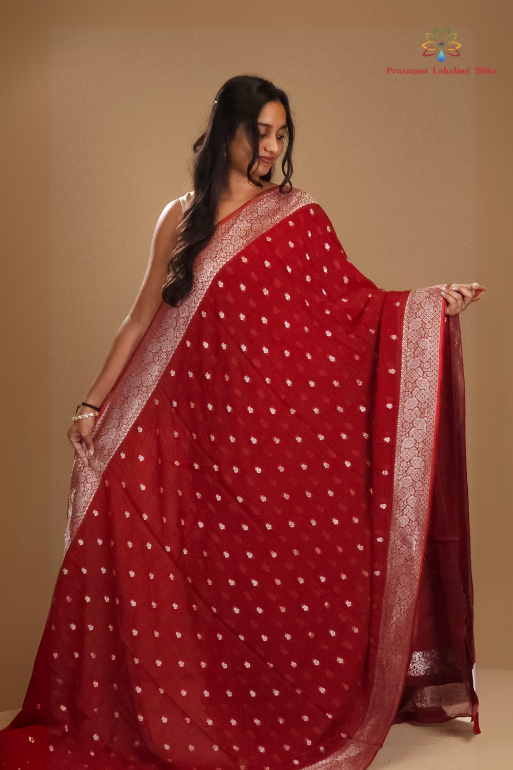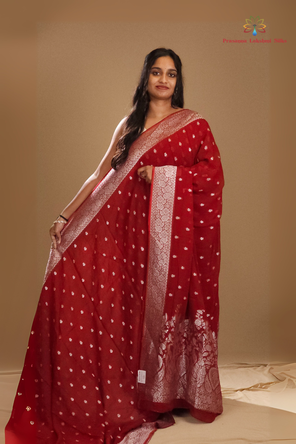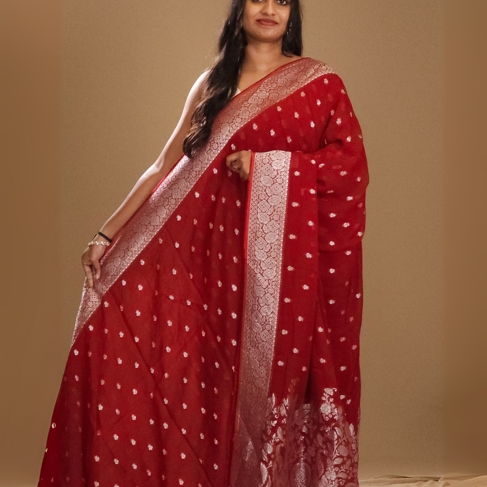 Experience the luxury of our Georgette Saree, featuring allover small silver zari woven buttas, zari woven floral borders, and a rich brocade pallu. Paired with a running blouse......