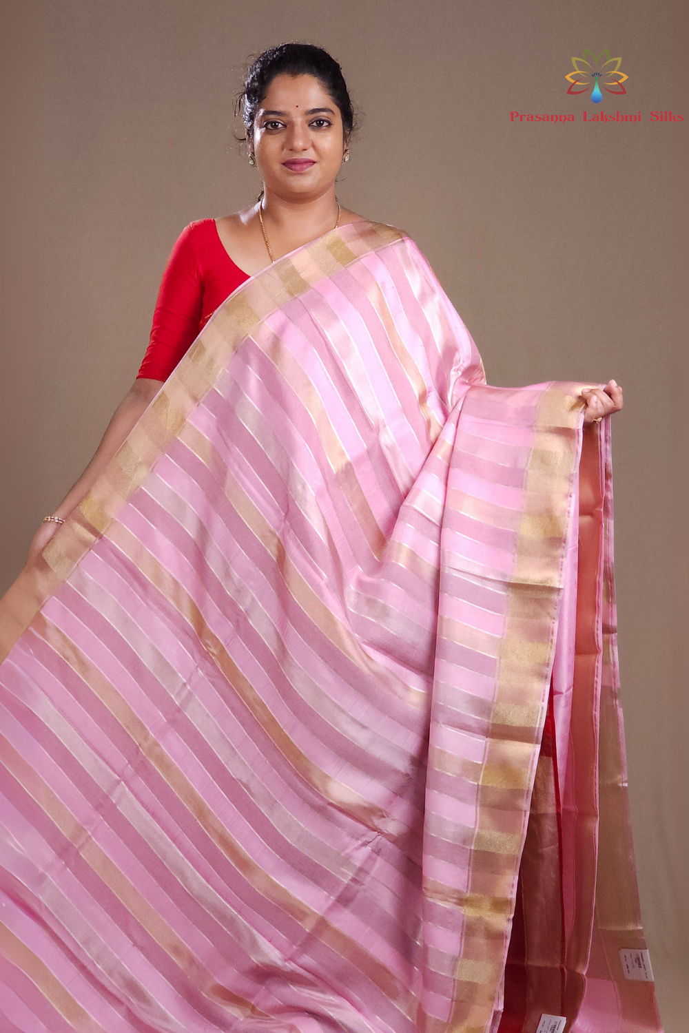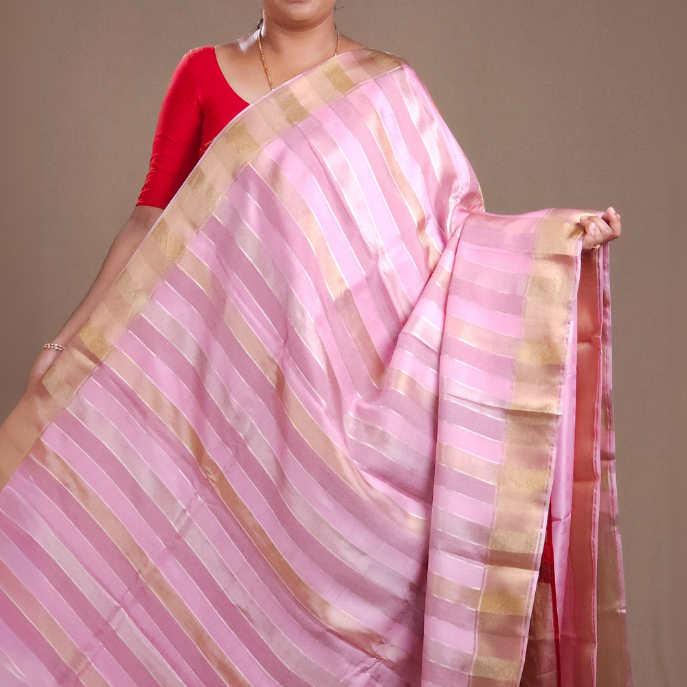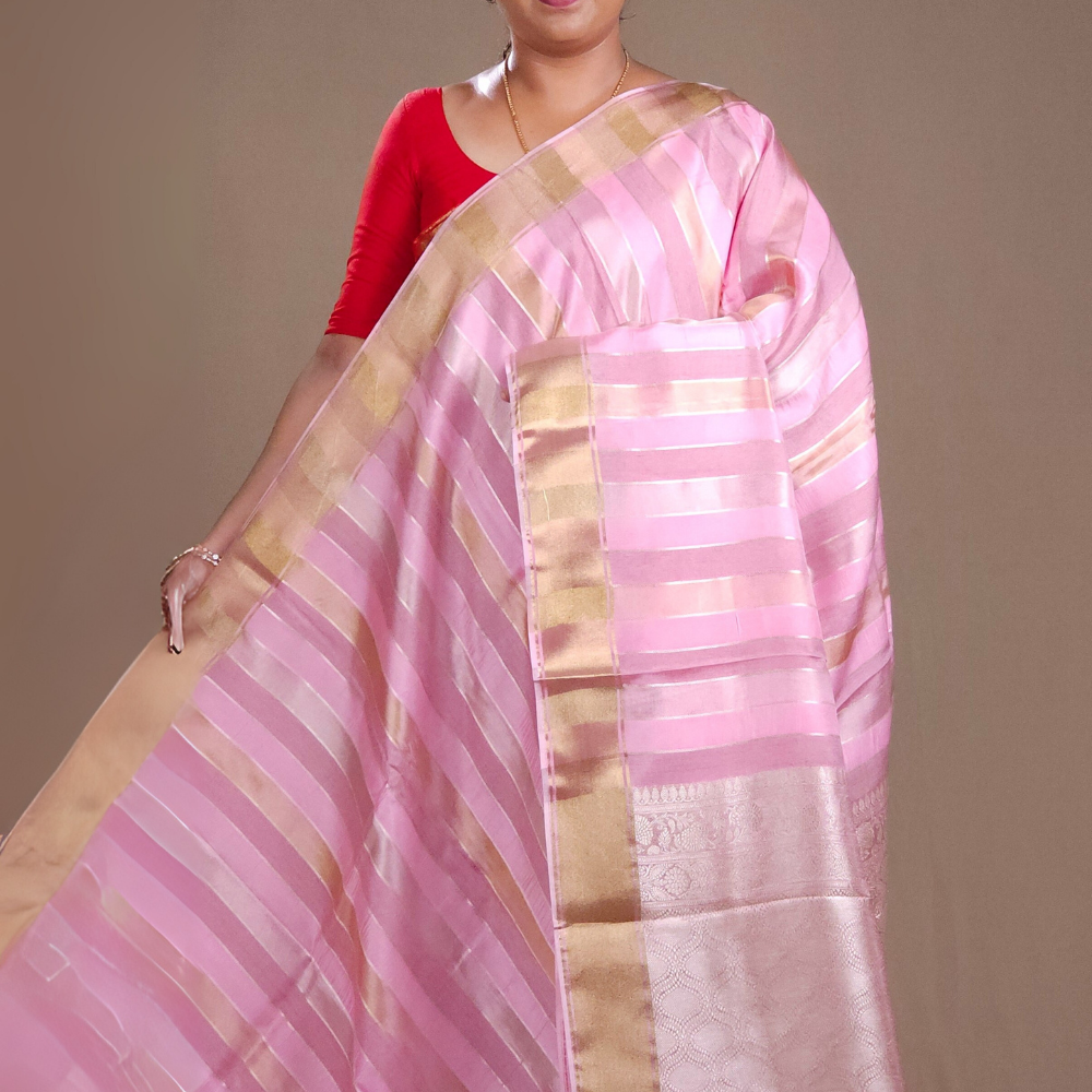 Experience effortless elegance in our Banarasi Munga Sarees,Adorned with straight-line zari borders, a rich brocade pallu, and paired with a running embossed blouse.