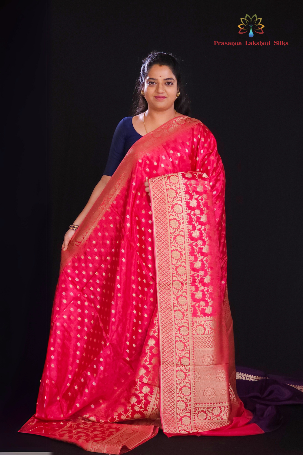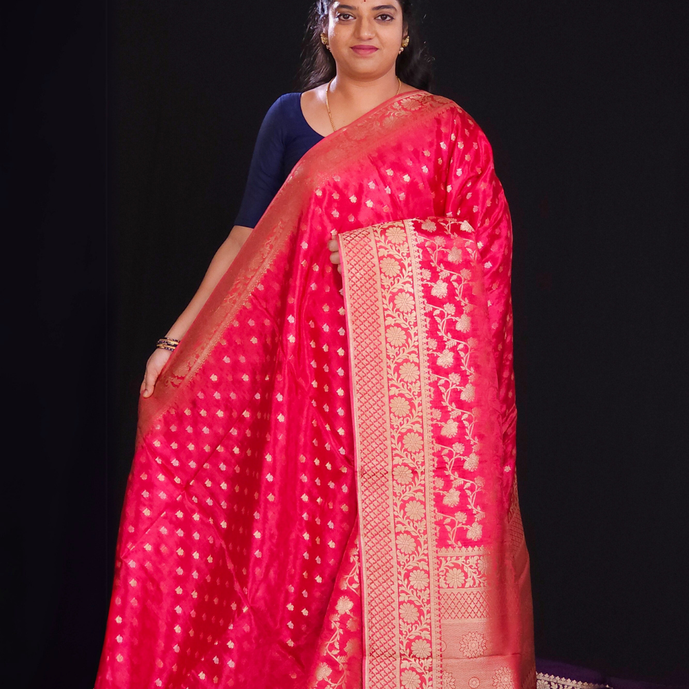 Elevate your style with our Banarasi Munga sarees features two types of rich brocade borders that add a royal touch to the saree. The body has elegant small motifs spread all over, while the pallu is crafted with rich zariwoven brocade and comes with a striking contrast blouse with borders.....