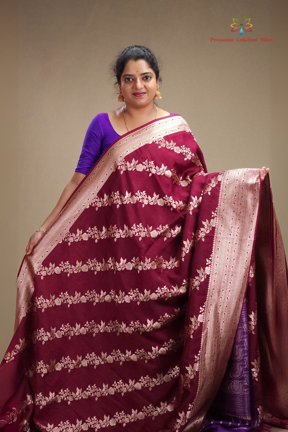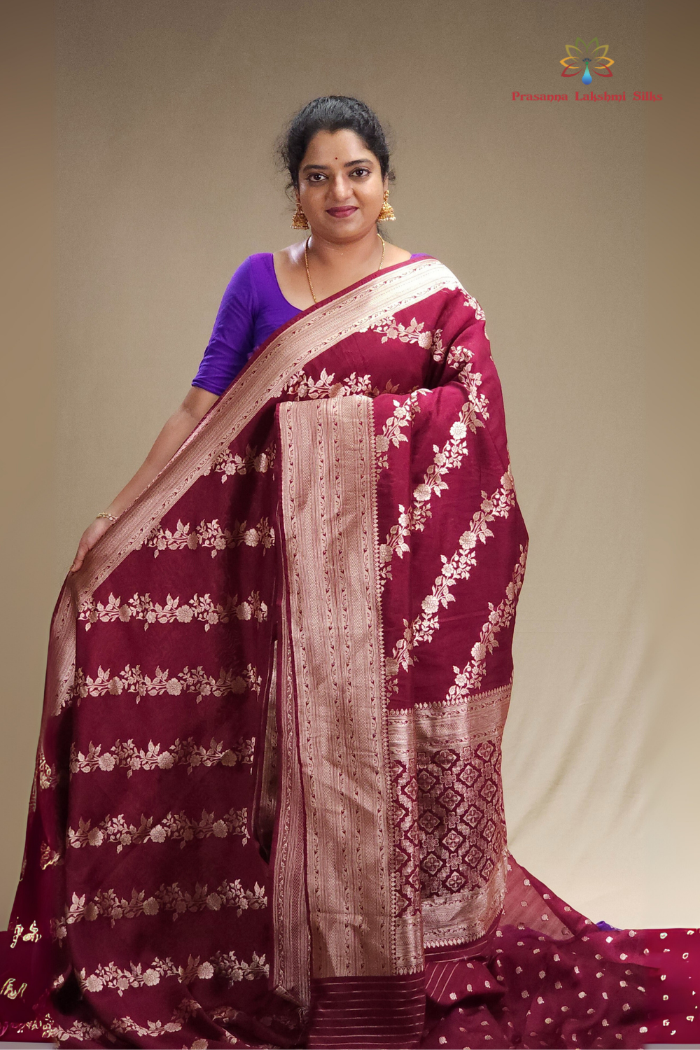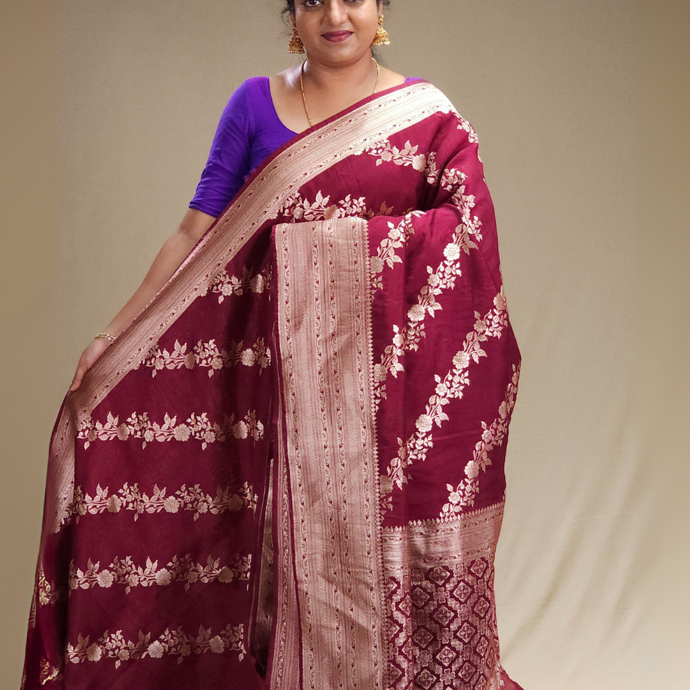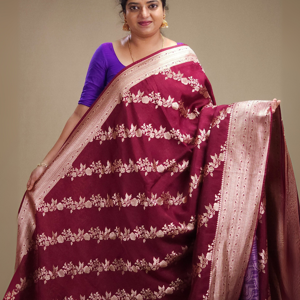 Experience timeless elegance with our Banarasi sarees, beautifully crafted with allover floral zari woven Lehariya with zari-woven borders. A rich brocade pallu adds to the grandeur paired with a running blouse....