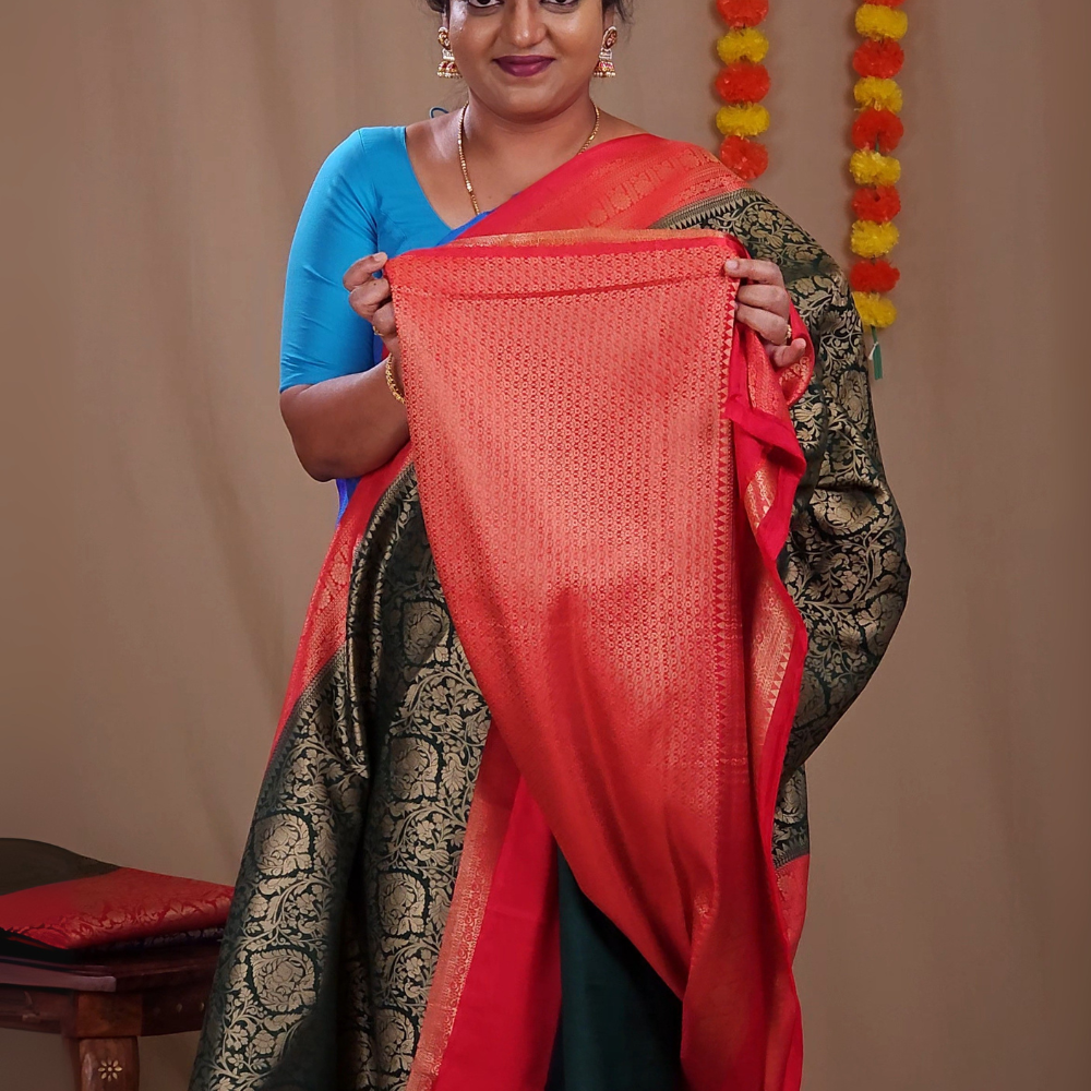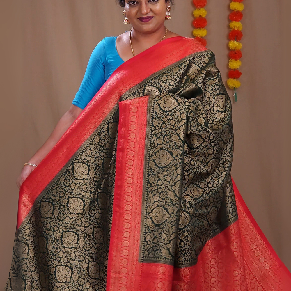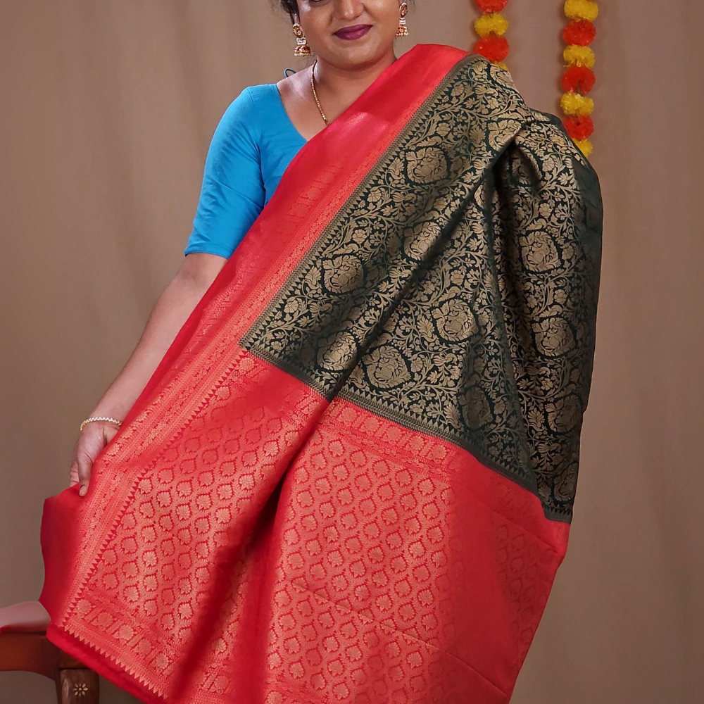 Experience timeless elegance with our Semi mysore silk, beautifully crafted with allover floral zari woven brocade with contrast zari-woven borders. A rich brocade pallu adds to the grandeur paired with a contrast blouse....