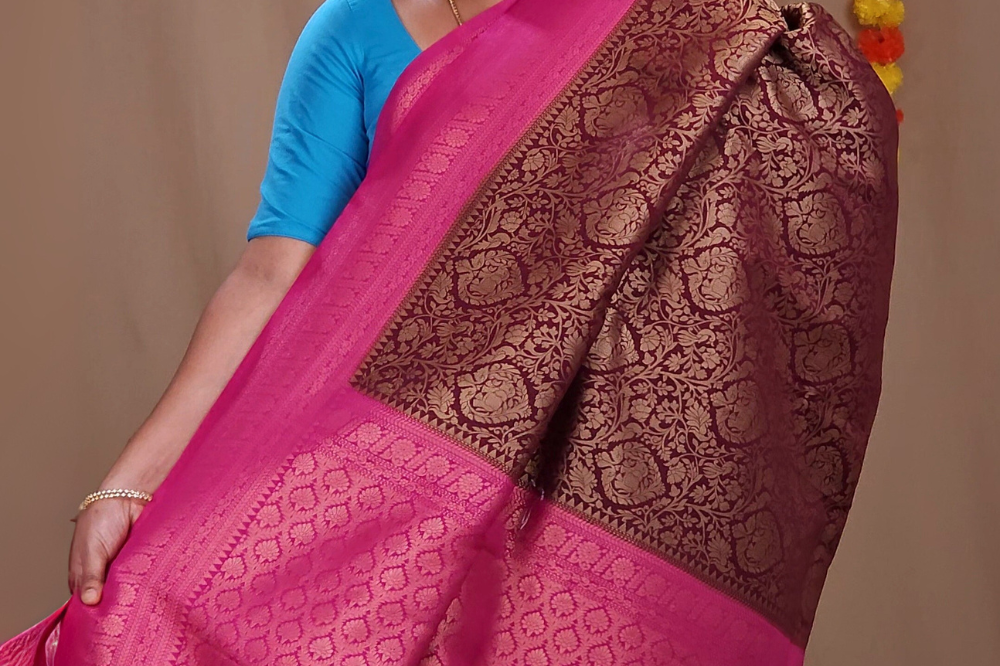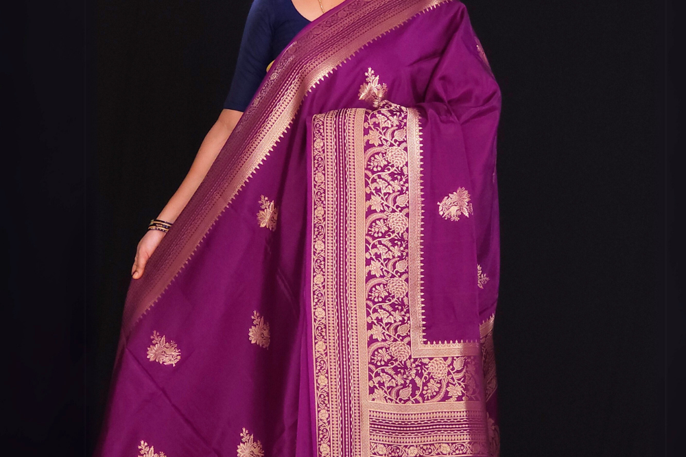 Dark baby pink & purple Banaras Crepe Silk Saree