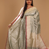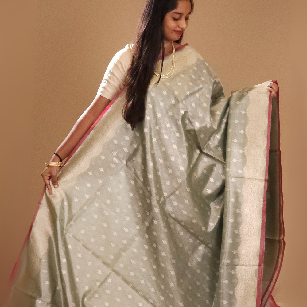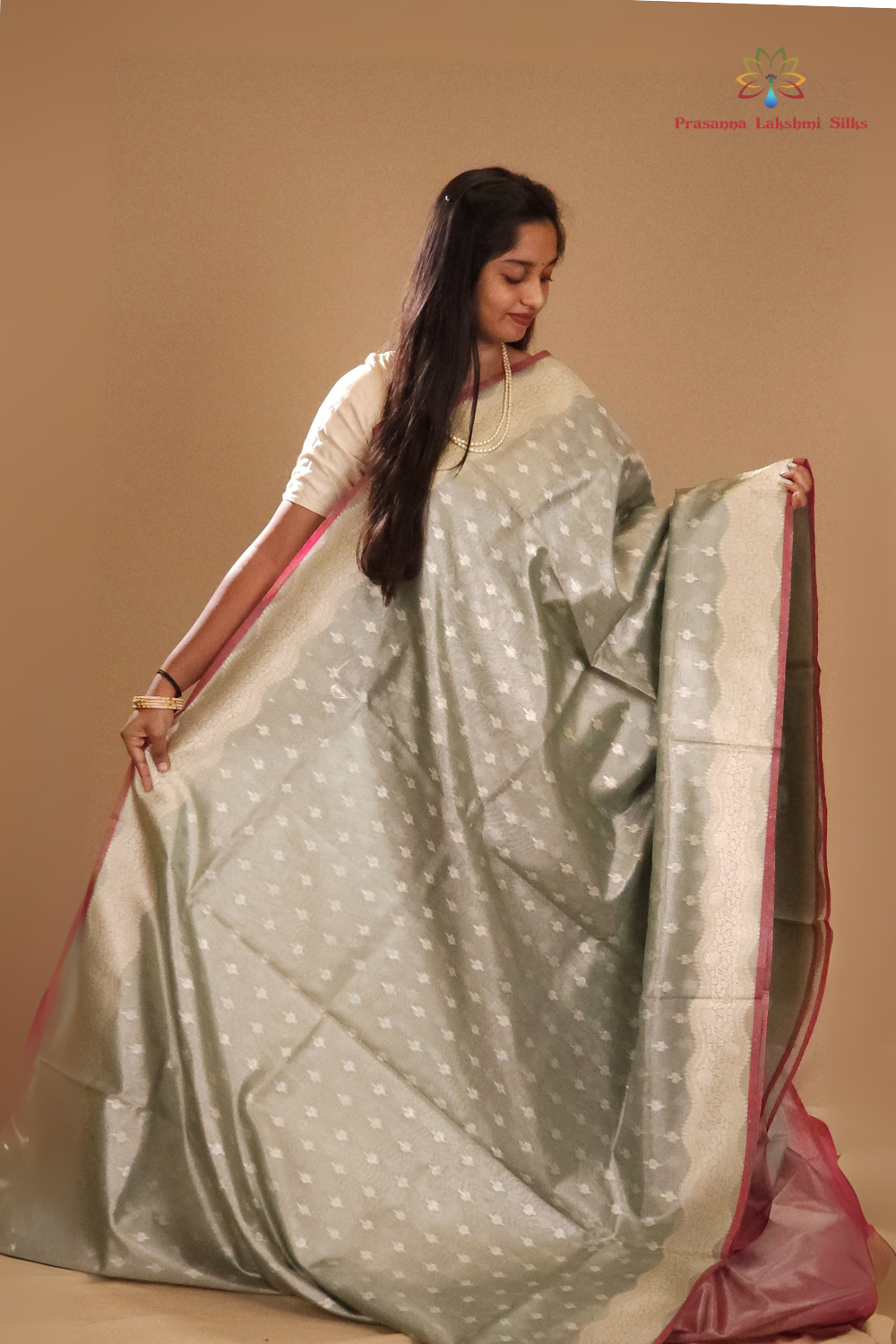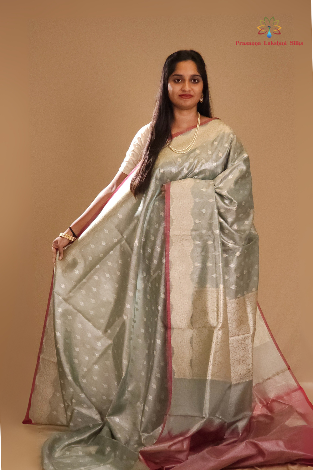 Elegant Banarasi Tissue Saree featuring allover gold and silver motifs, highlighted with uniquely designed antique zari-woven borders and a rich brocade pallu. Paired with a running blouse.....