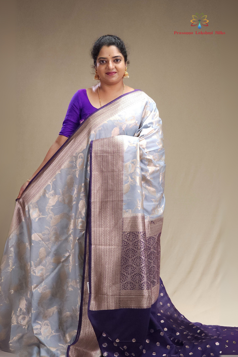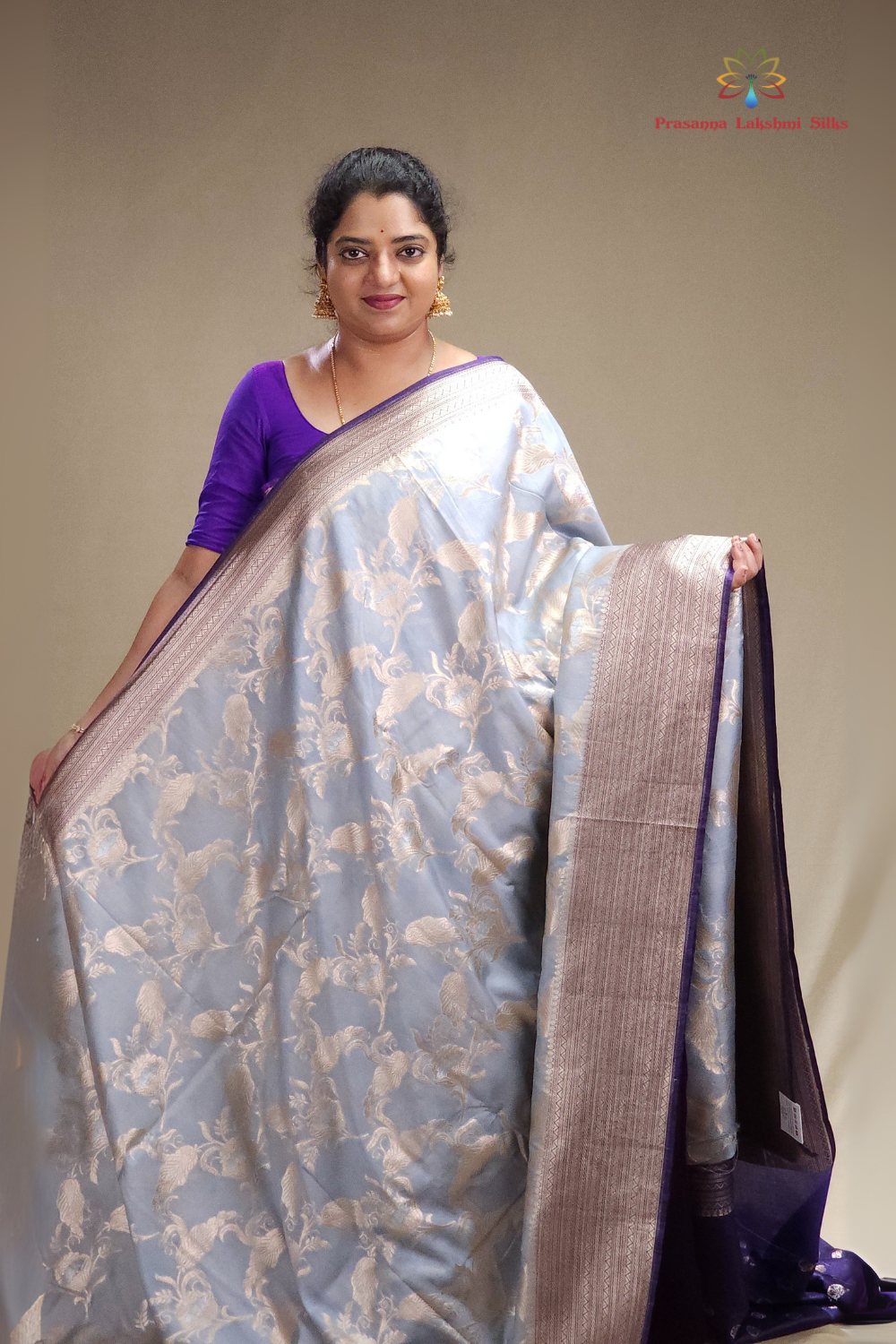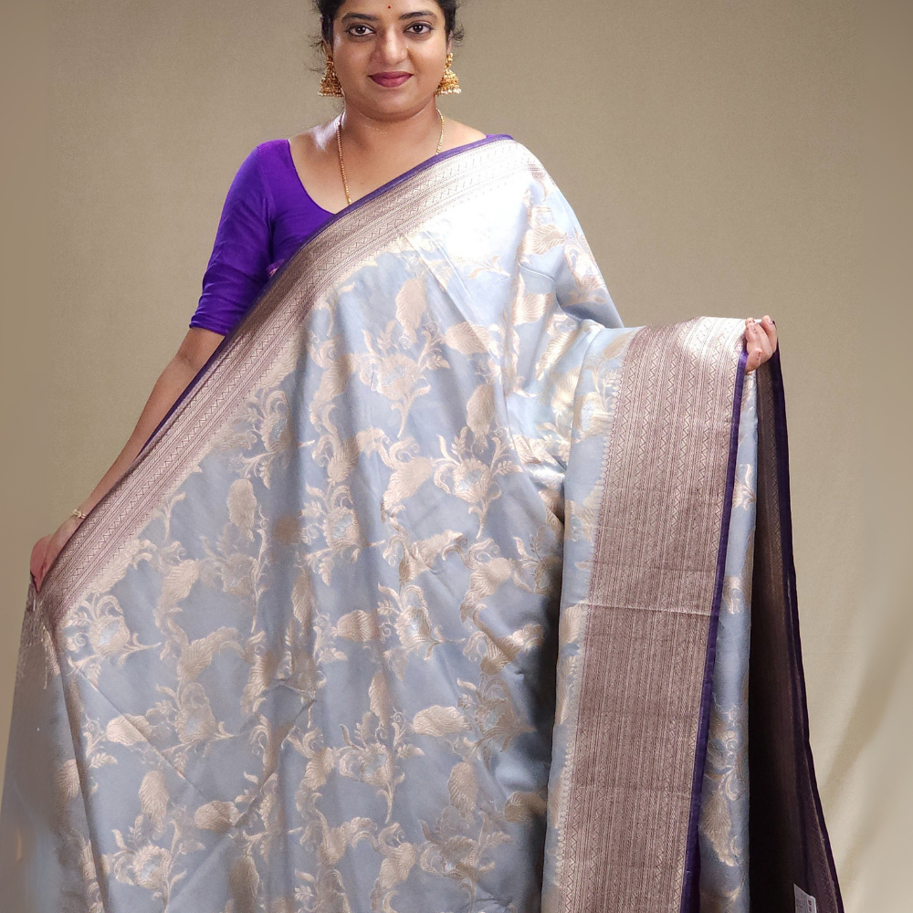 Experience timeless elegance with our Banarasi sarees, beautifully crafted with allover floral zari woven brocade with contrast zari-woven borders. A rich brocade pallu adds to the grandeur paired with a contrast blouse....
