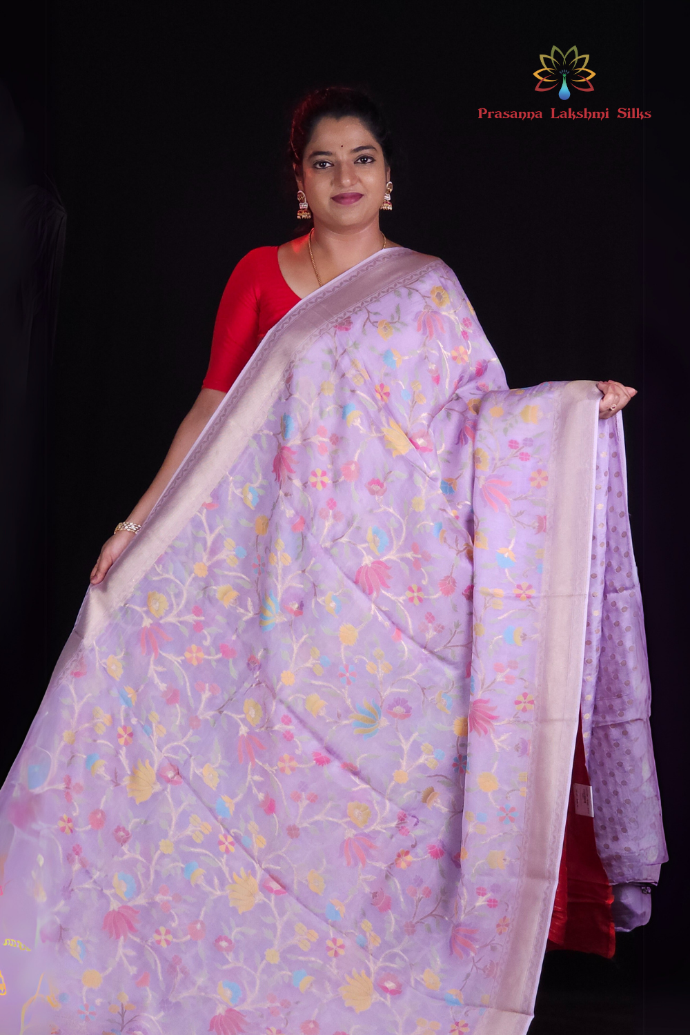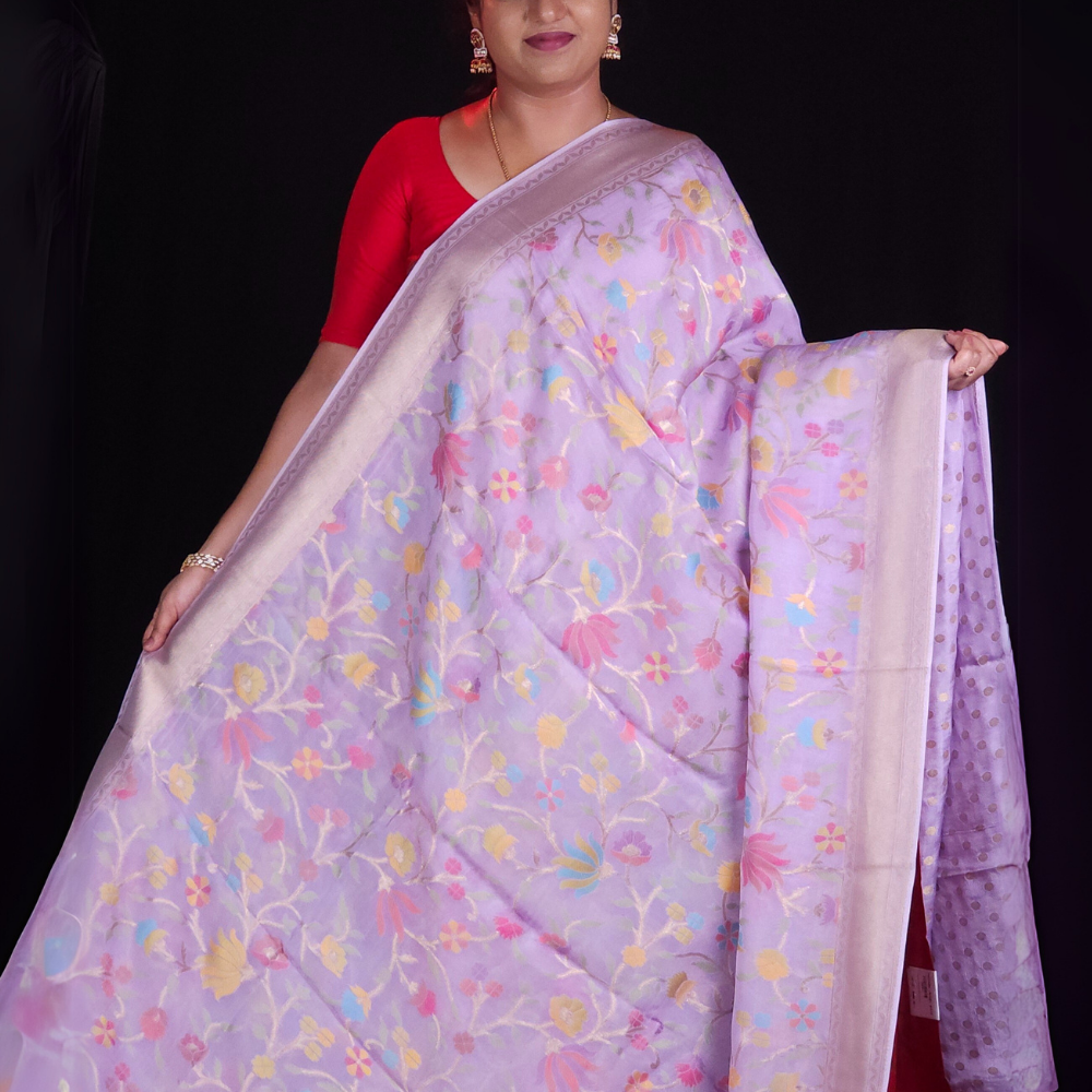 Organza saree Allover meenakaari floral weaving that looks rich and elegant, paired with gorgeous zari khaddi borders and a rich pallu.