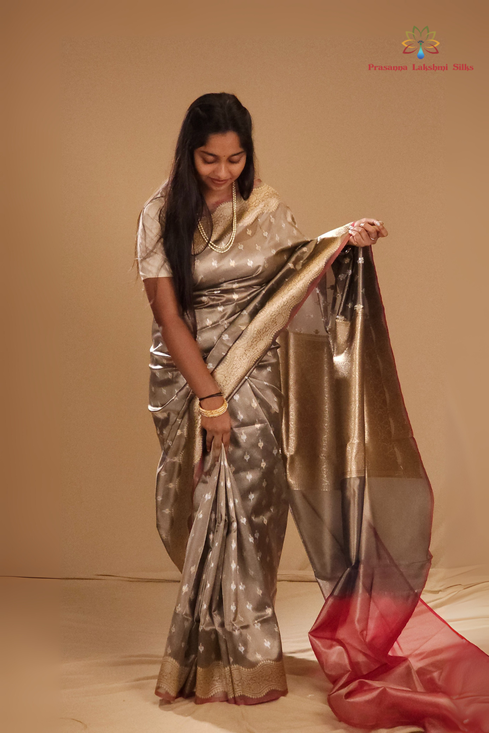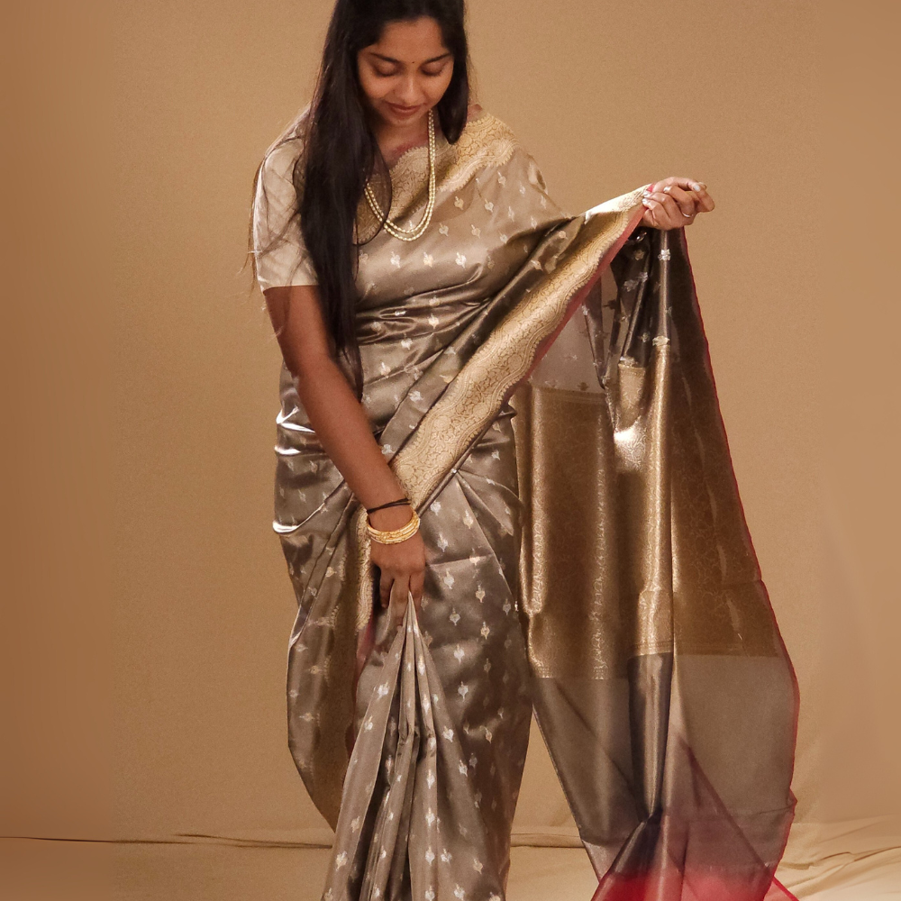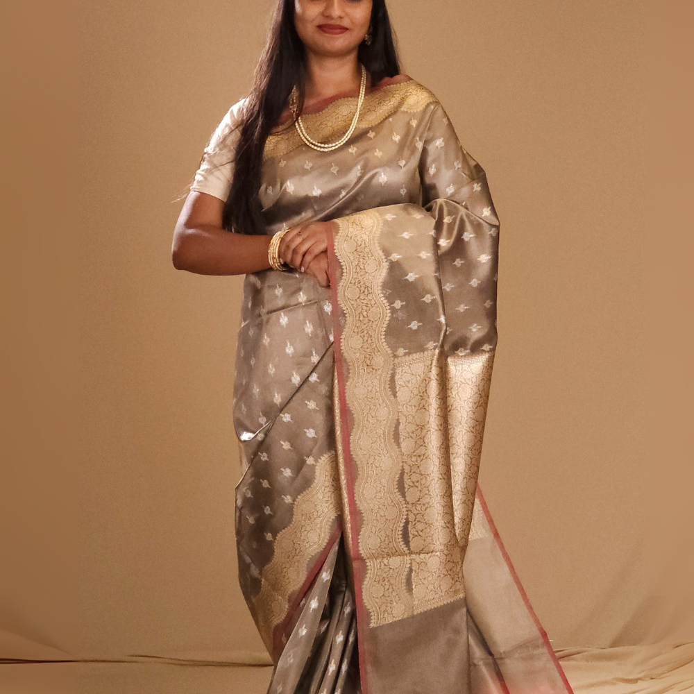 Elegant Banarasi Tissue Saree featuring allover gold and silver motifs, highlighted with uniquely designed antique zari-woven borders and a rich brocade pallu. Paired with a running blouse.....