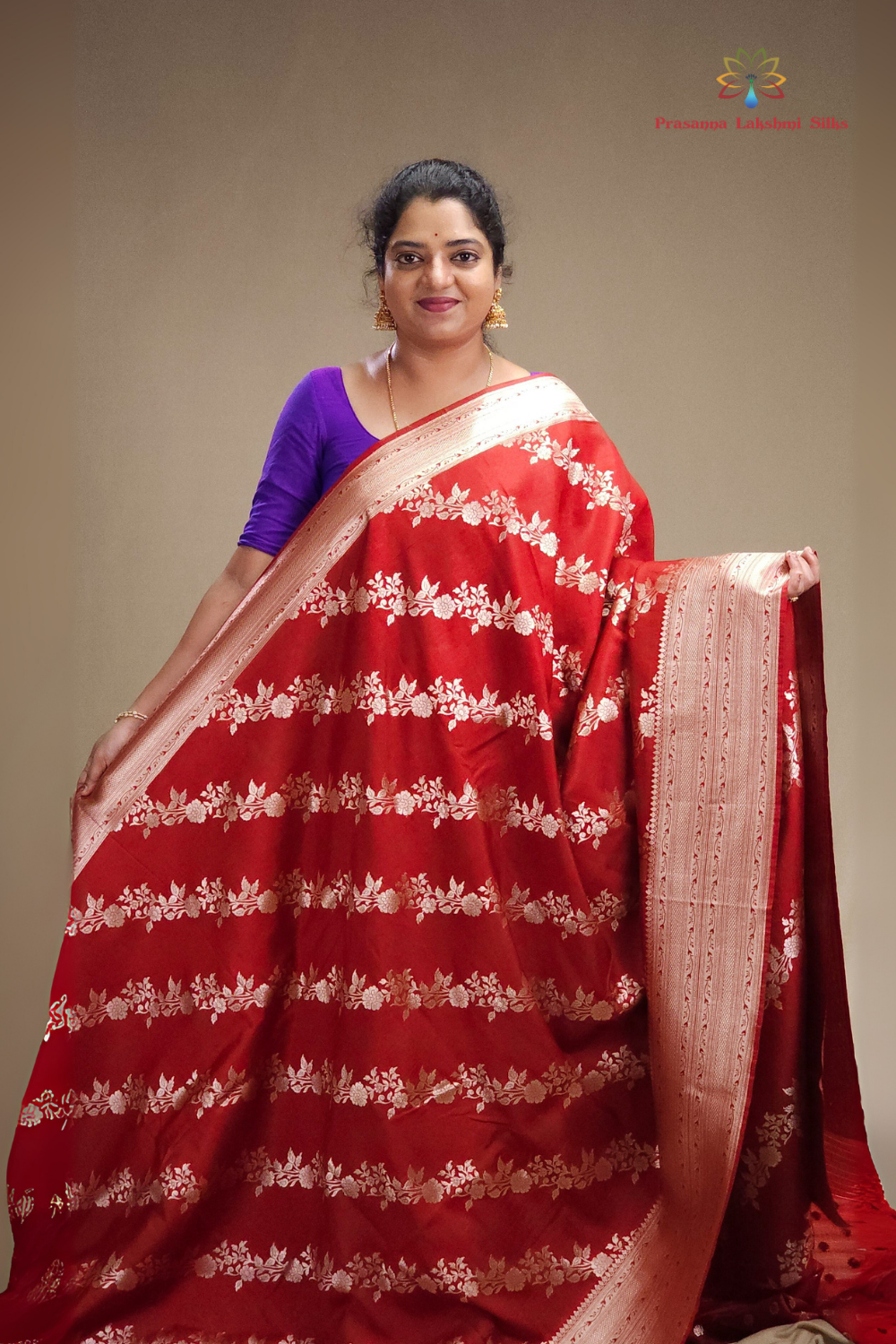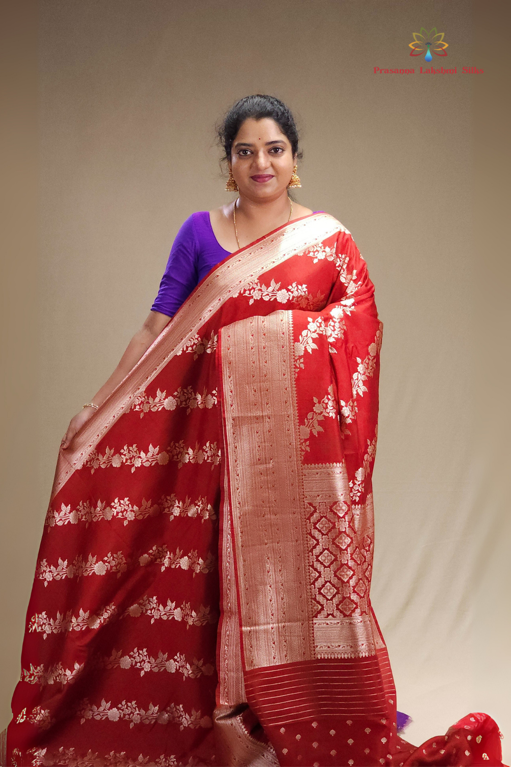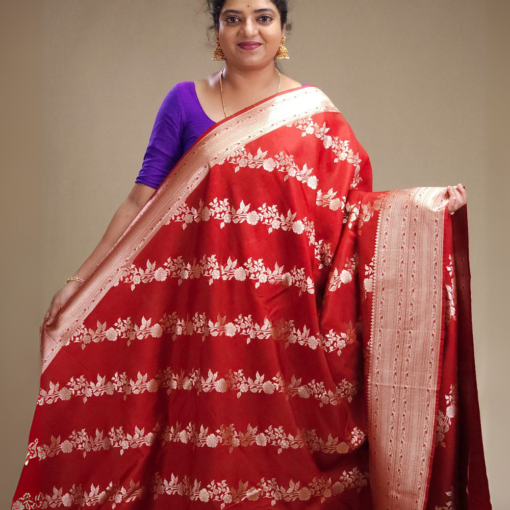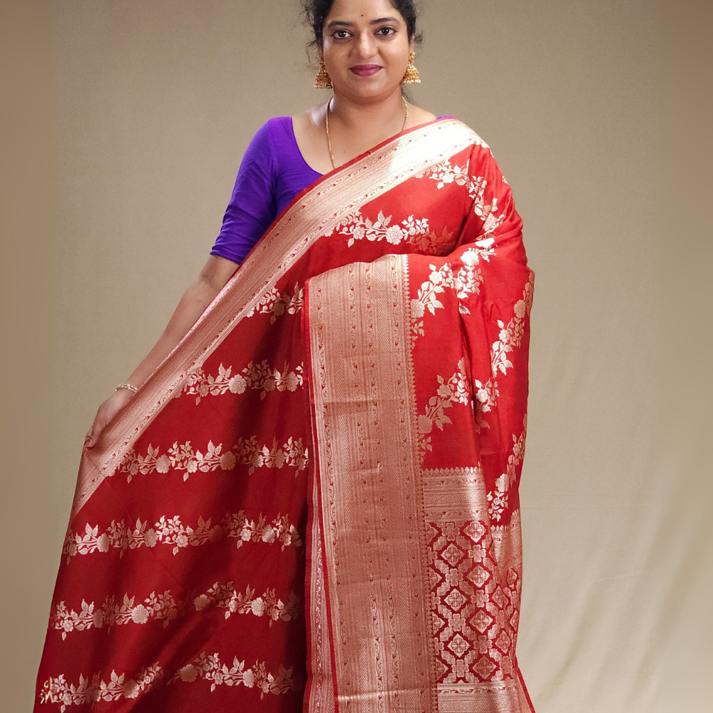 Experience timeless elegance with our Banarasi sarees, beautifully crafted with allover floral zari woven Lehariya with zari-woven borders. A rich brocade pallu adds to the grandeur paired with a running blouse....