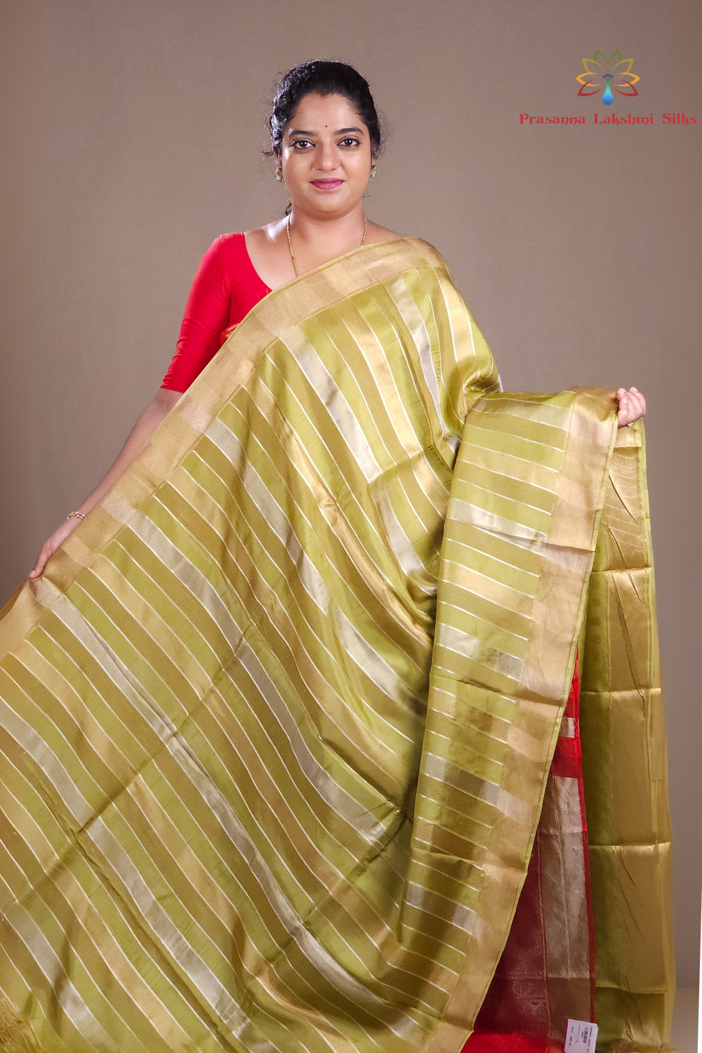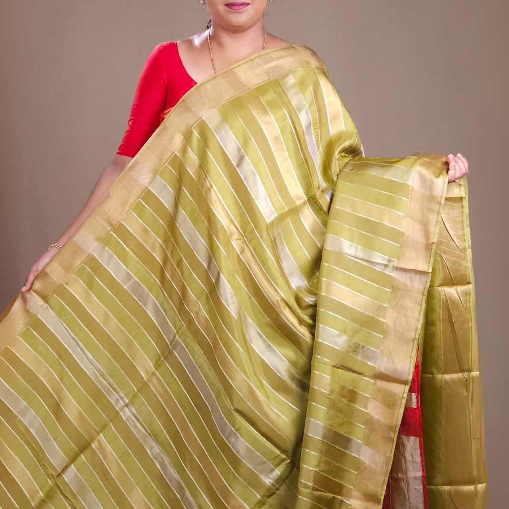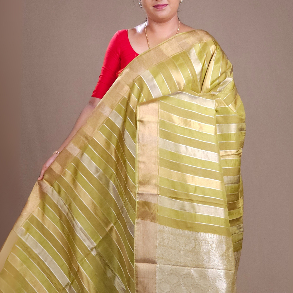 Experience effortless elegance in our Banarasi Munga Sarees,Adorned with straight-line zari borders, a rich brocade pallu, and paired with a running embossed blouse.