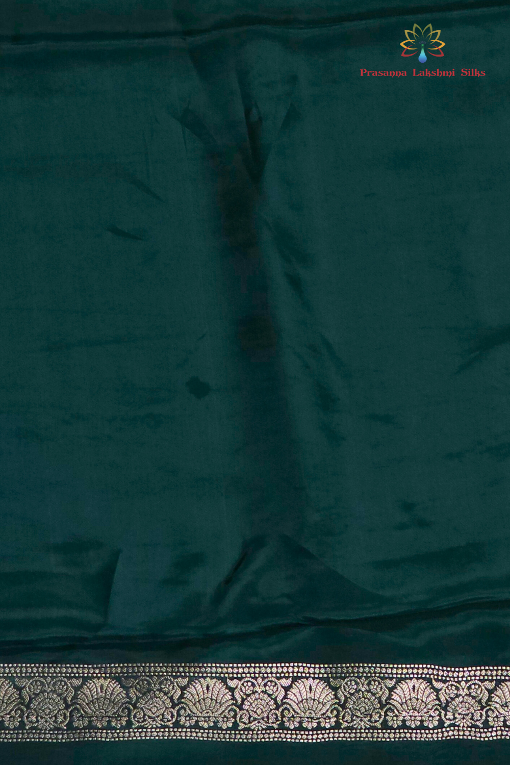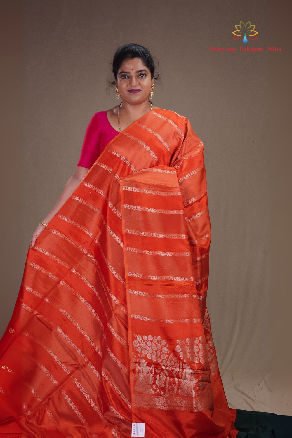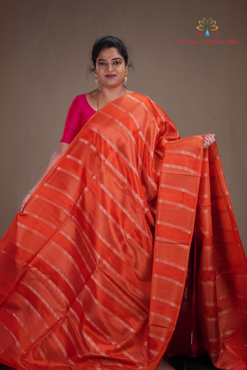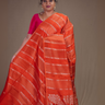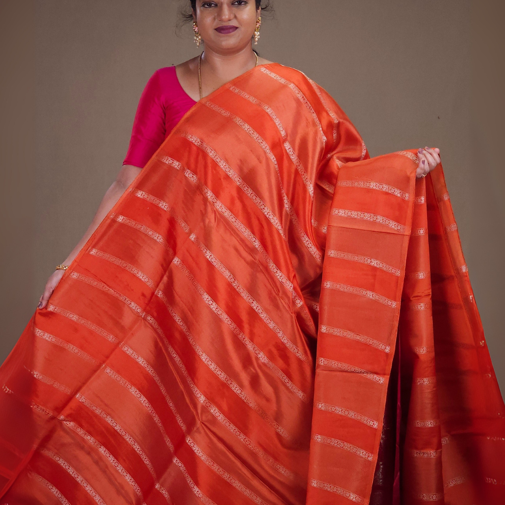 Experience the richness of Banarasi Munga sarees with vertical stripes one in classic Munga silk, the other in subtle tissue shimmer beautifully woven pallu with charming peacock motifs that add a graceful traditional touch.Paired with a contrast blouse with matching borders....
