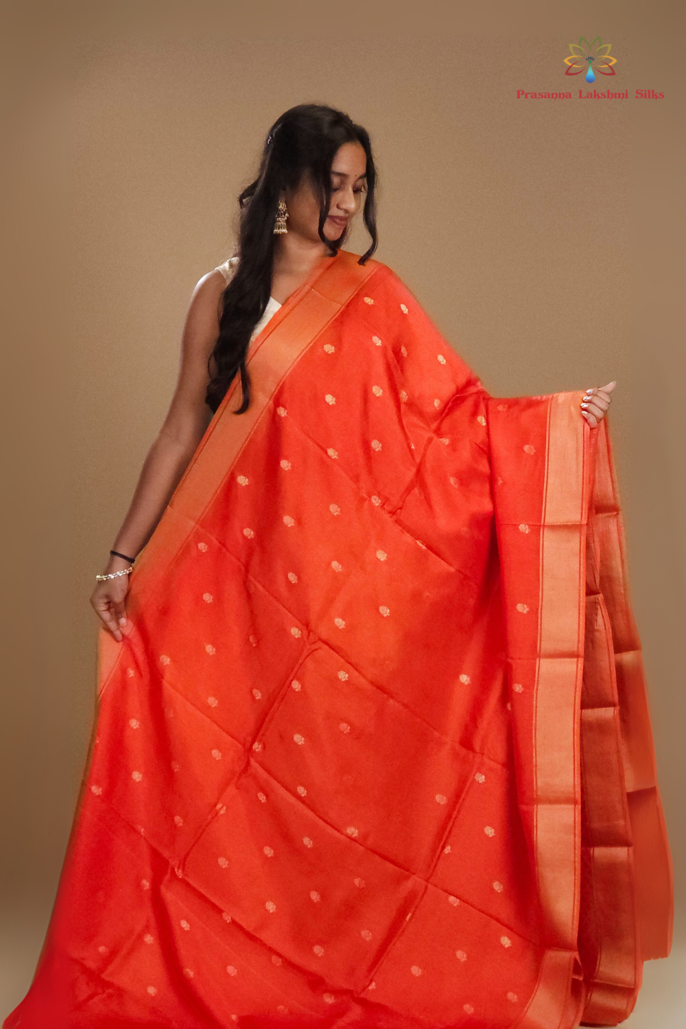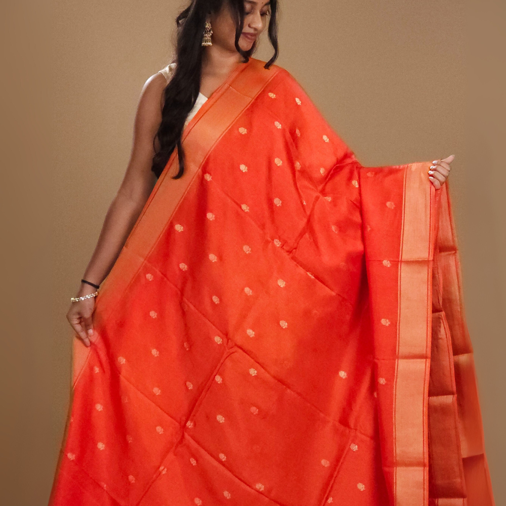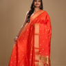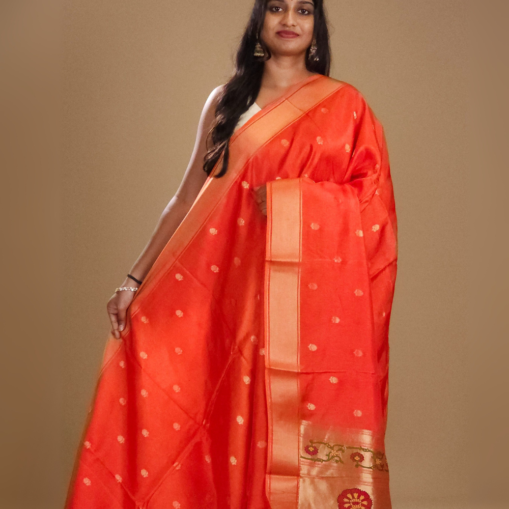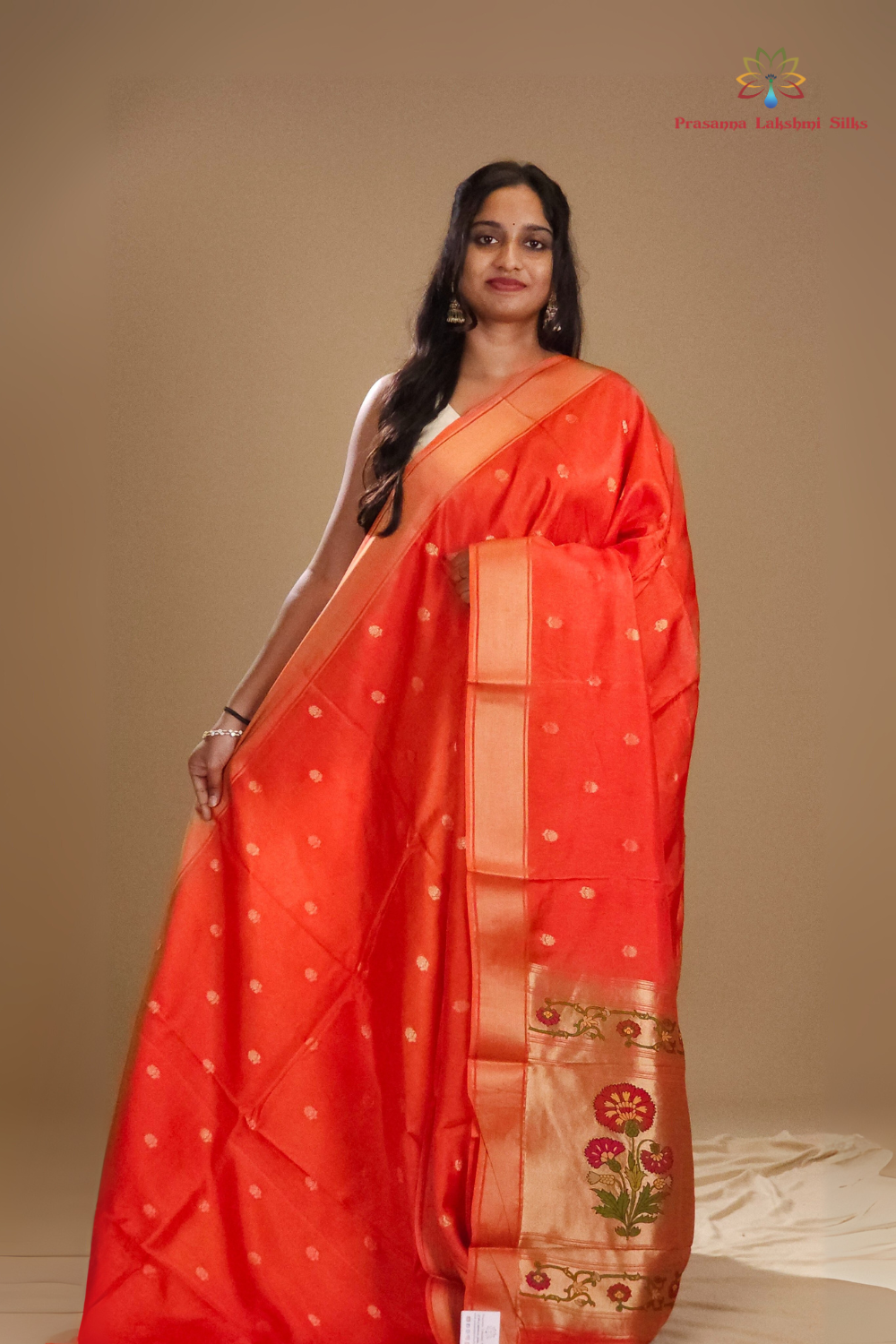 Experience the beauty of chanderi silk sarees, intricate allover small zari-woven motifs with zari-woven khaddi borders. The highlight of this chanderi saree is its rich tissue Paithani pallu,paired with a self-embossed blouse.......