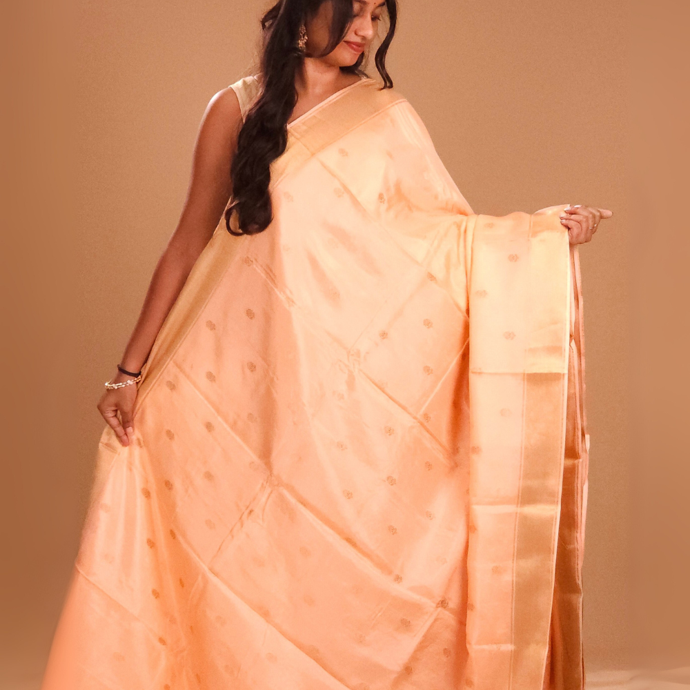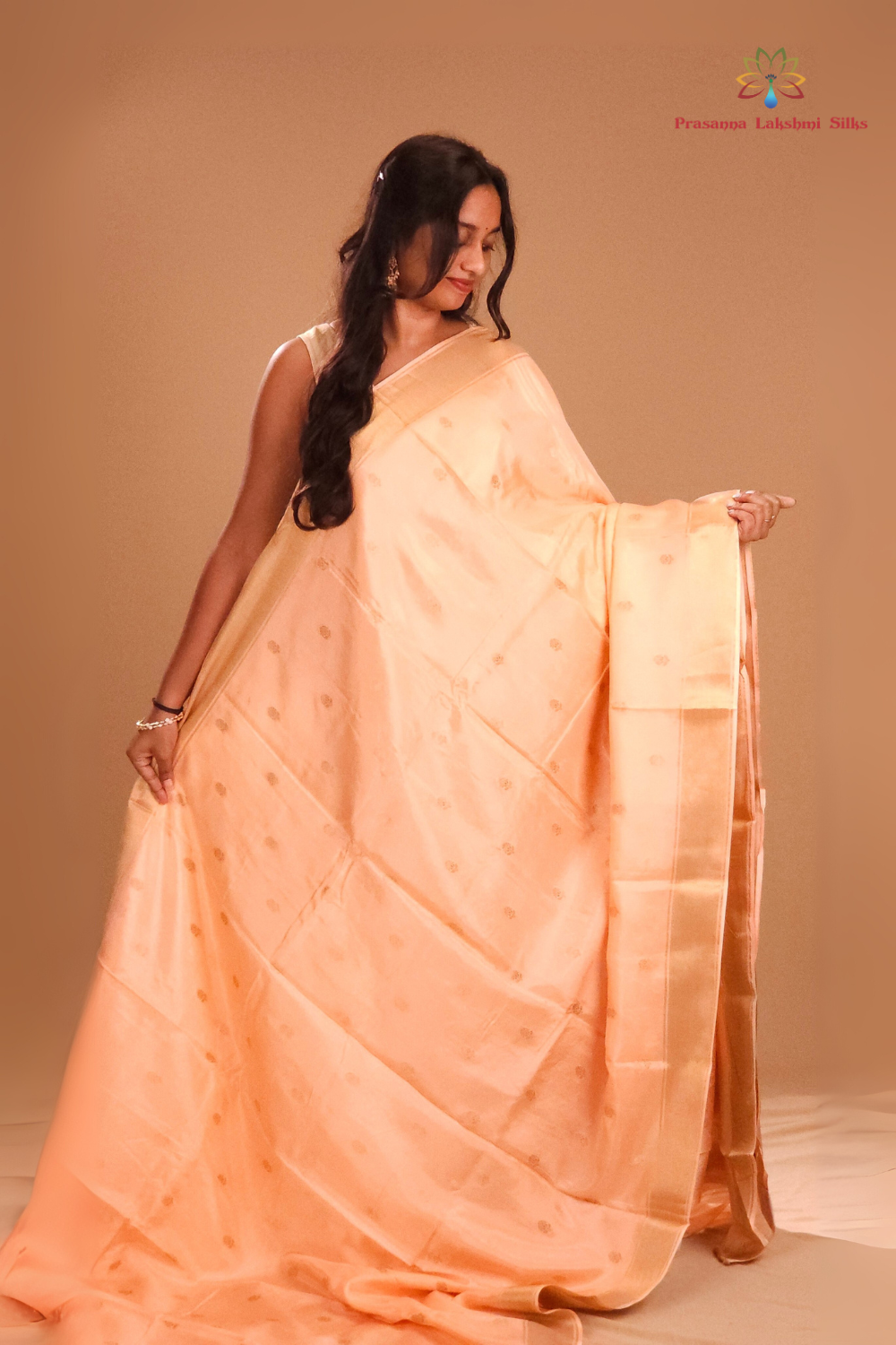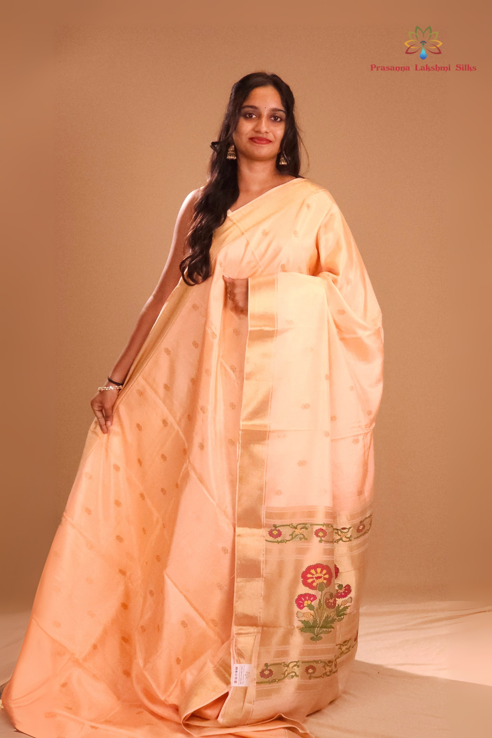 Experience the beauty of chanderi silk sarees, intricate allover small zari-woven motifs with zari-woven khaddi borders. The highlight of this chanderi saree is its rich tissue Paithani pallu,paired with a self-embossed blouse.......
