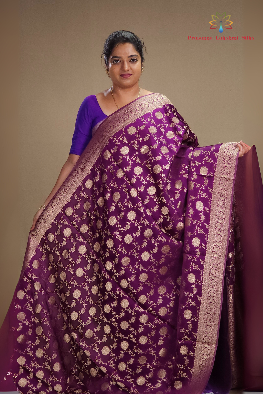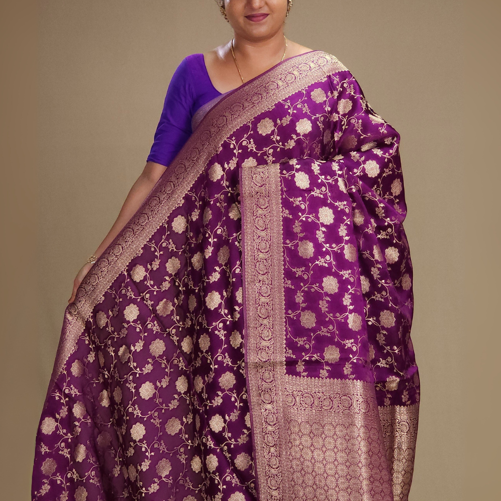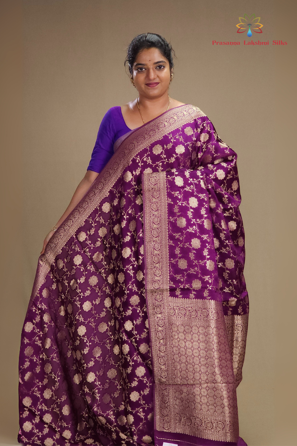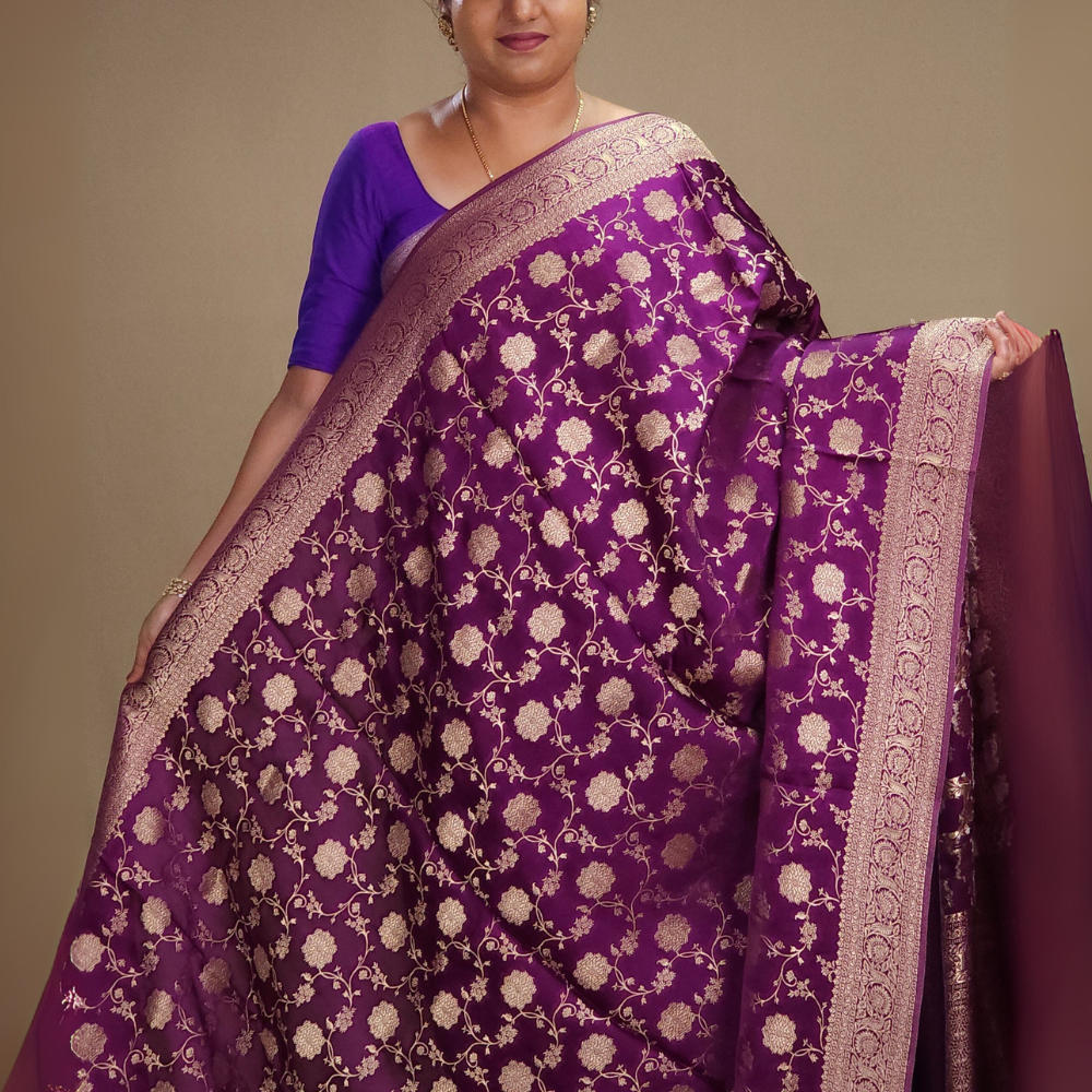 Elevate your style with our Banarasi Mashru silk sarees with floral borders that add a royal touch to the saree, allover the body rich floral brocade design, while the pallu is crafted with rich zariwoven brocade and comes with a running blouse .........