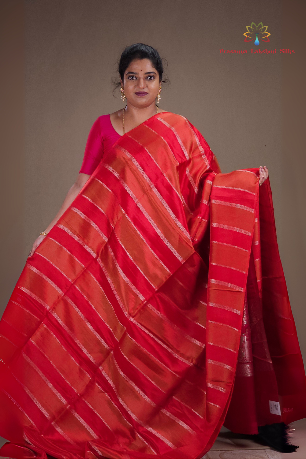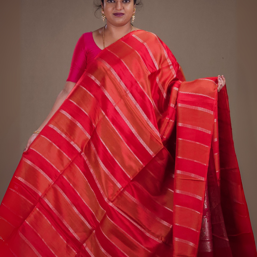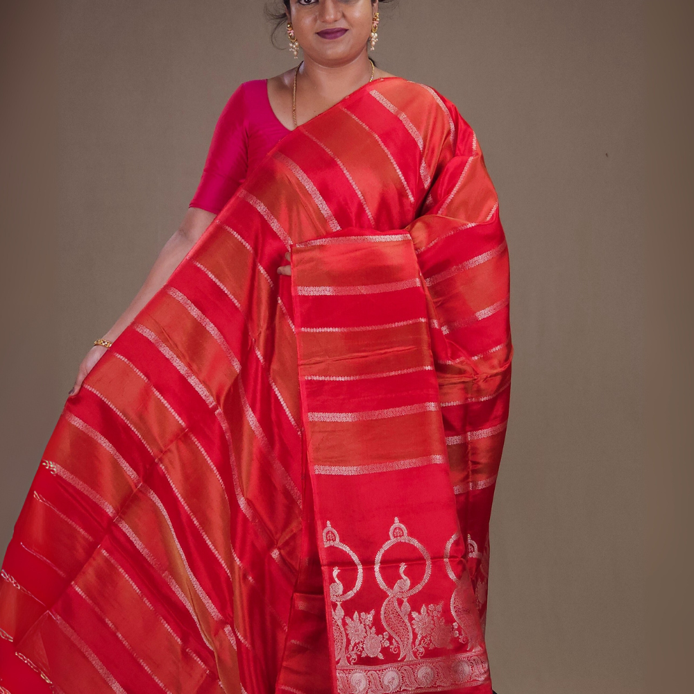 Experience the richness of Banarasi Munga sarees with vertical stripes one in classic Munga silk, the other in subtle tissue shimmer beautifully woven pallu with charming peacock motifs that add a graceful traditional touch.Paired with a contrast blouse with matching borders....