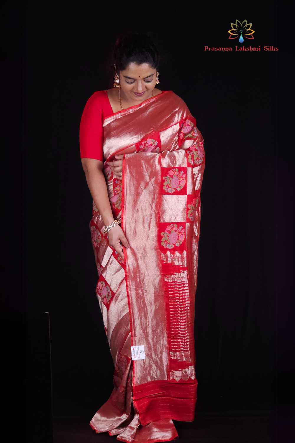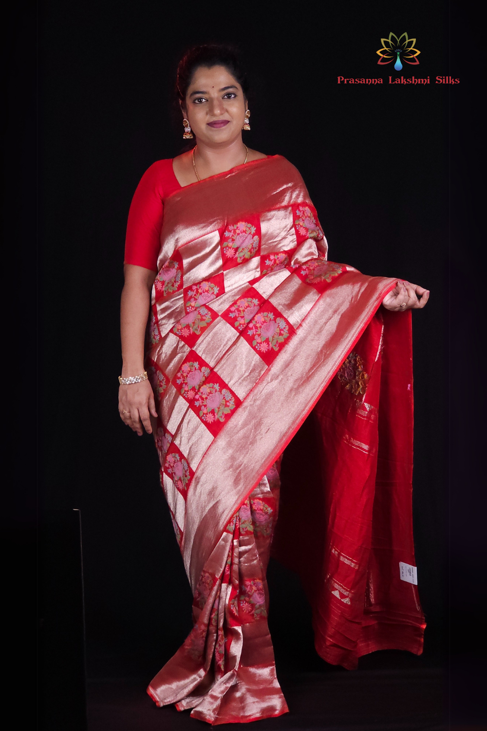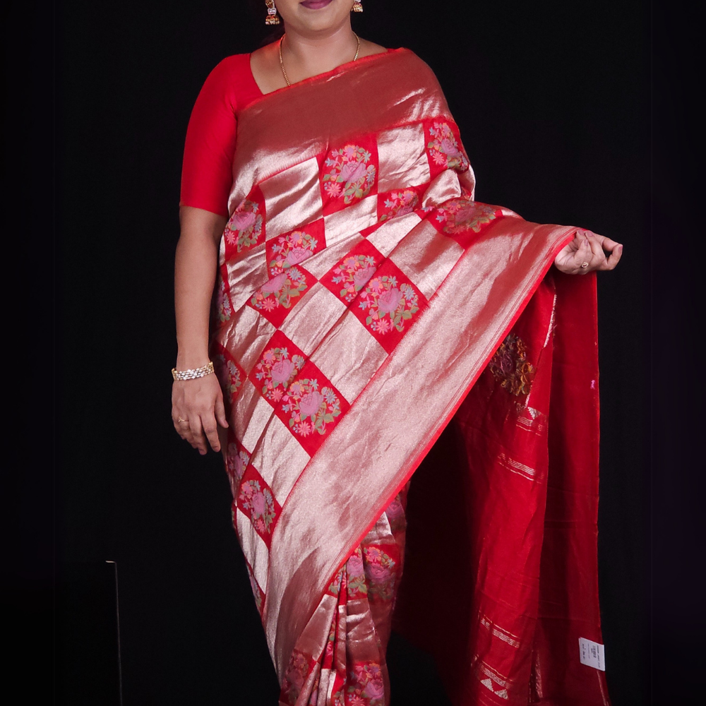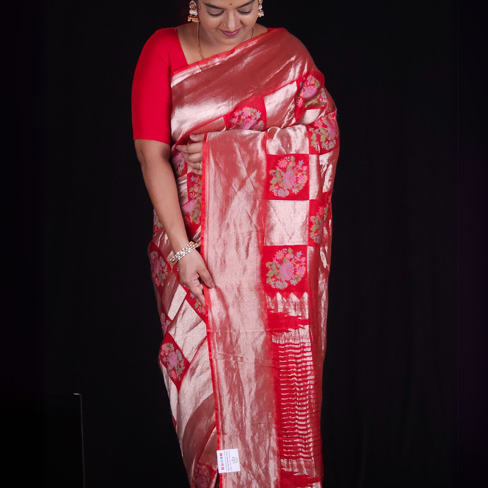 Stunning Mashru silk saree featuring big checks all over one box shines with tissue shimmer, and the next blooms with thread-woven floral motifs paired with tissue borders and rich tissue pallu paired with running blouse with zari woven motifs.....