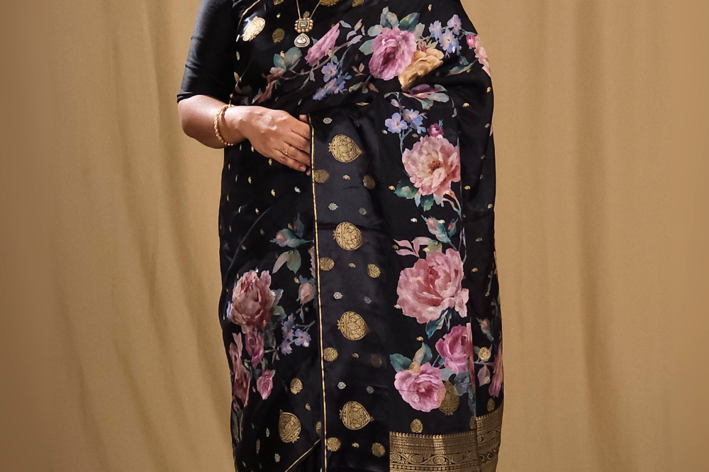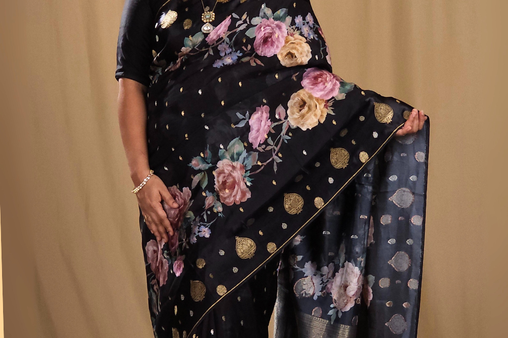 Black Satin Floral Saree