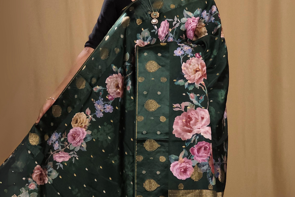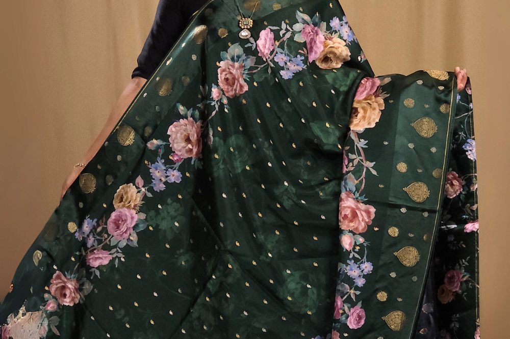 Green Satin Floral Saree