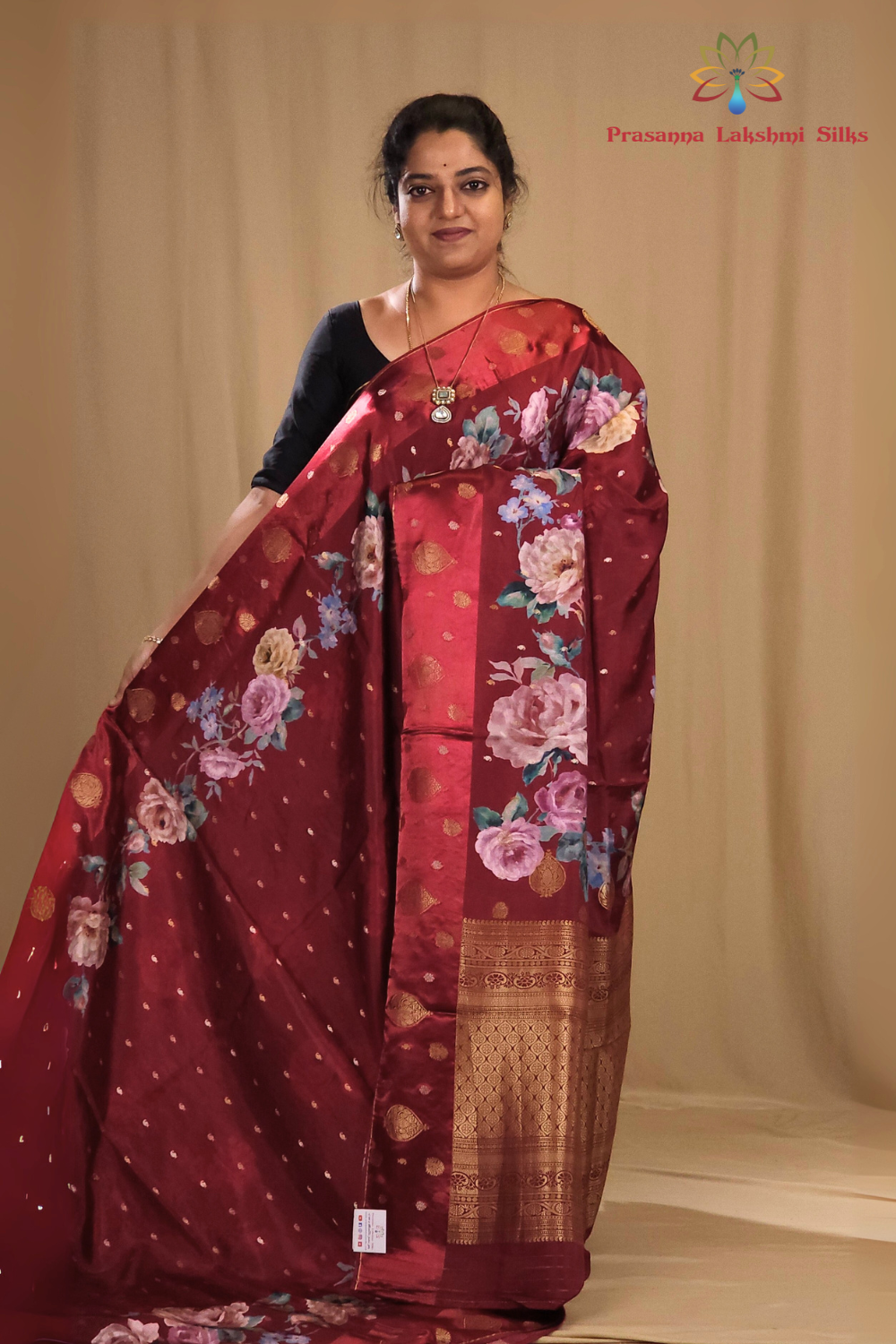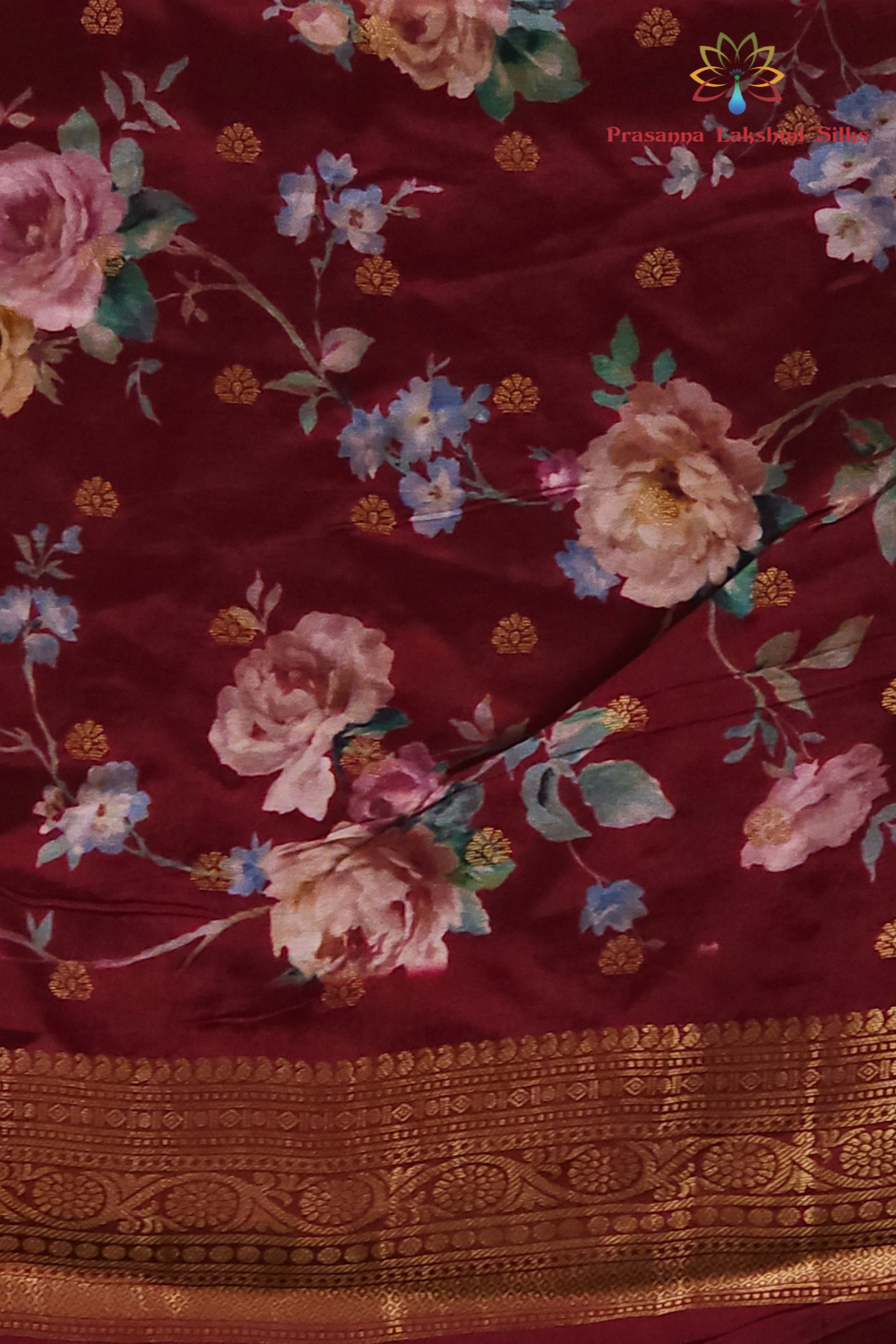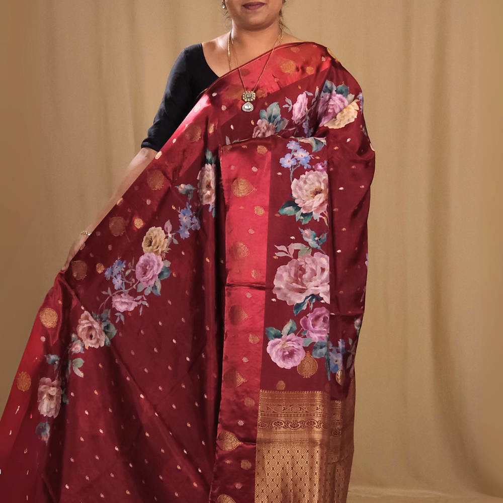 Elevate your style with our Banarasi Satin floral sarees with beautiful multicolor floral digital prints tiny zari woven mango motifs all over. The satin borders with gold and silver motifs make them look rich, and the zari pallu adds that festive charm. Paired with self floral digital blouse....