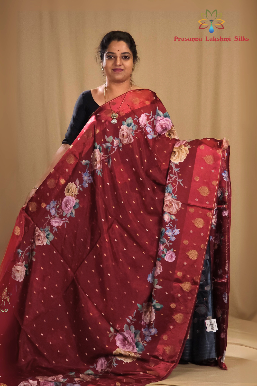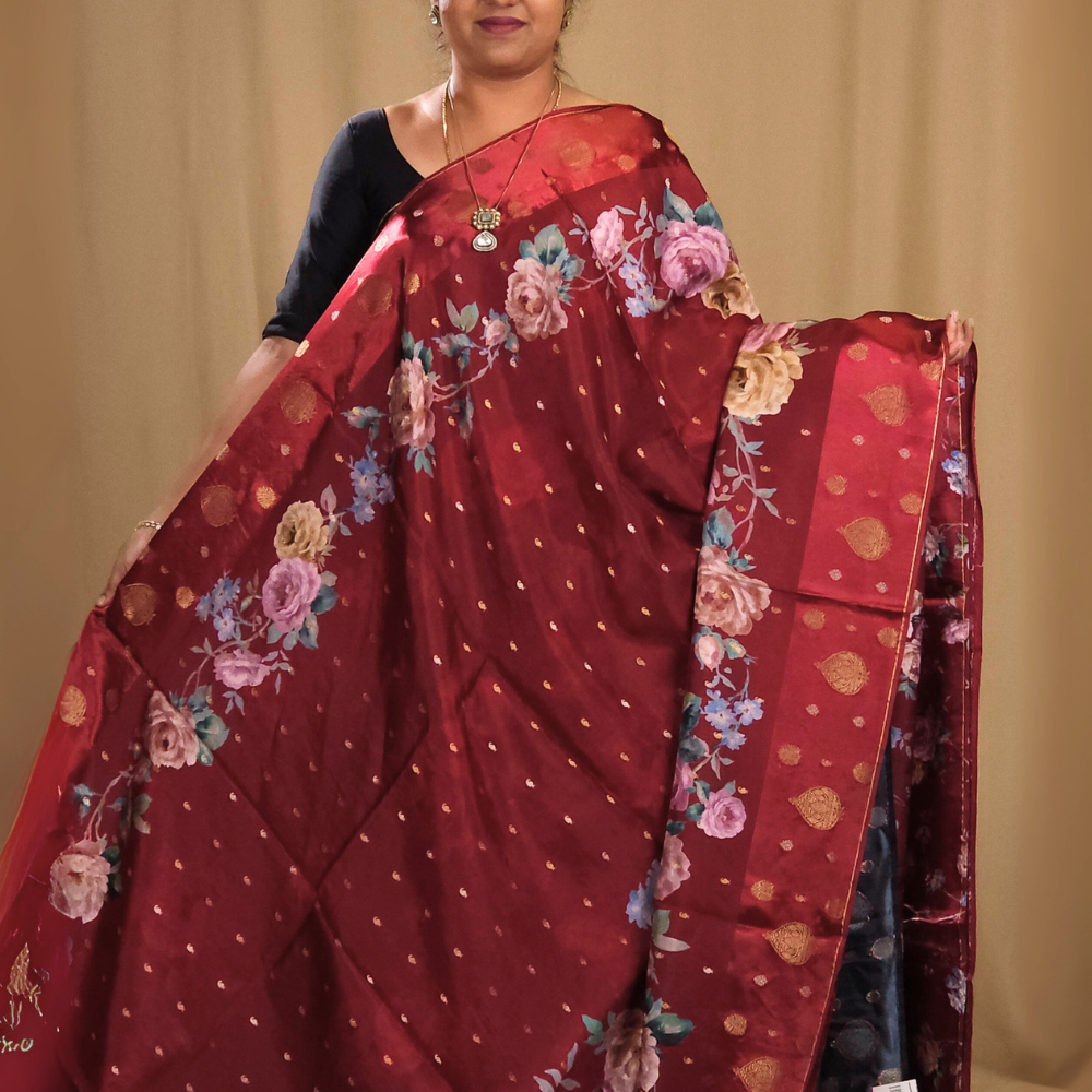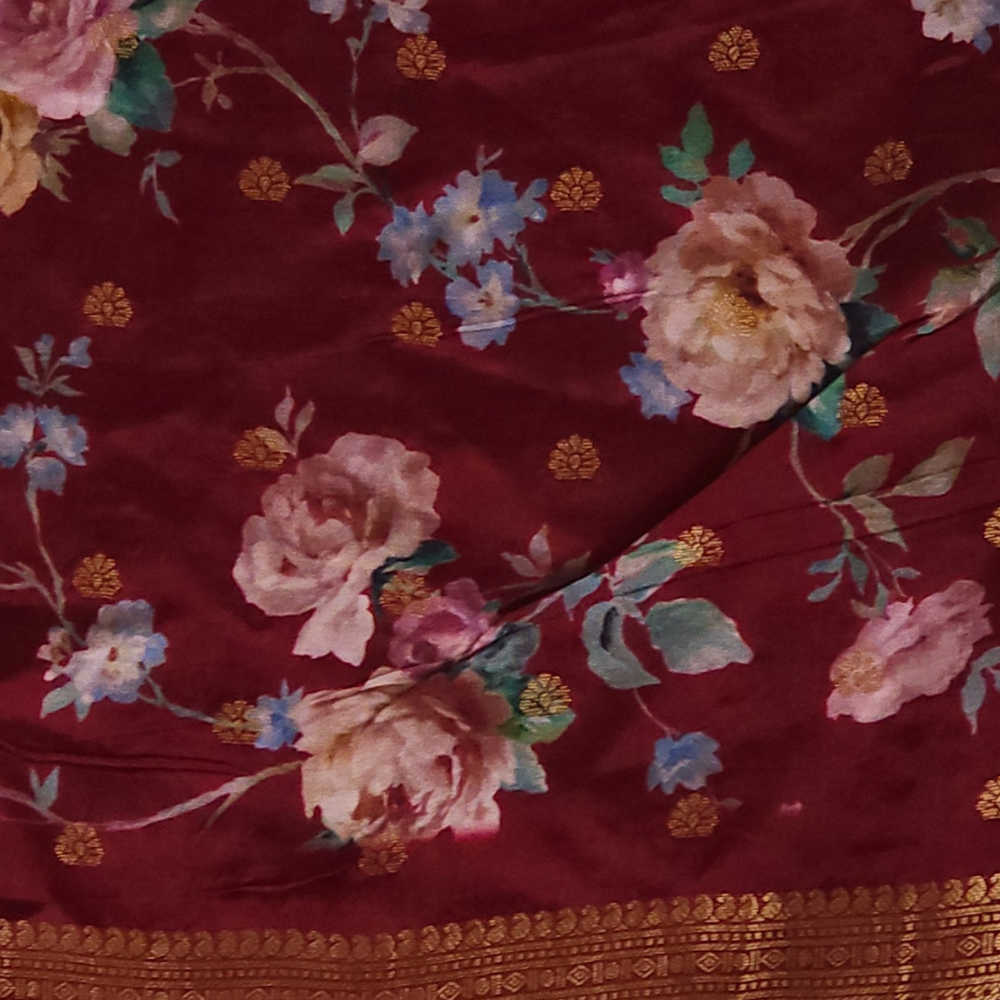 Elevate your style with our Banarasi Satin floral sarees with beautiful multicolor floral digital prints tiny zari woven mango motifs all over. The satin borders with gold and silver motifs make them look rich, and the zari pallu adds that festive charm. Paired with self floral digital blouse....