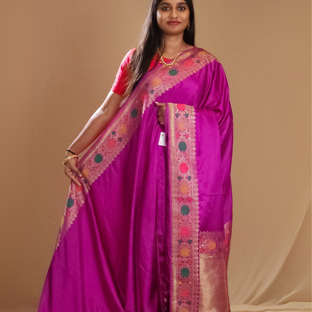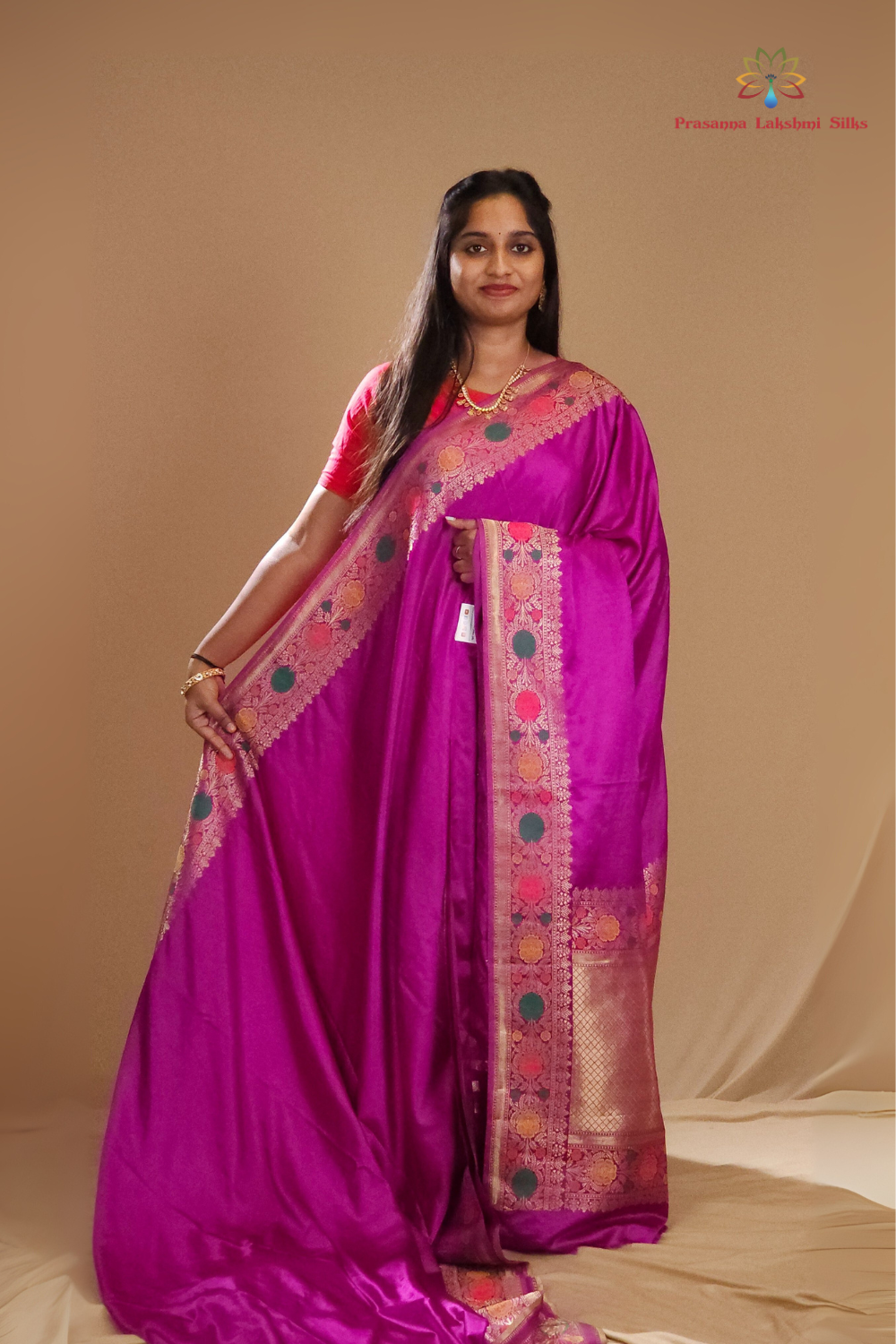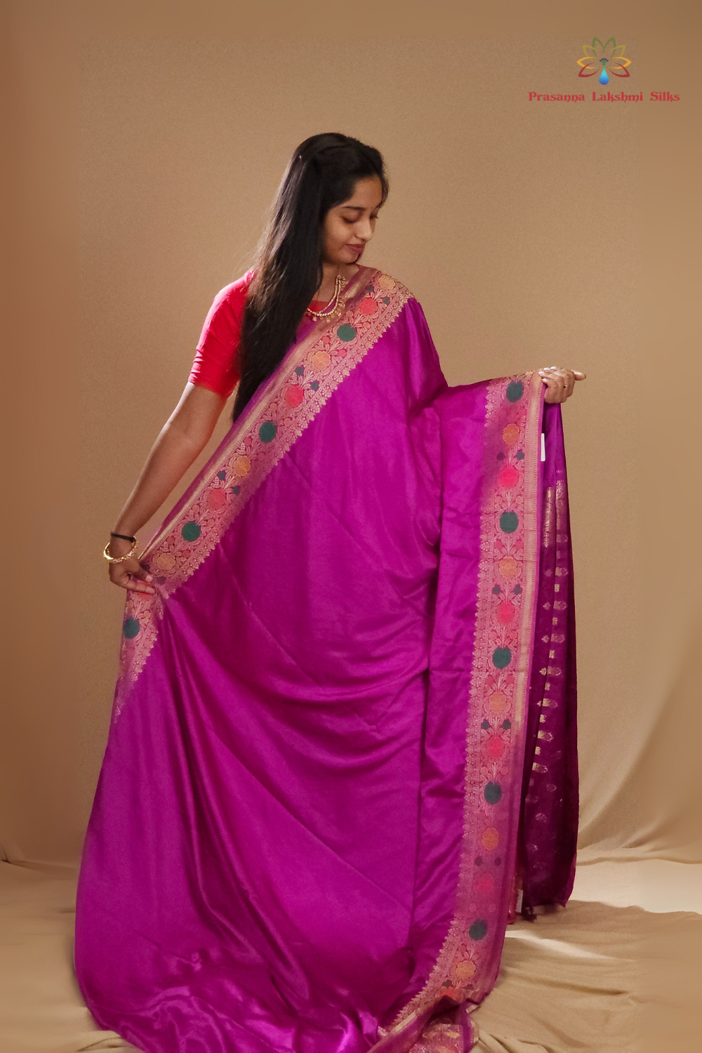 Elegant Satin Silk Saree with zari-woven floral borders with a meenakari touch, rich pallu, and self blouse with zari motifs. Perfect for festive and special occasions.