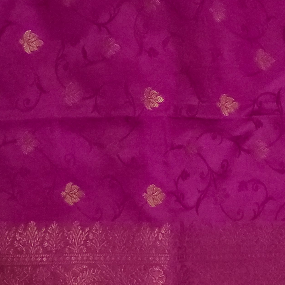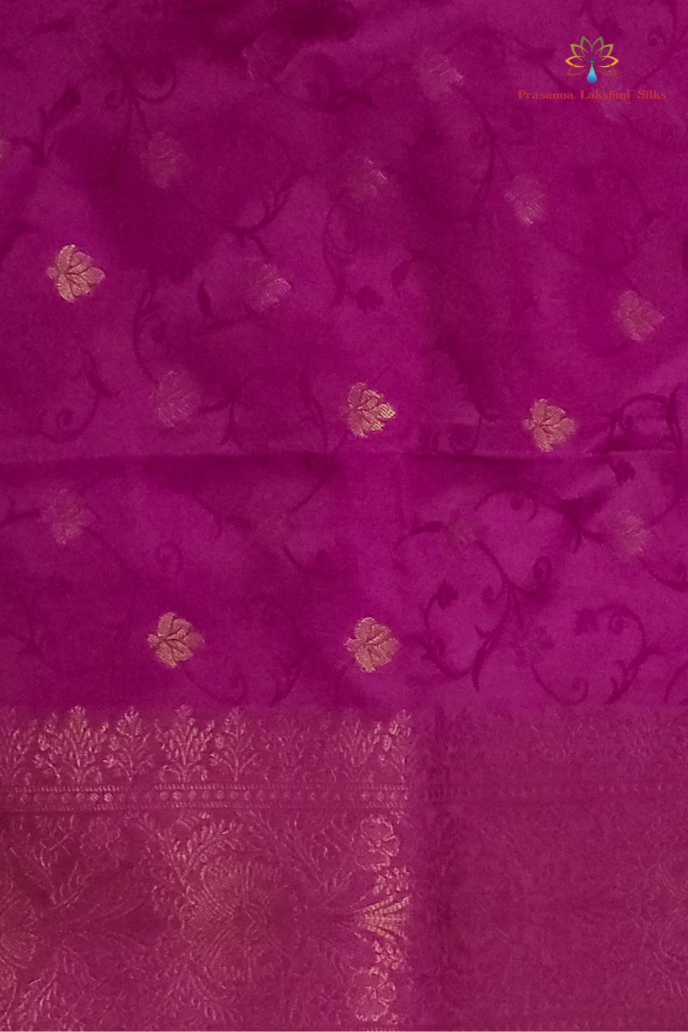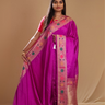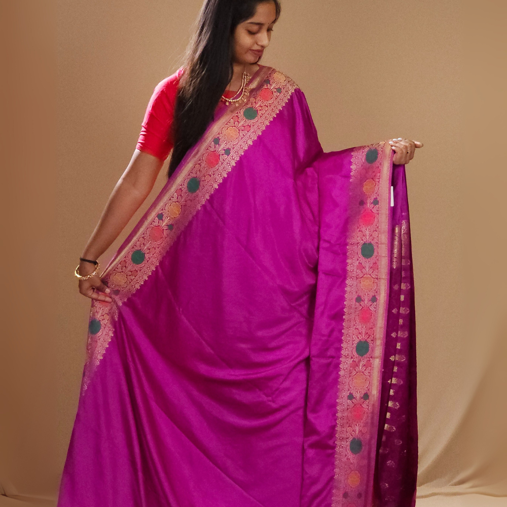 Elegant Satin Silk Saree with zari-woven floral borders with a meenakari touch, rich pallu, and self blouse with zari motifs. Perfect for festive and special occasions.