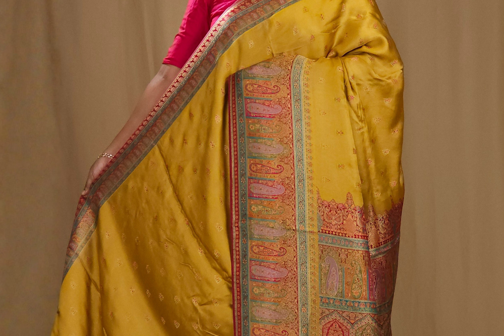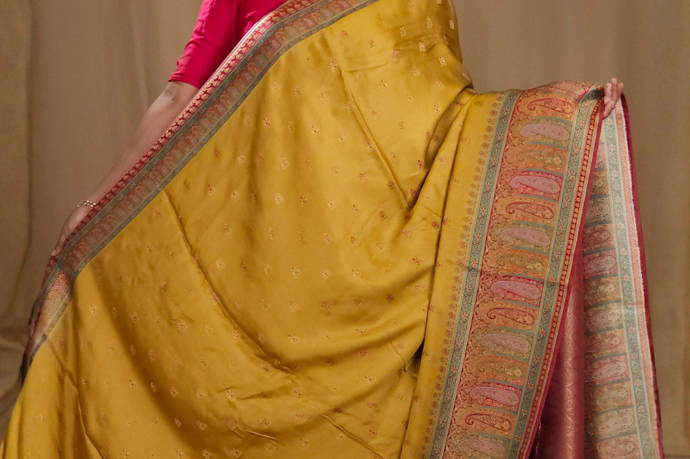 Mustard Yellow Pashmina Satin Saree