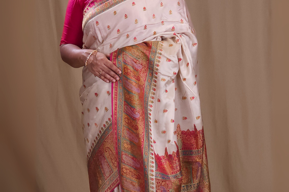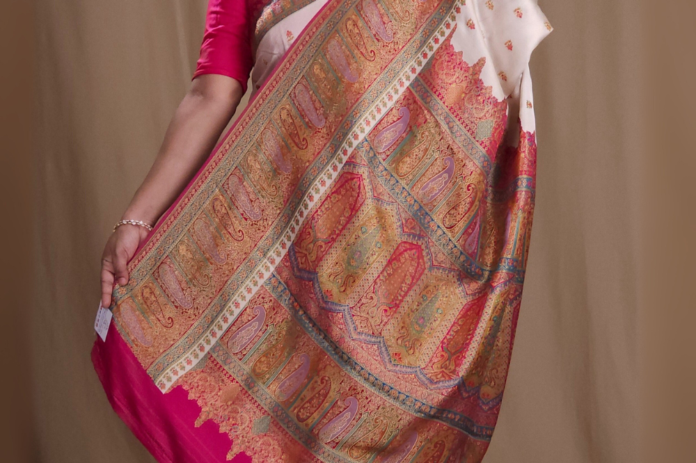 Cream Pashmina Satin Saree